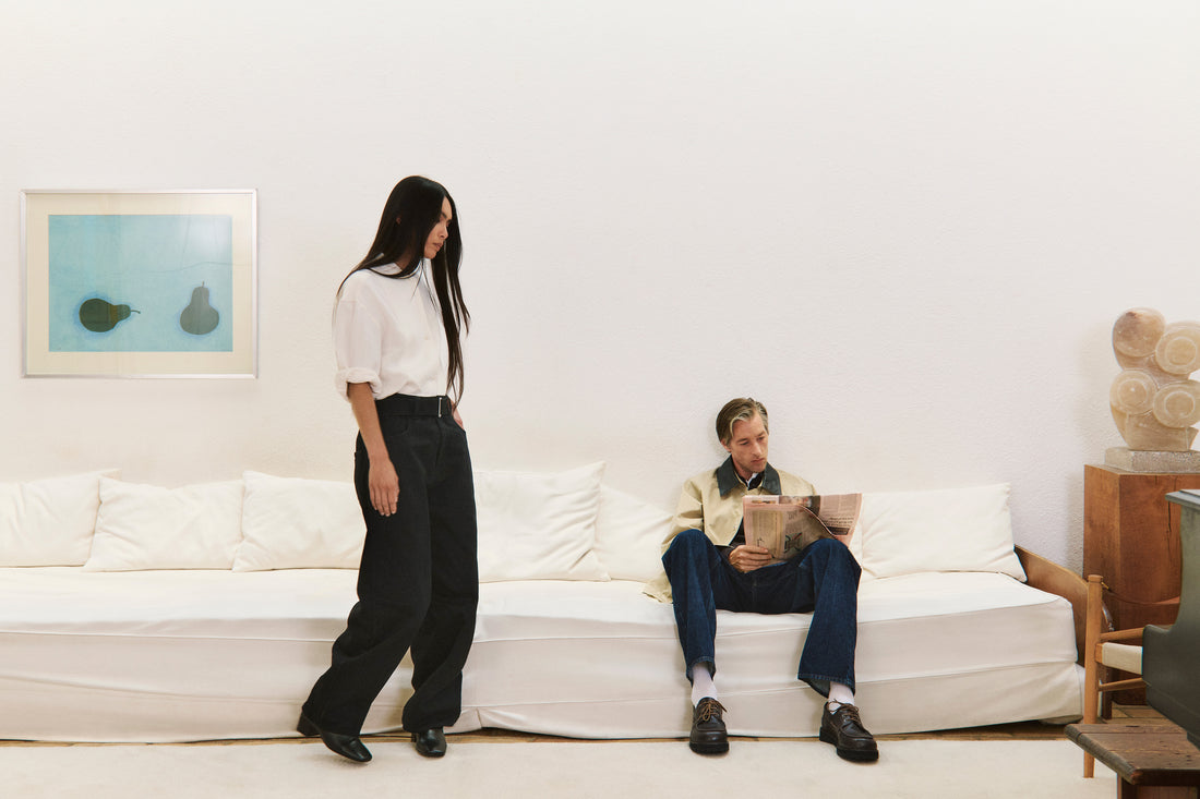 “We’re particularly excited by the new Marylebone jean,” observes Wakeman, of a new pant named in honour of the newly opened London store and available in both a rinsed indigo and raw black denim. “It’s unique in terms of shape as it has an extremely long rise - the zipper is 18cm - so it’s mega roomy in the crotch, but narrower in the leg, so it creates a super interesting silhouette.” In addition, the new District jacket and Seb pant, which can be worn as a set, are rendered in a glorious wrinkled Japanese denim.