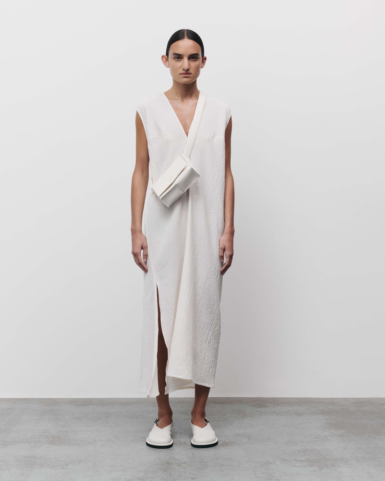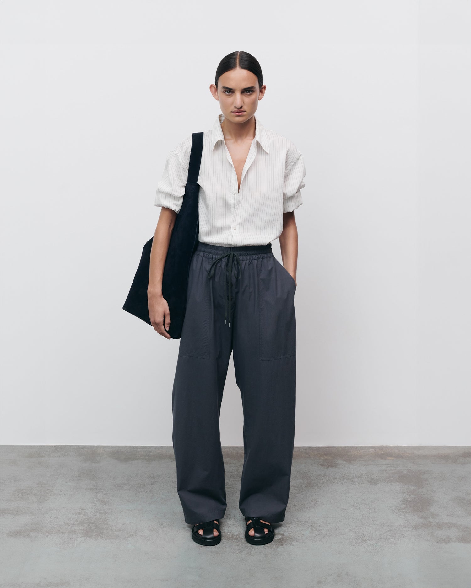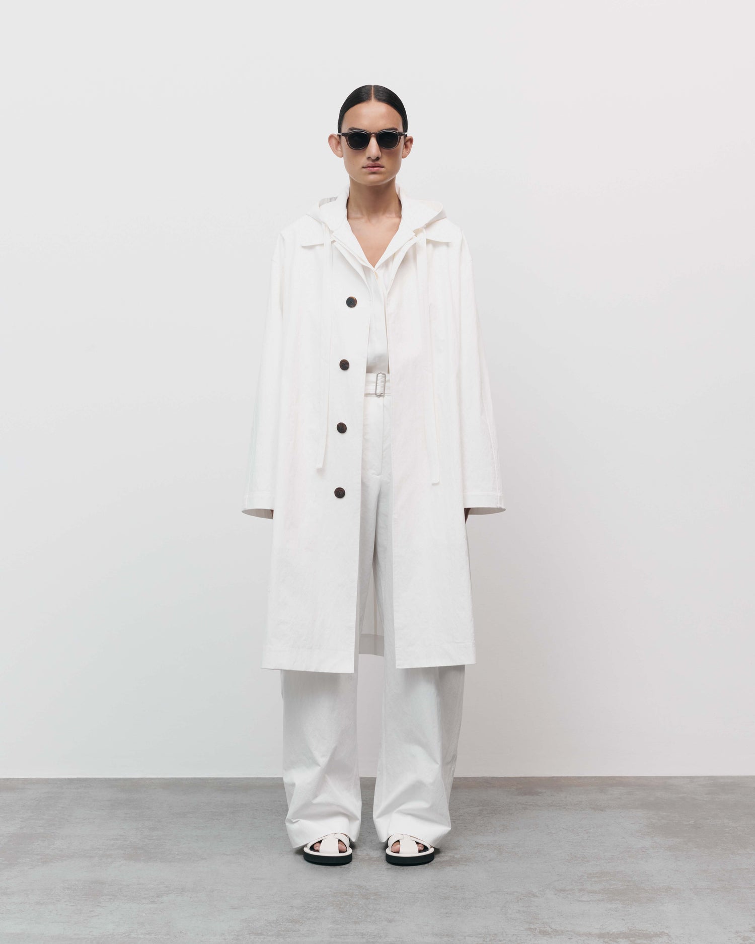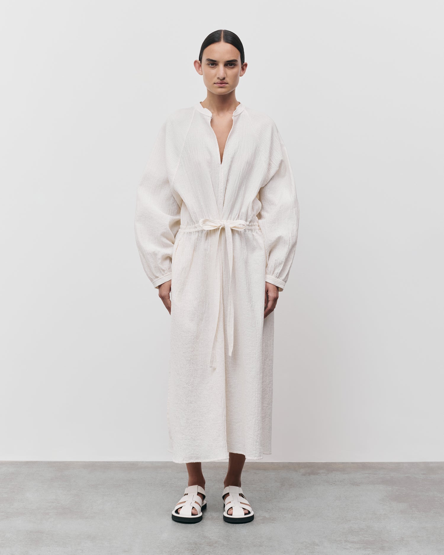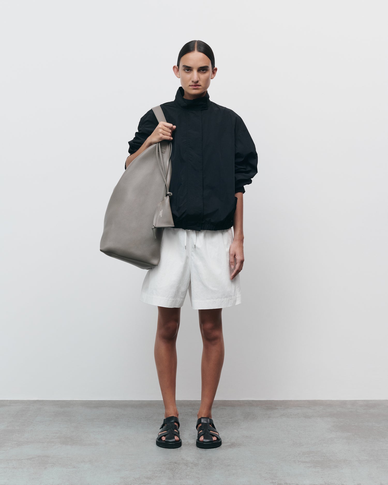 Frayed hems, drawstring waistbands, lightweight Harrington jackets, long sundresses, roomy short-shorts and gauzy shirts all play central roles in this new collection. The graphic restraint of monochromatic looks is offset with inviting textures, and a typically considered silhouette that is also supple and generous.