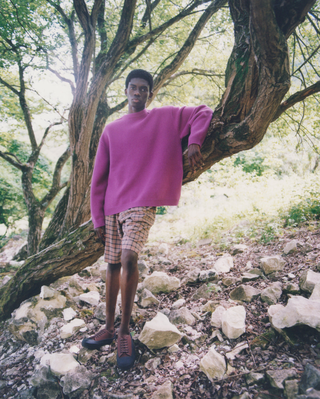 Lupin pink flashes of superfine lambswool through the knits guarantee a playful spritz, with the Hemyl Guernsey Sweater, the Sen Cardigan and the extra-long Miles scarf finishing off the relaxed (but deliberate) subcultural jumble of Uptown Raver styling.