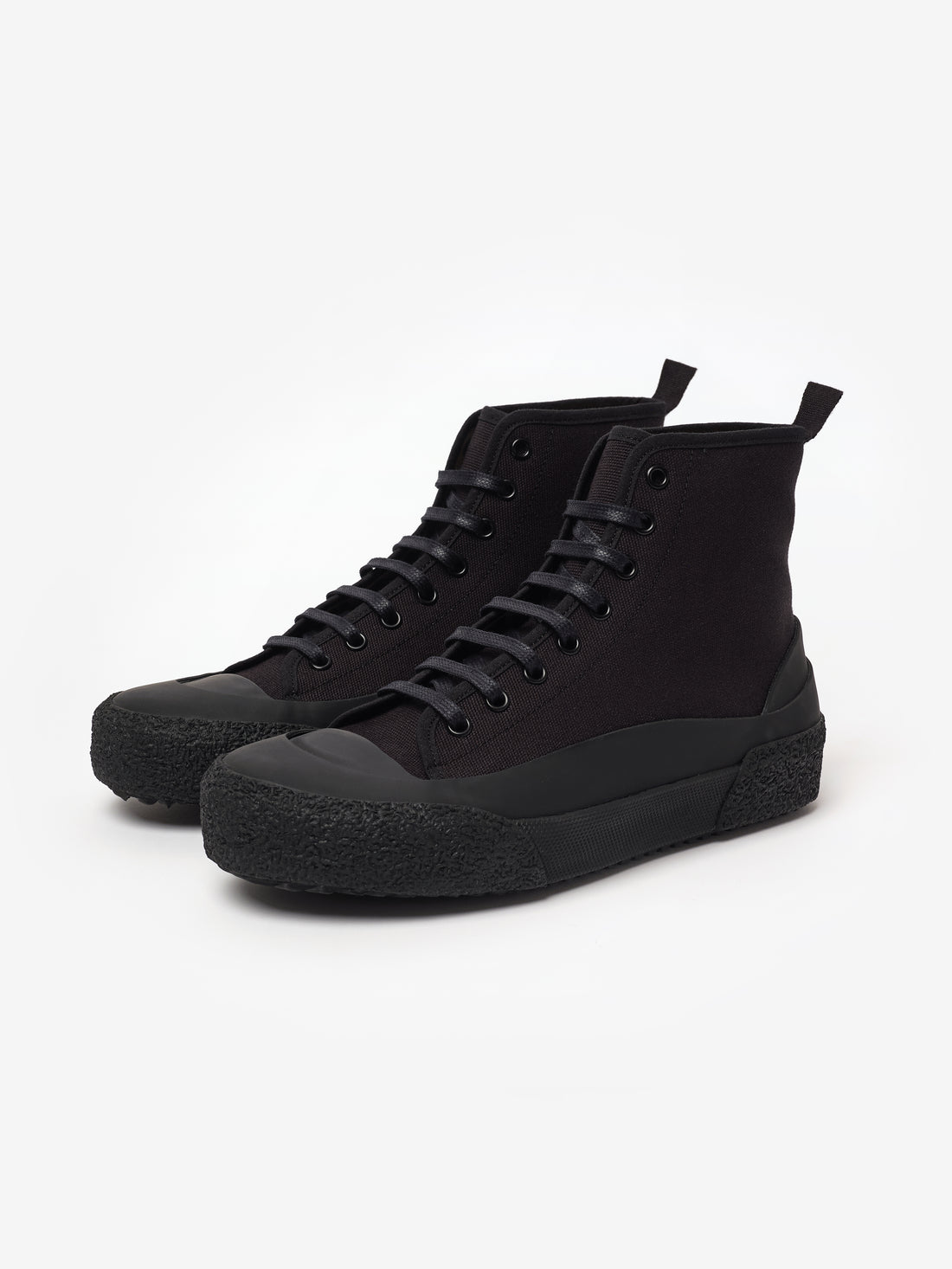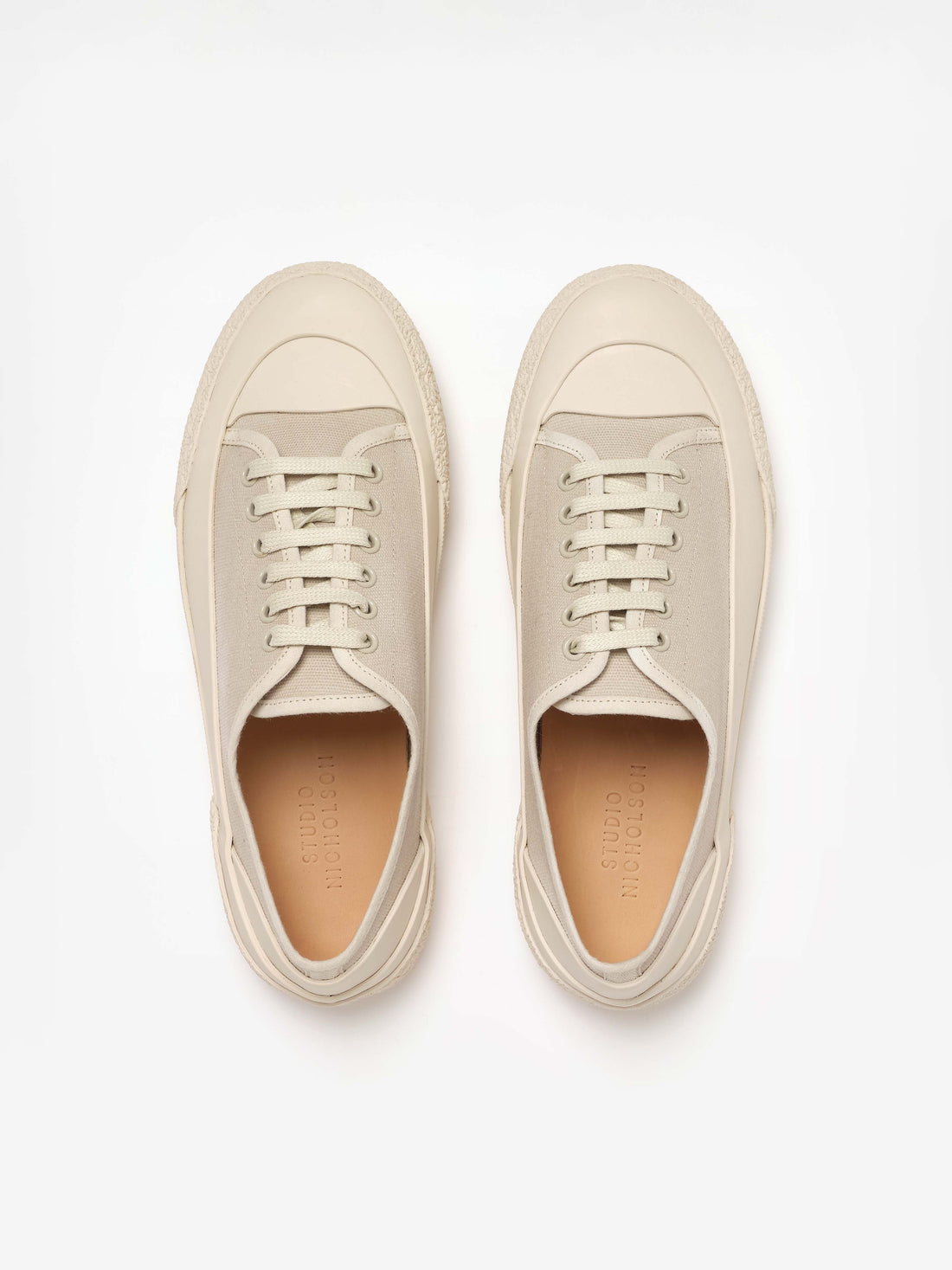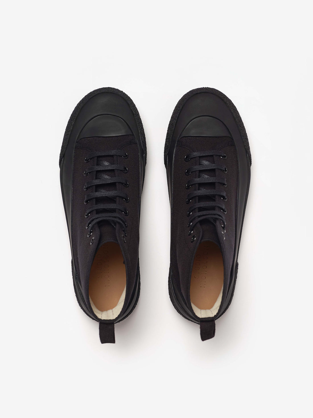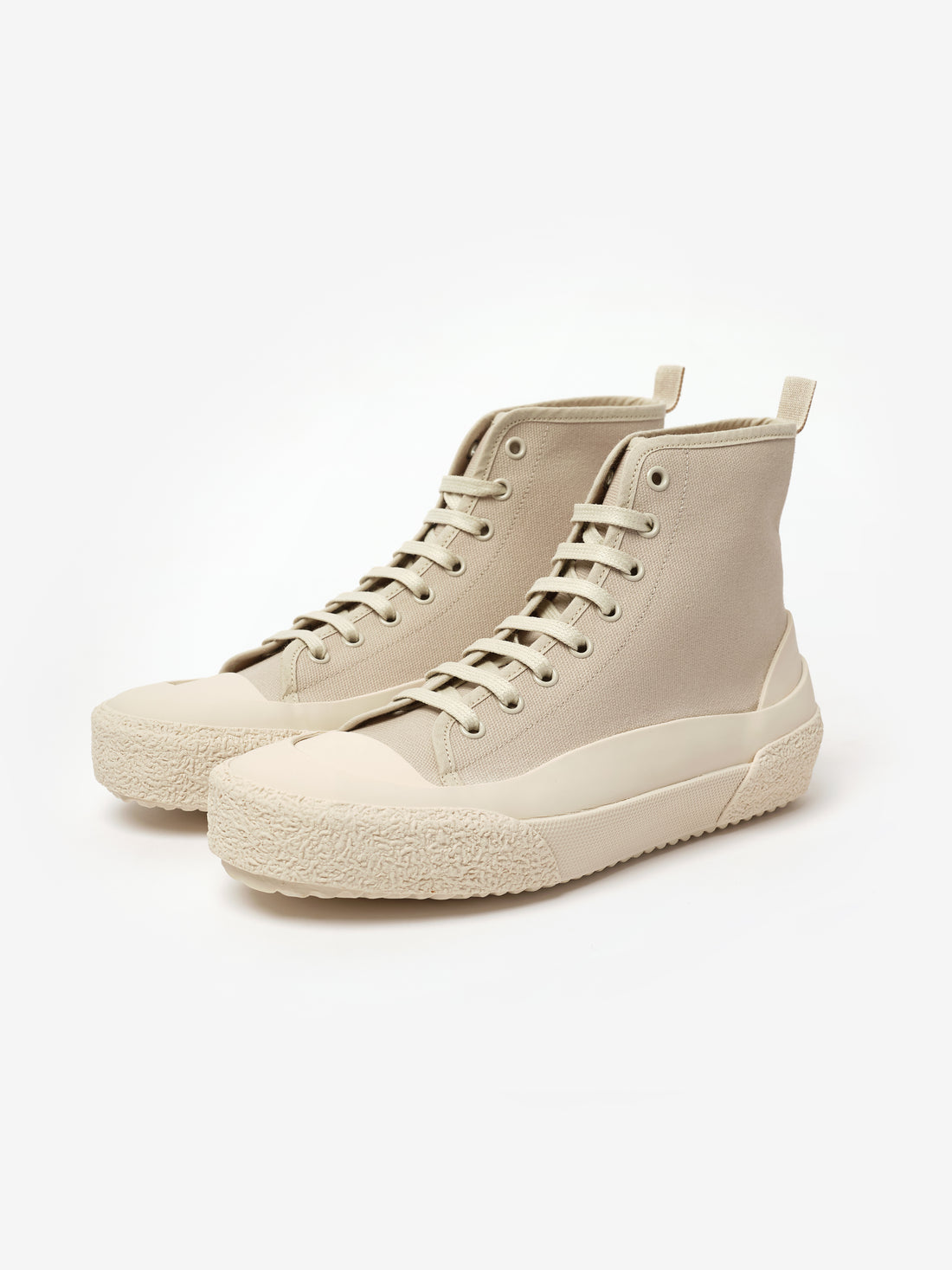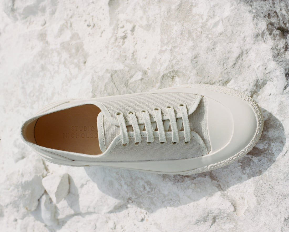 That JND (just noticeable difference) is what differentiates the new Studio Nicholson Sharp and Numbers canvas shoes from your average plimsoll. Originally, plimsolls were developed back in the 1830s for wearing on the beach - these versions are quite the opposite. Seriously robust, they’re engineered from a cotton canvas so densely woven and strong, that they are fit for purpose; even when the weather turns rotten. Not to mention the layers (and layers) of vulcanised natural rubber - all applied by hand in Spain, by a small factory known for producing some of the world’s finest canvas shoes.
