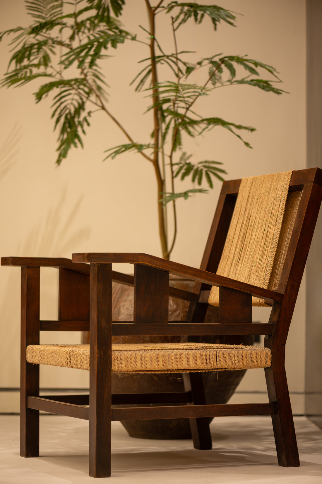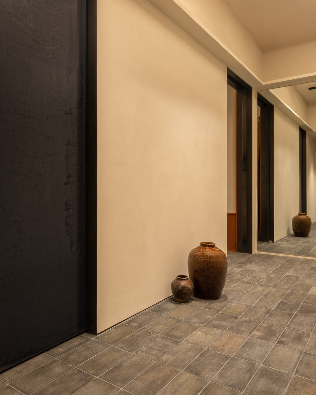 Slate tiles continue through a concealed corridor into two fitting rooms, where pale linen sofas rest on reclaimed wooden beams. The walls are outlined with beading crafted from the same natural cherry wood, offering a refined nod to Chinese interiors.