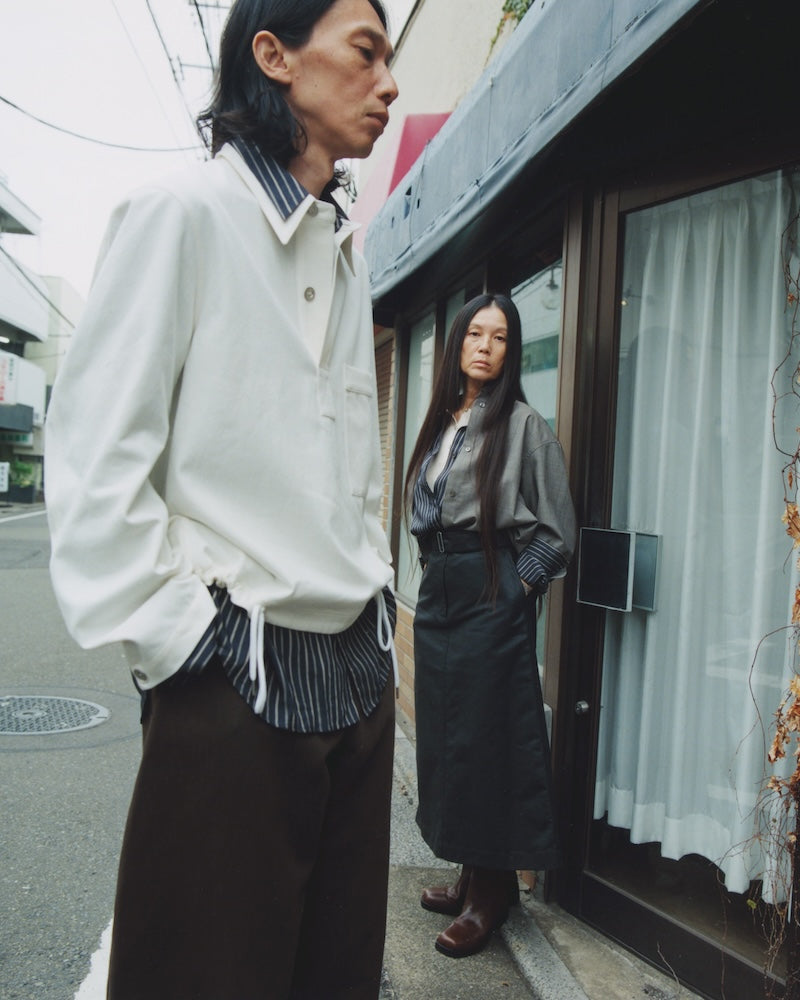 Discussion around a collaboration between their two brands has been longstanding - Harris has worn Studio Nicholson as part of her personal uniform since the brand launched in 2010 whilst Perfumer H candles have long fragranced Studio Nicholson’s stores. Both are stirred by the senses; Harris smells everyone and everything - “I imagine Lyn up a mountain in China smelling the ground,” smiles Wakeman. Meanwhile, Wakeman has always favoured haptic fabrications which might sound crunchy in movement or feel like paper or marble to touch.