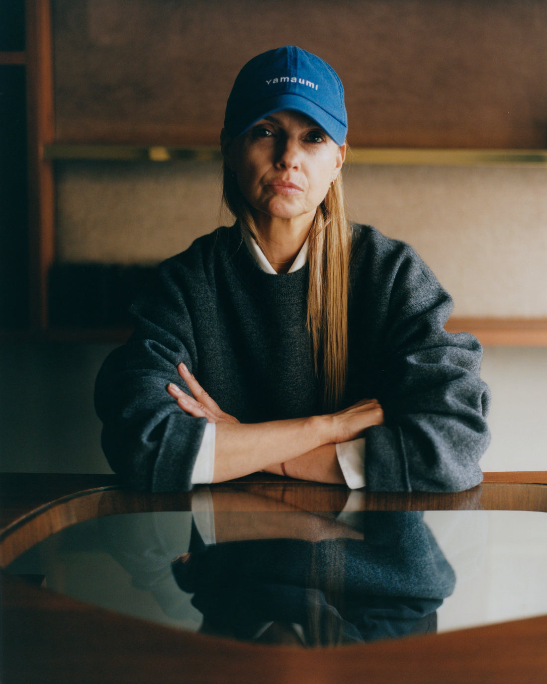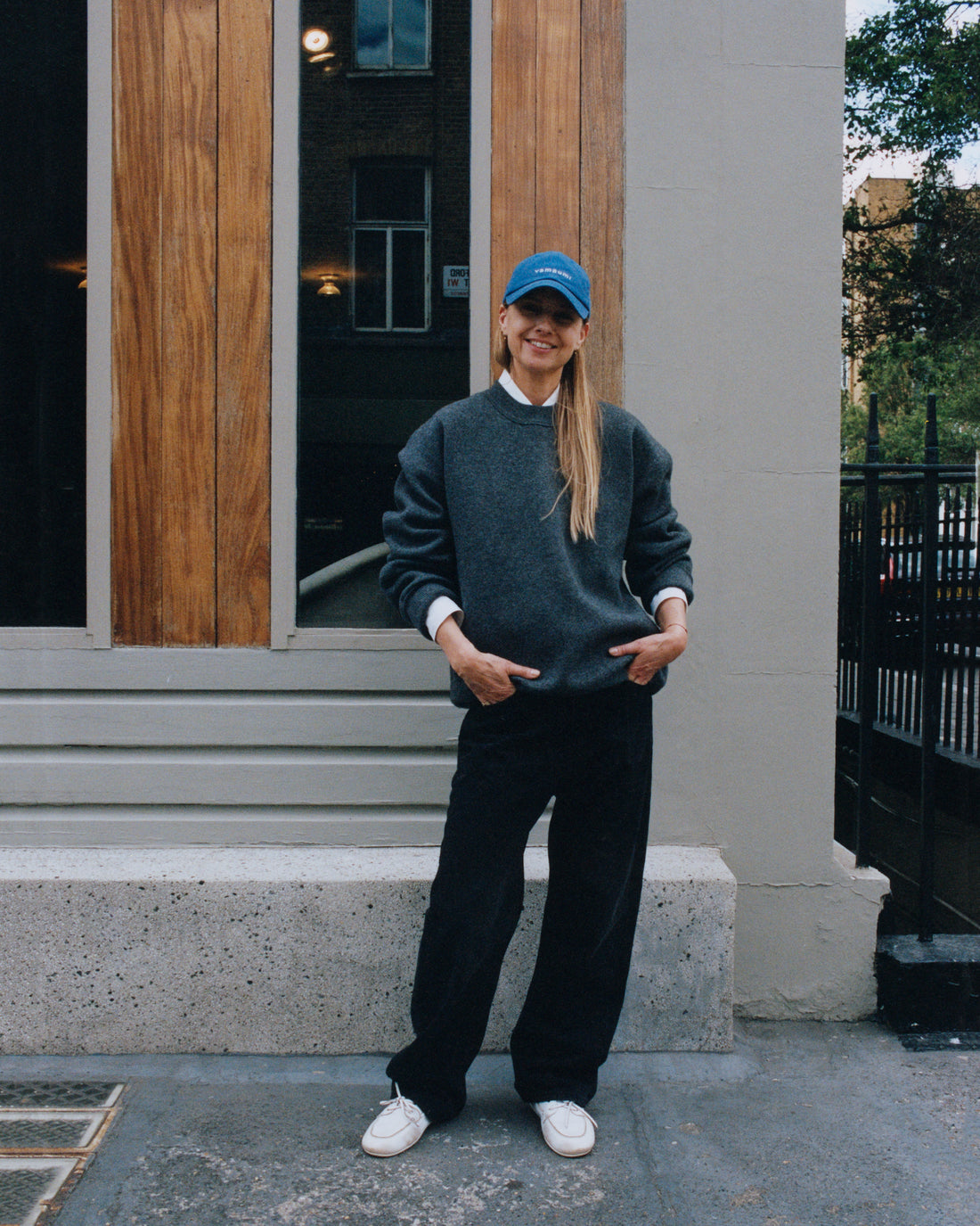She is wearing Denjo Denim Pant in Black, Moray Cashmere Double Sweatshirt in Charcoal Marl, and Leto Shirt in White, all by Studio Nicholson. Cap, sneakers and jewellery, Lyn’s own.