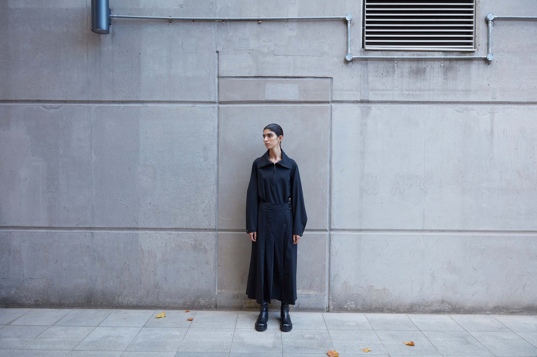 Cinched-in waistlines counterbalance the deliberate angles of super sculptural outerwear. Serious separates amplify the playfulness but maintain a powerful attitude. Polished rebellion welcomes the playfulness of industrial strength exposed zips on durable pencil skirts in dry wool twill. Soft brushed Italian cotton shirts in popstar plaid are tucked into neat, slender pants that pool at the ankle.