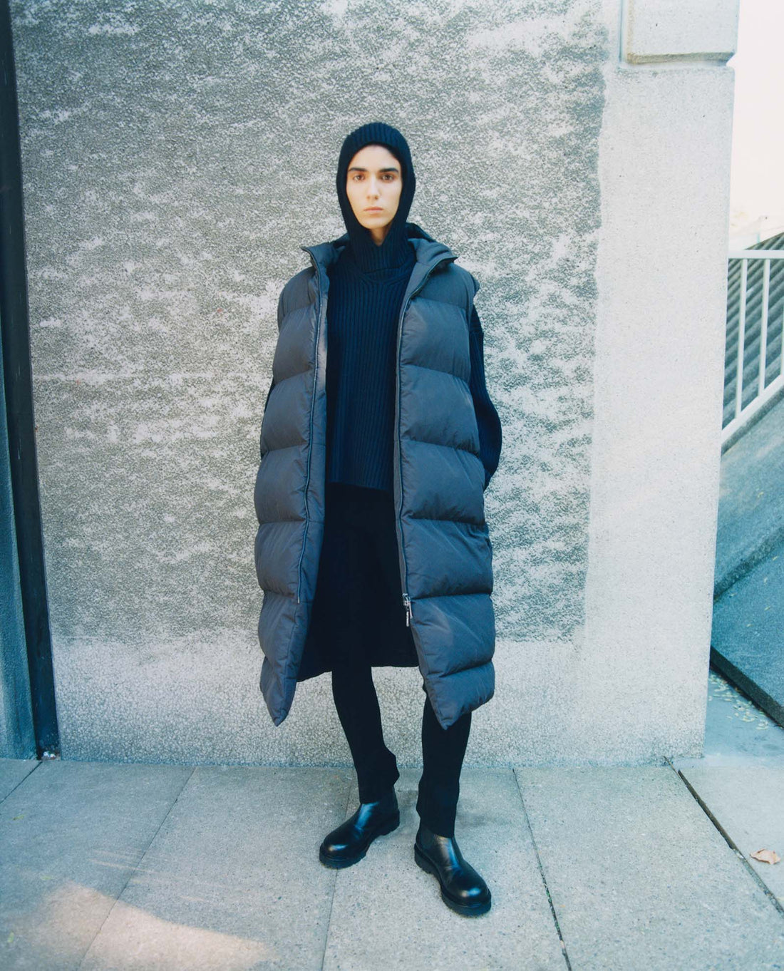Knitted accessories flood the collection and turn their back on the mainstream punctuation approach by becoming crucial jigsaw pieces for every outfit. Wool leggings are ribbed to accentuate the calves and split open at the ends, sitting on top of footwear, instead of inside it. Gloves are lengthened, knitwear snood hoods feel part space-race, part relay-race. Eco-down blasts out maximum volume with dramatic recycled nylon jackets designed with generous collars that roll up or down for attention. Colour feels filmic, poignant, renegade and rule-free. Active meets archive in full-time hero modules made for a technicolour society. It’s a modular multiple-choice buffet, intelligently refined for the headstrong Studio Nicholson woman.