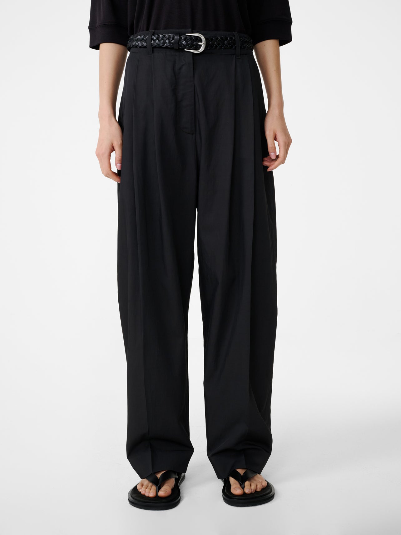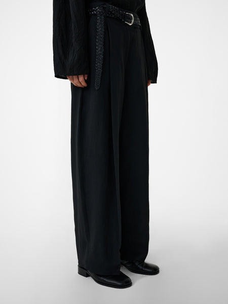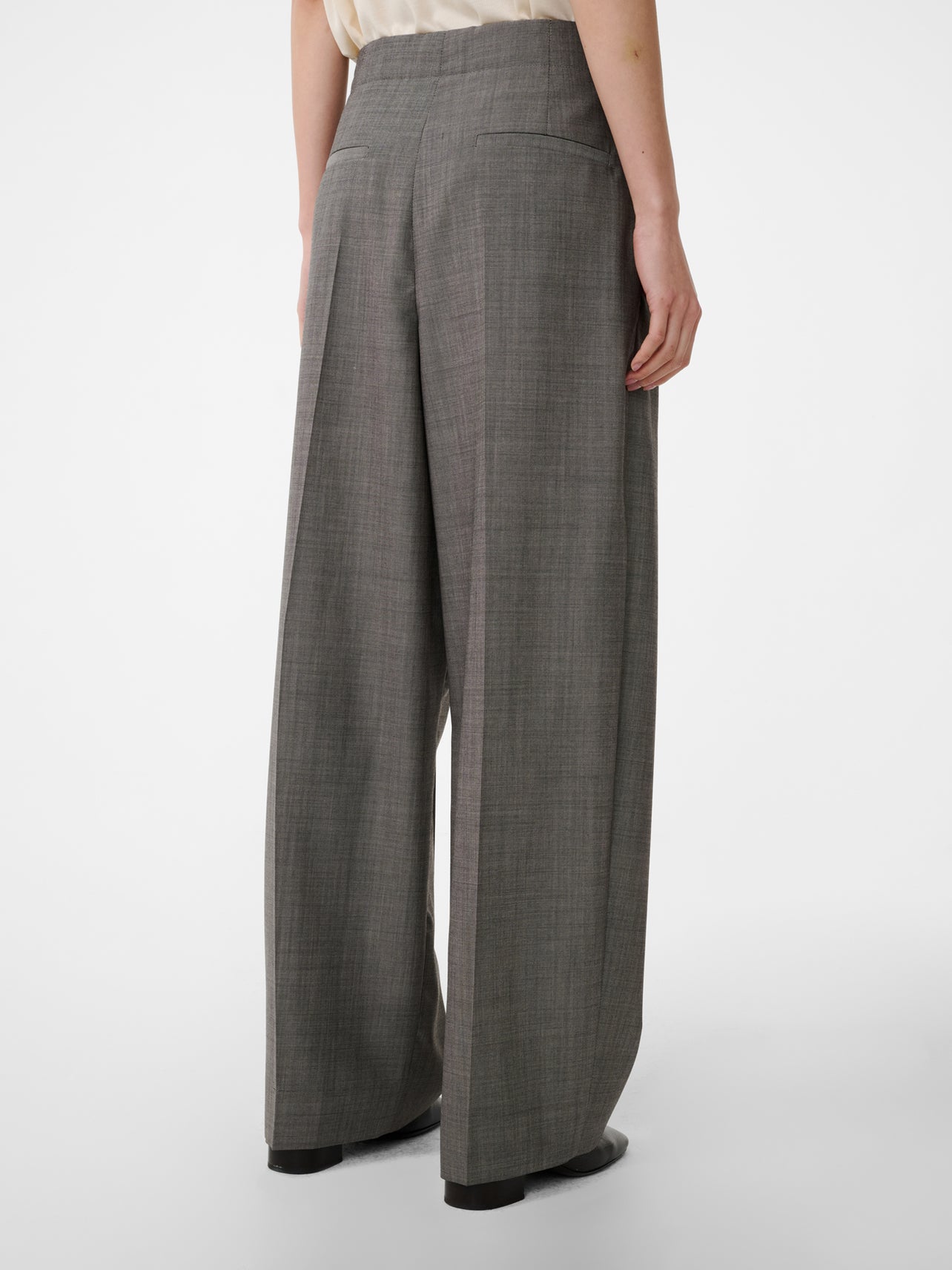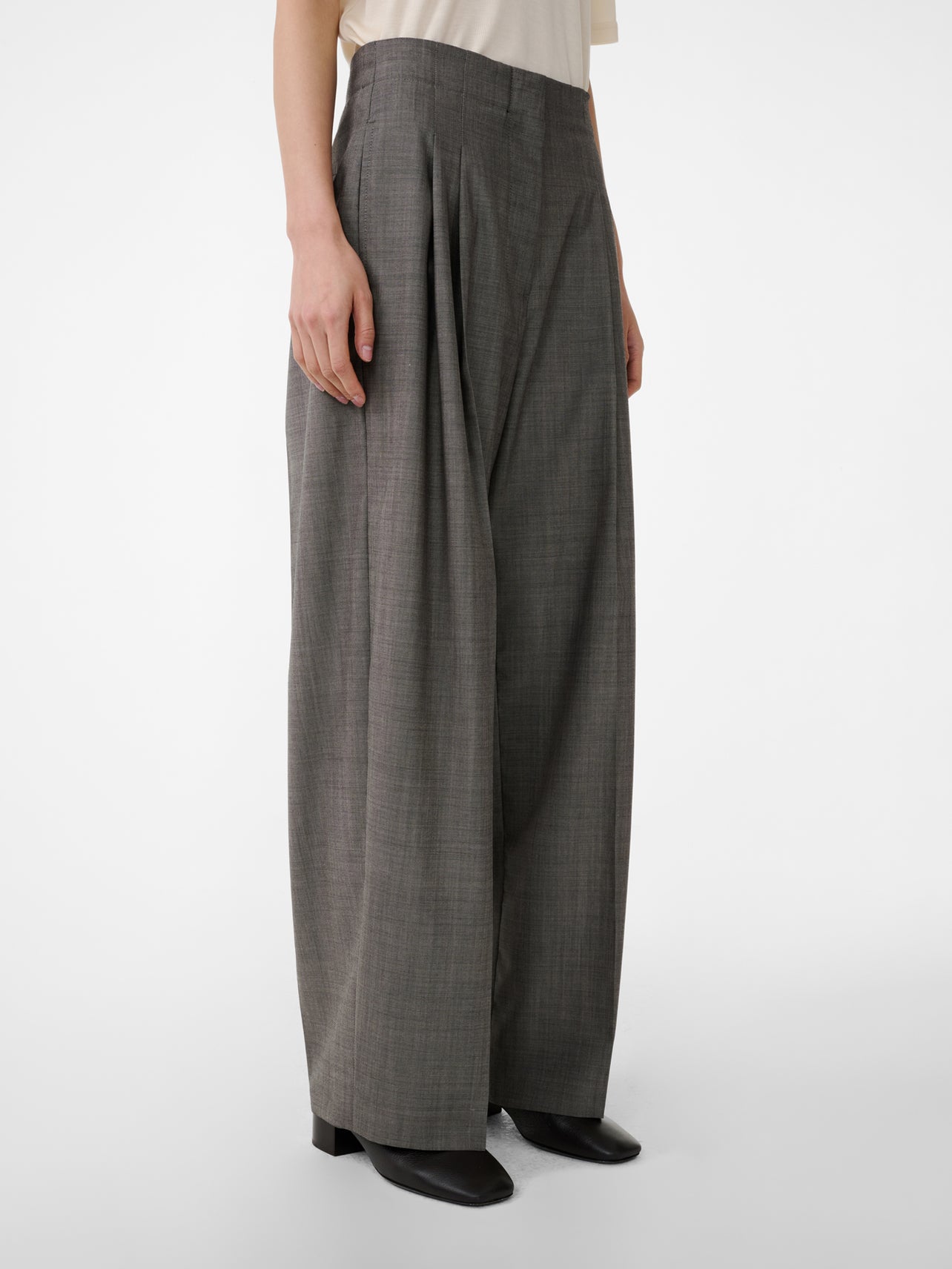The Acuna pants combine a high rise with a wide, flowing leg. Double pleats add further volume around the hips, while a slightly elongated length allows the fabric to fold and pool.