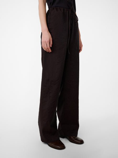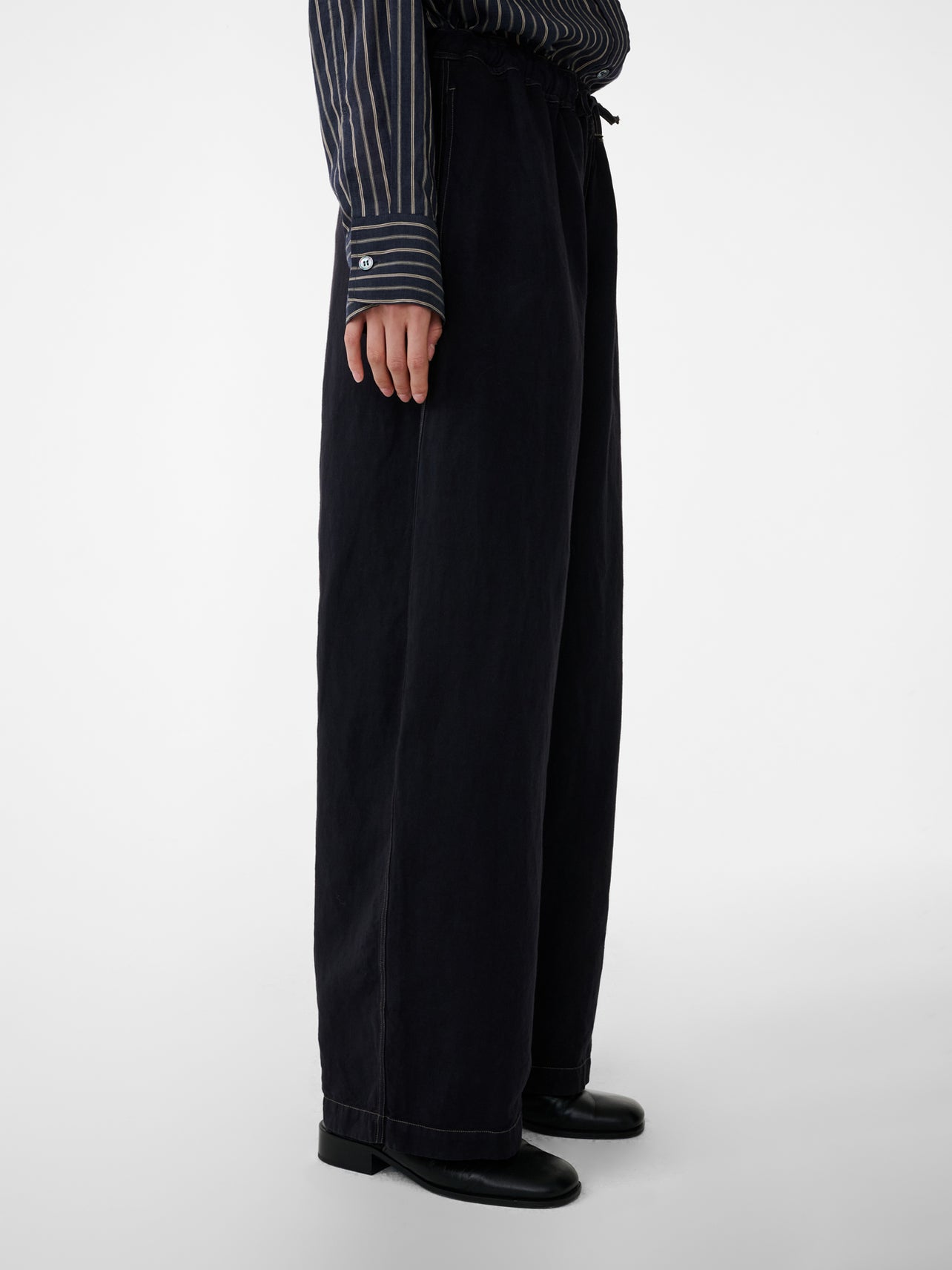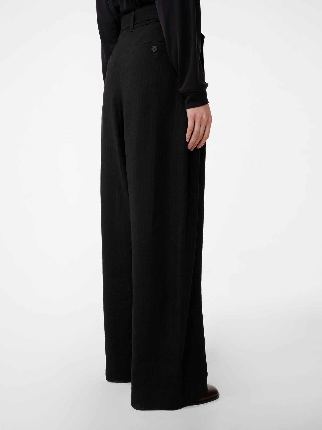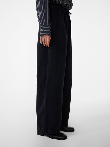 The Acuna pants combine a high rise with a wide, flowing leg. Double pleats add further volume around the hips, while a slightly elongated length allows the fabric to fold and pool.