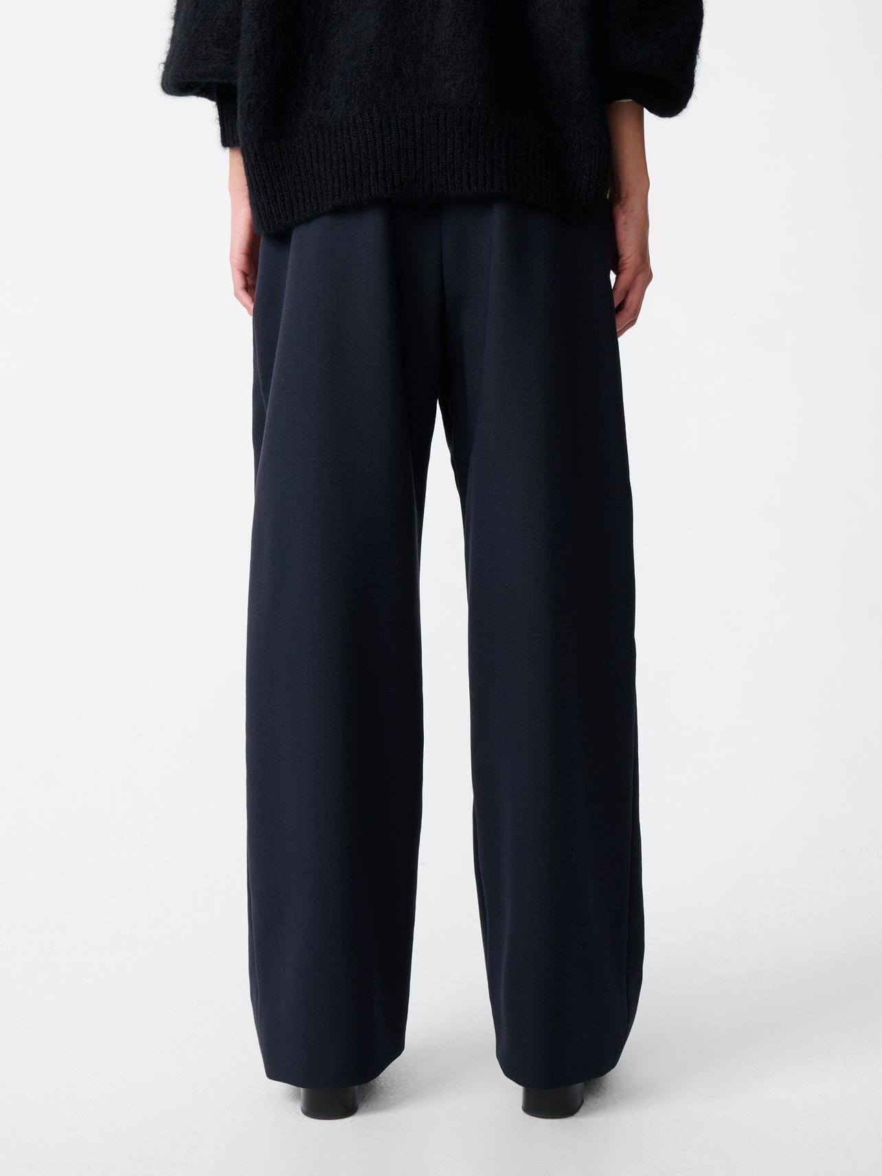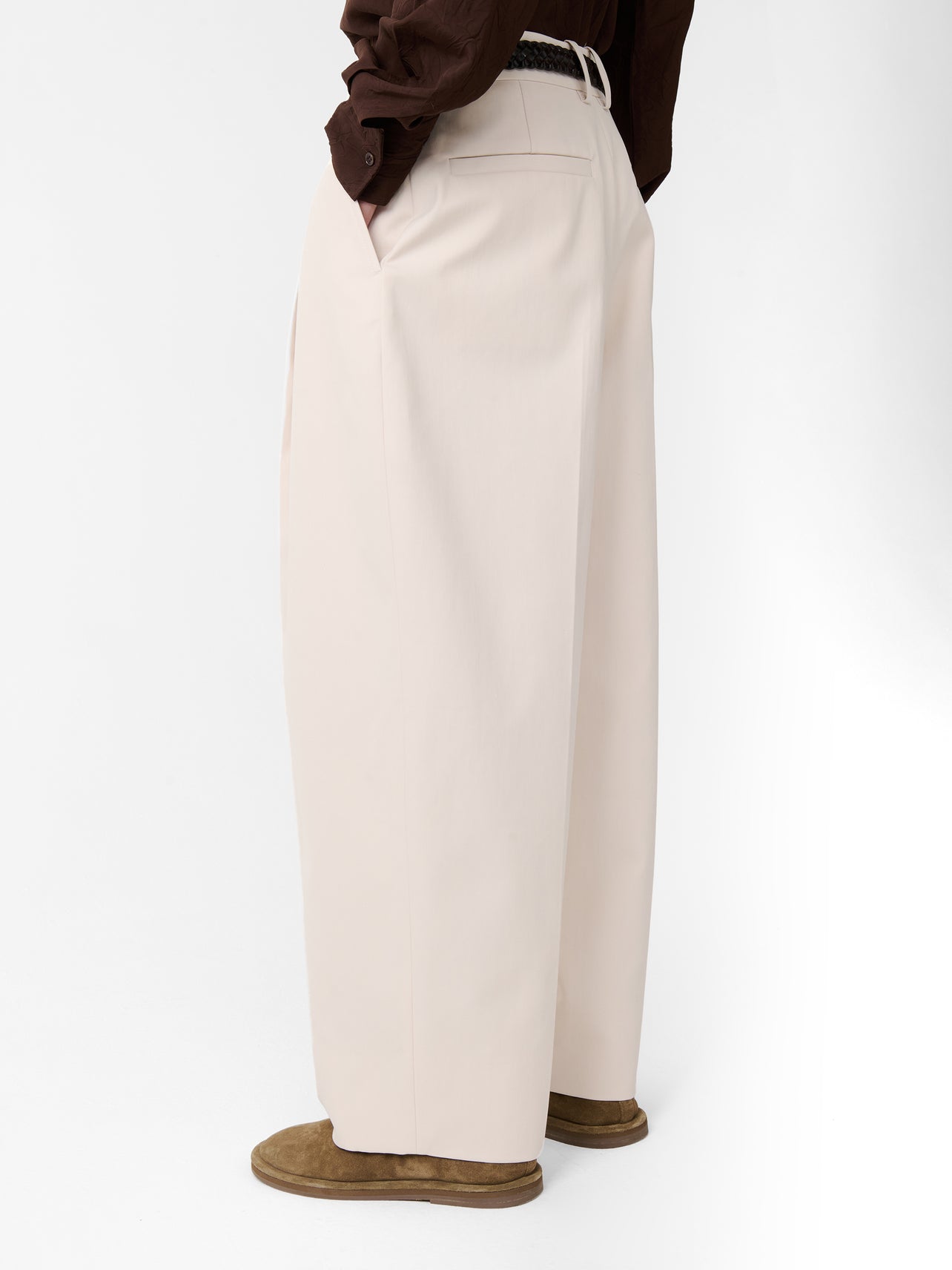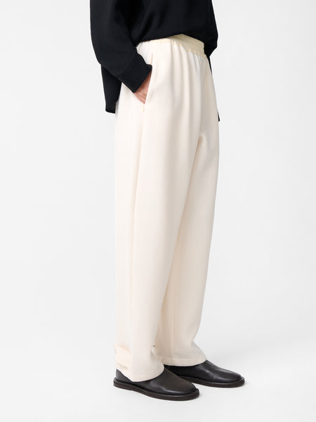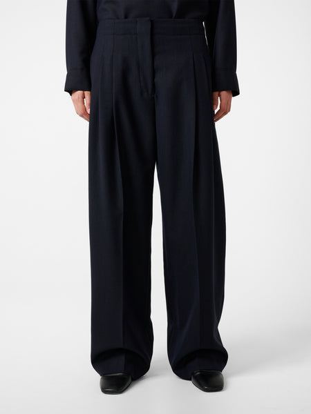 The Acuna pants combine a high rise with a wide, flowing leg. Double pleats add further volume around the hips, while a slightly elongated length allows the fabric to fold and pool.