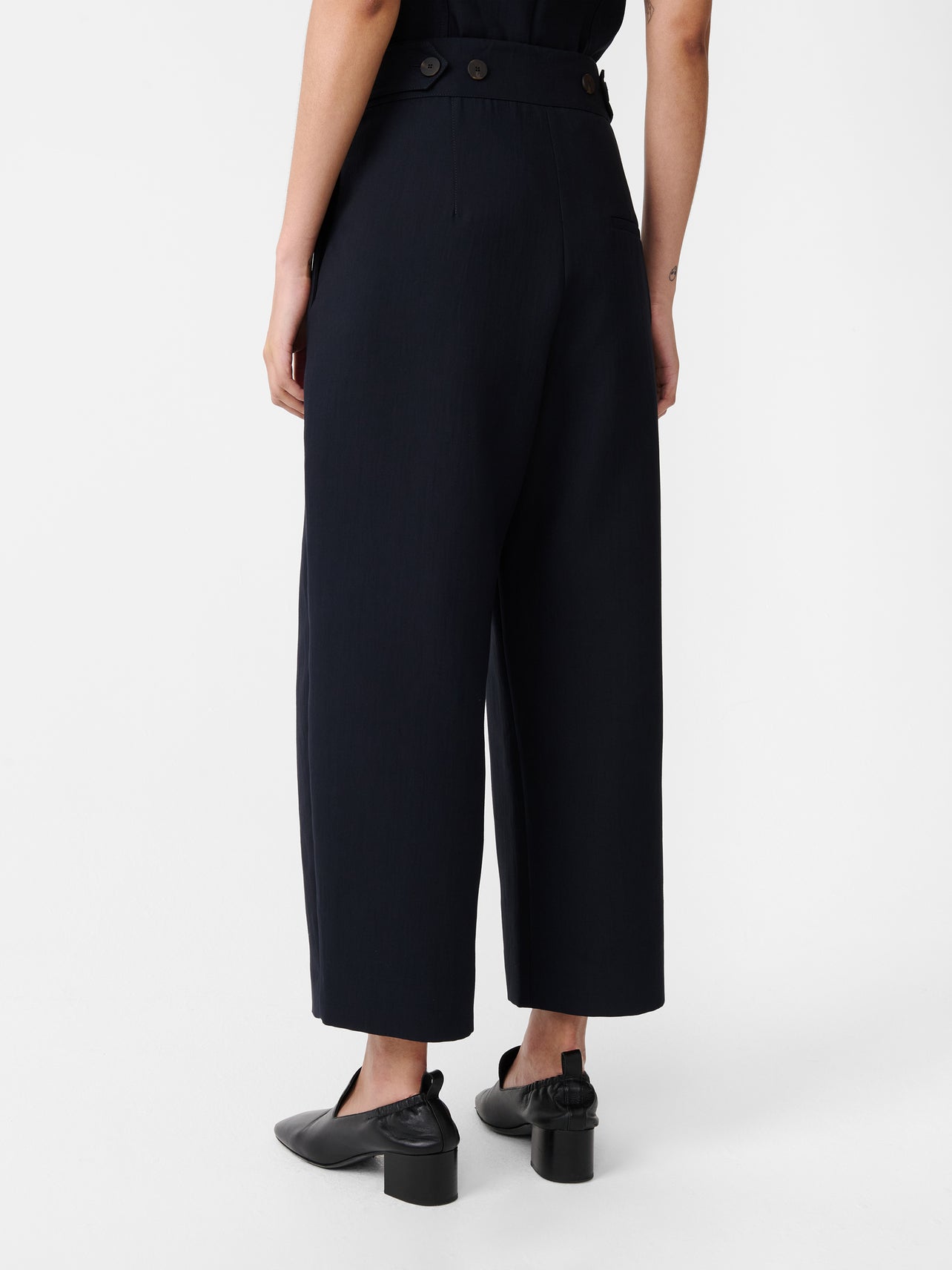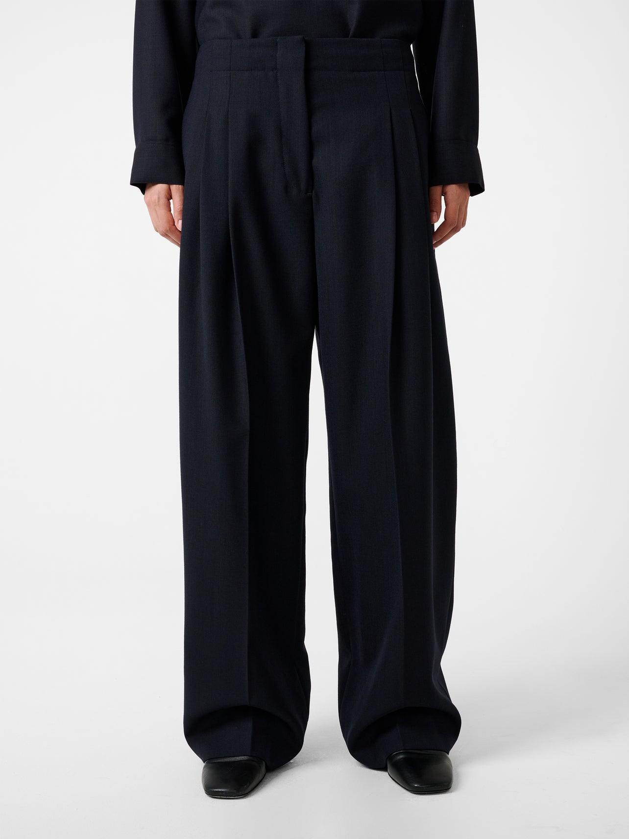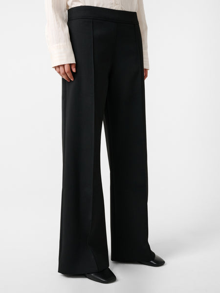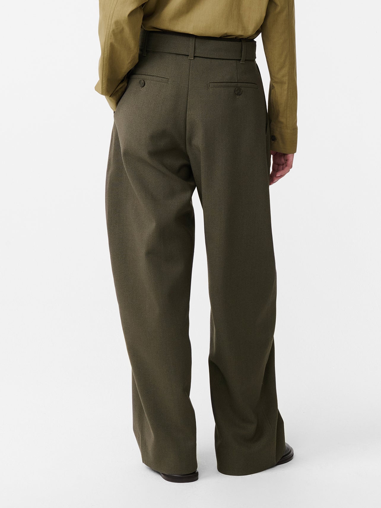 The Acuna pants combine a high rise with a wide, flowing leg. Double pleats add further volume around the hips, while a slightly elongated length allows the fabric to fold and pool.