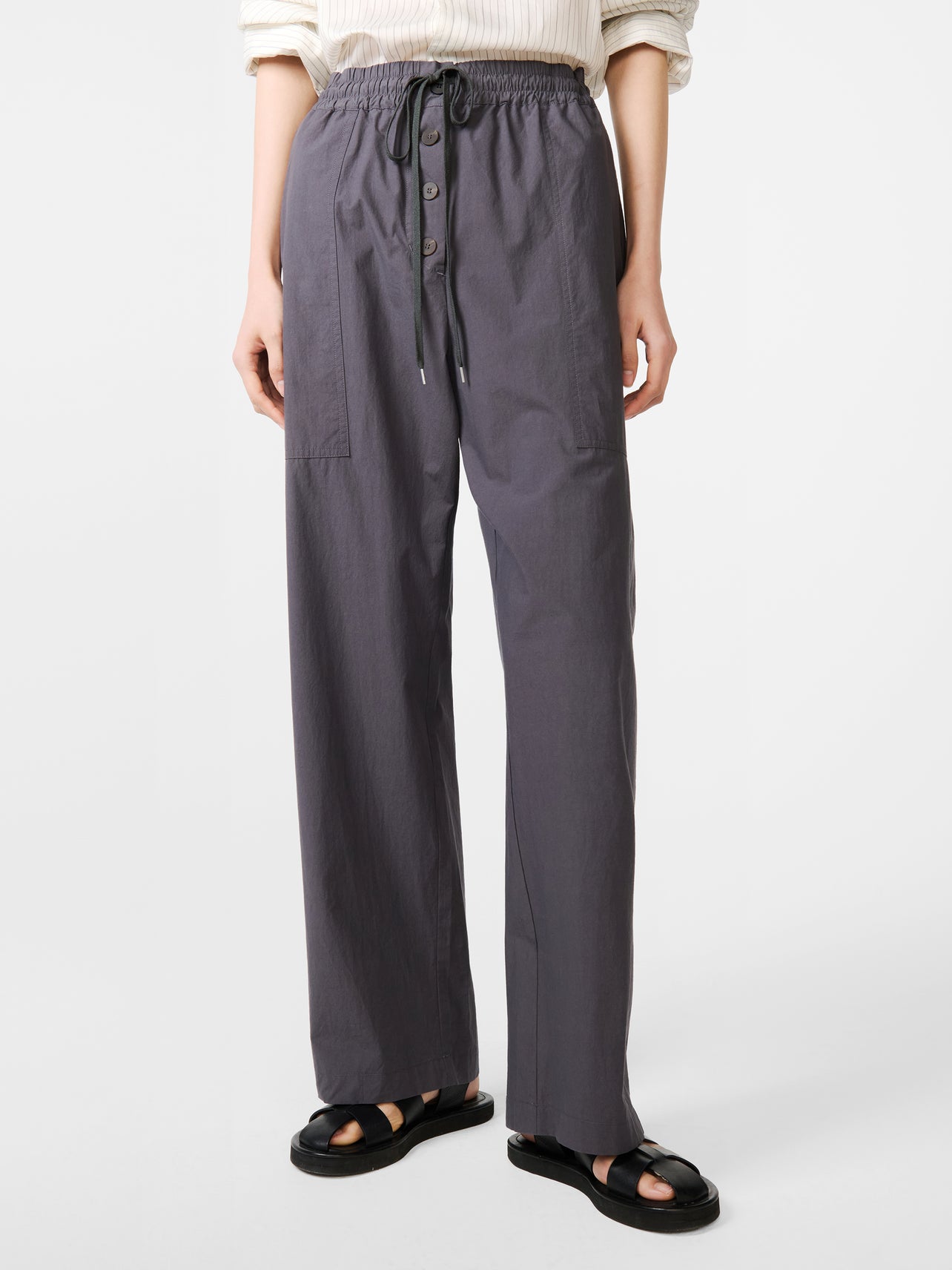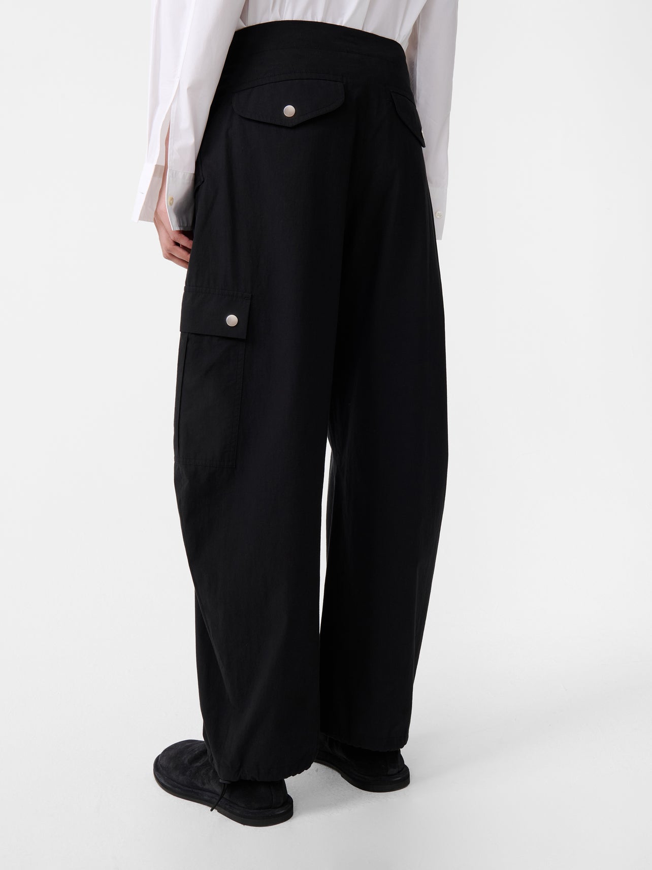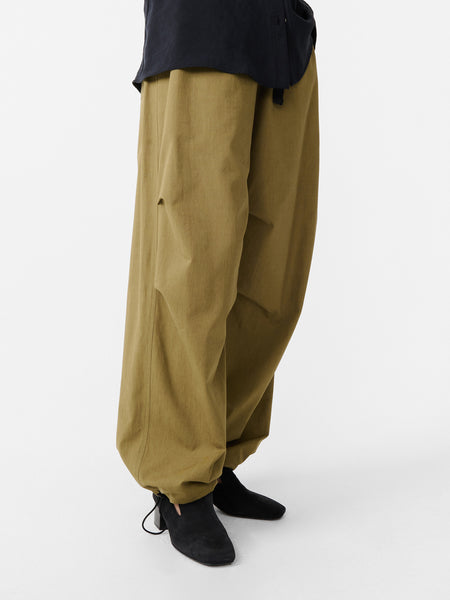 A compact cotton canvas carefully chosen for its irregular appearance that nods to Studio Nicholson’s longstanding workwear influences. They’re made with an elasticated belted waist and an adjustable drawcord hem, allowing you to create a tapered fit.