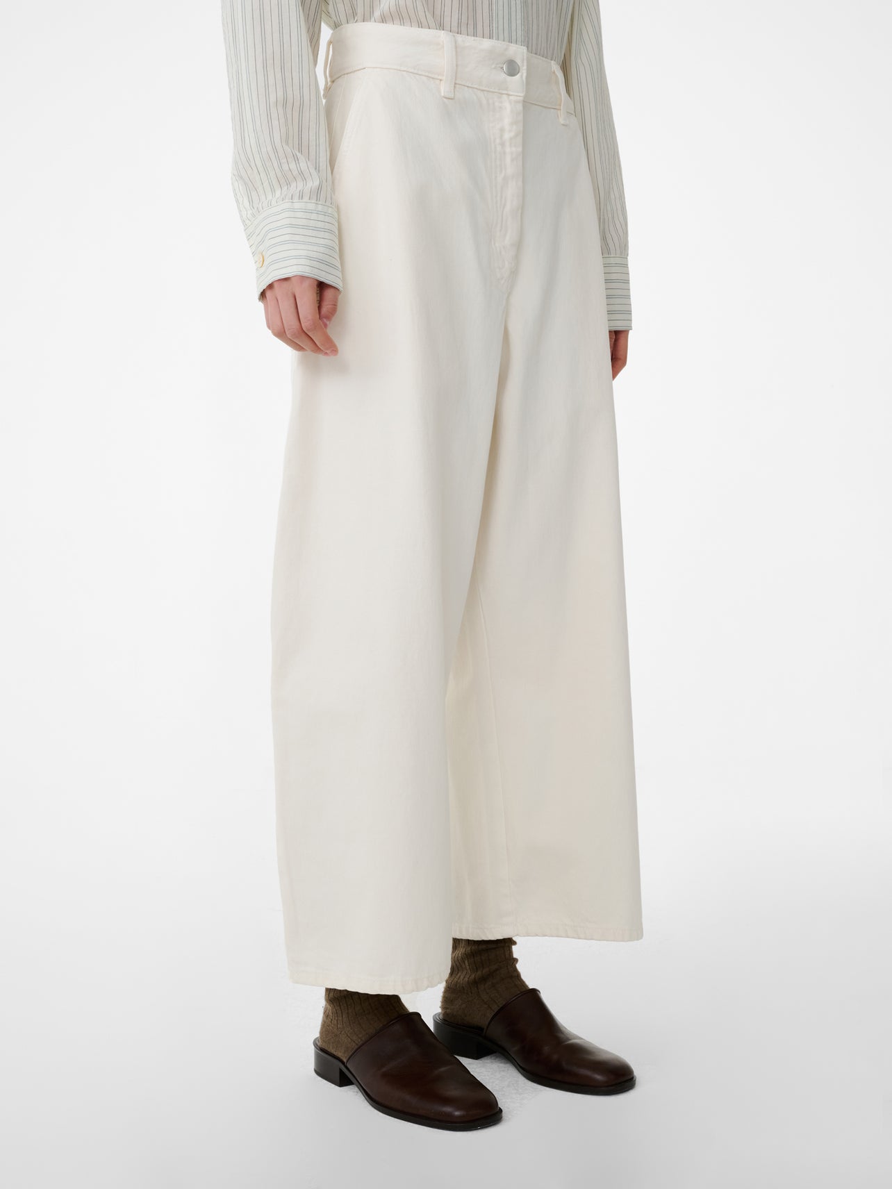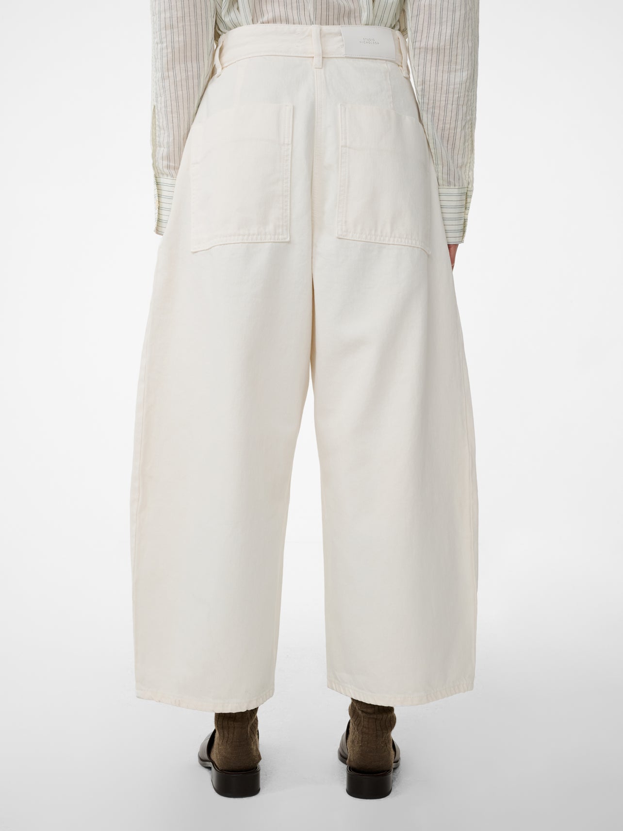 Sits just above the natural waist. A denim trouser, as opposed to a traditional pair of jeans, there’s a crescent shape to the wide leg that’s due to the side seam deliberately twisting forwards.
