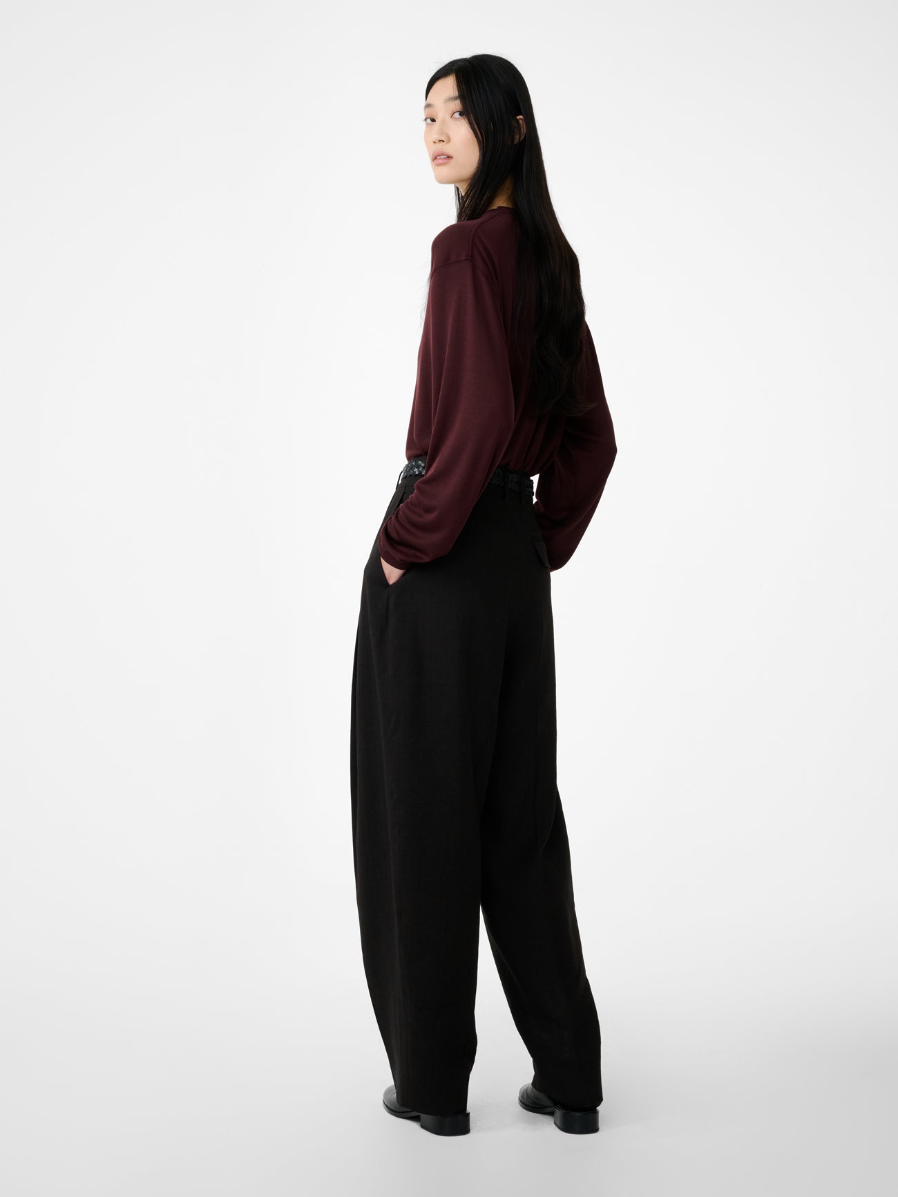Cut from our broken herringbone: a yarn-dyed blend of viscose and linen that balances natural texture with a soft drape, the classic Acuna pants are a Studio Nicholson staple for good reason. These double pleated trousers combine a high rise with a wide, flowing leg, which is slightly elongated to allow the fabric to fold and pool.
