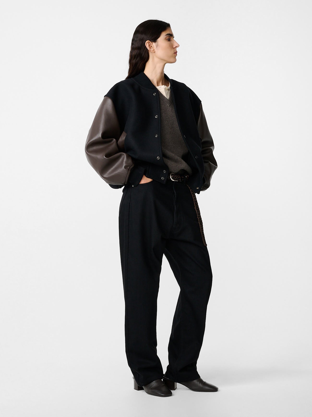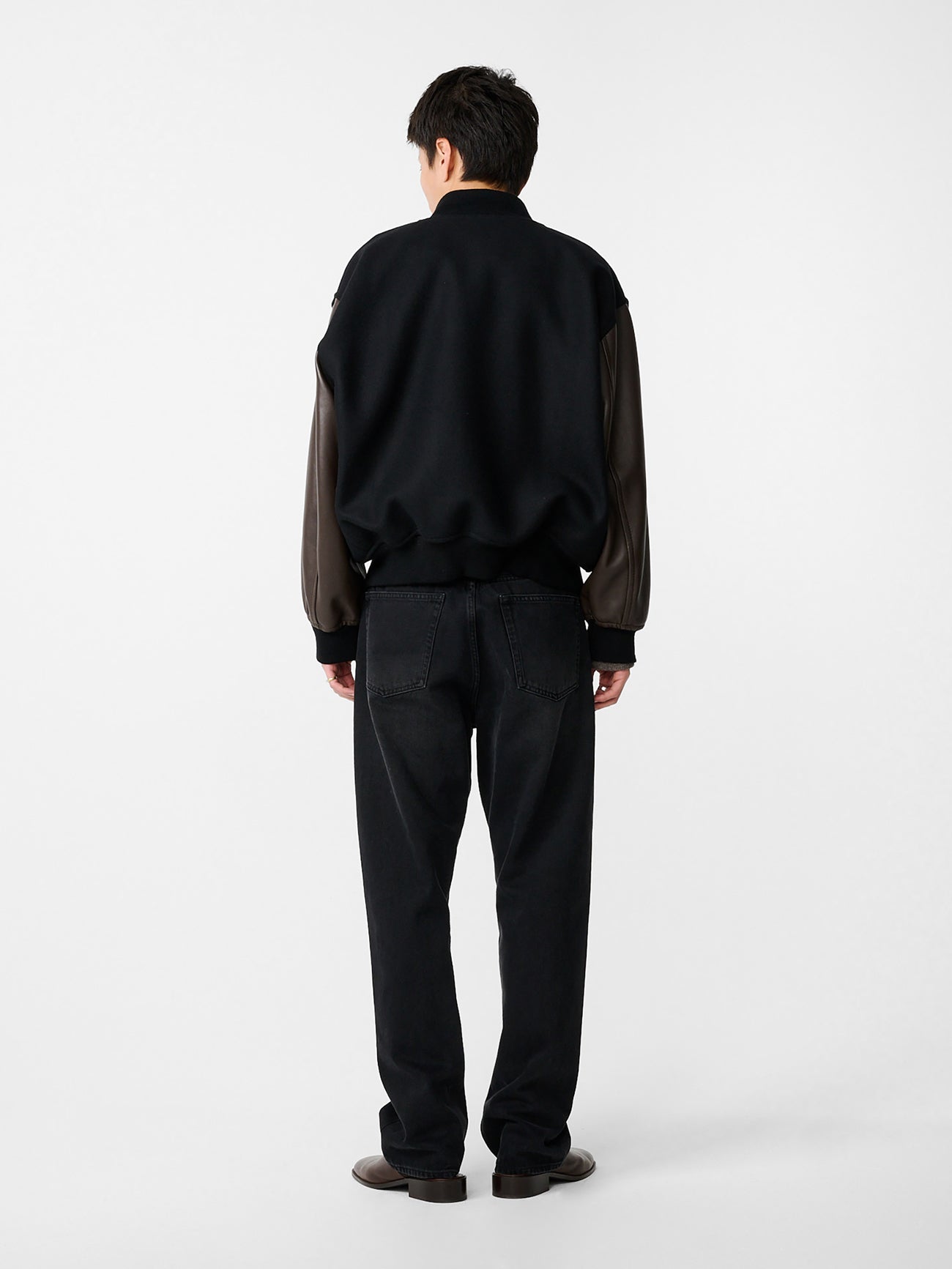 Combining smooth kid leather sleeves with a body cut from a premium twill-woven Melton wool fabric, the Alpha bomber offers a refined reimagining of the iconic baseball jacket. Classic collegiate details are present in the ribbed-knit collar and hem, as well as the snap-fastening front.