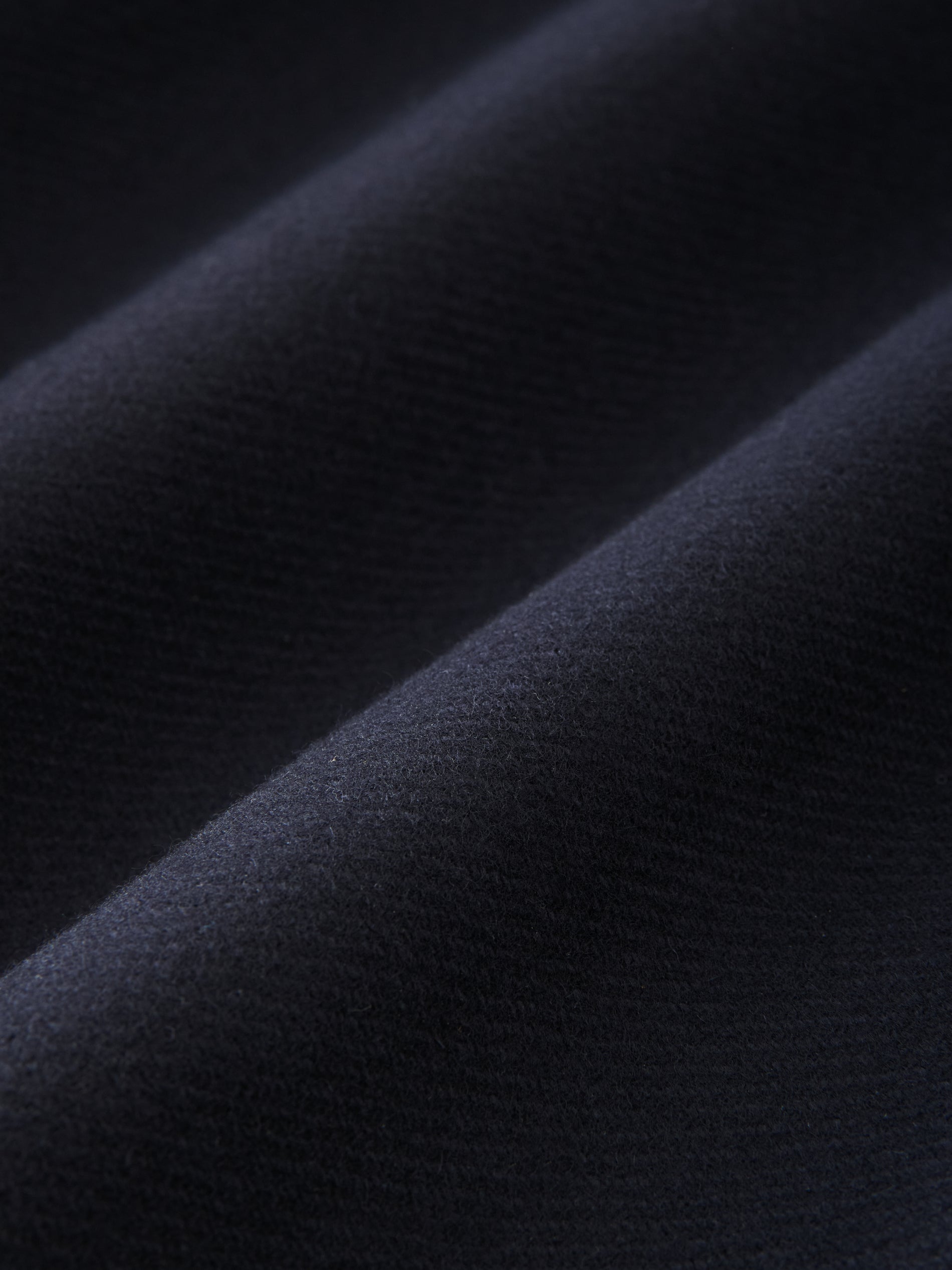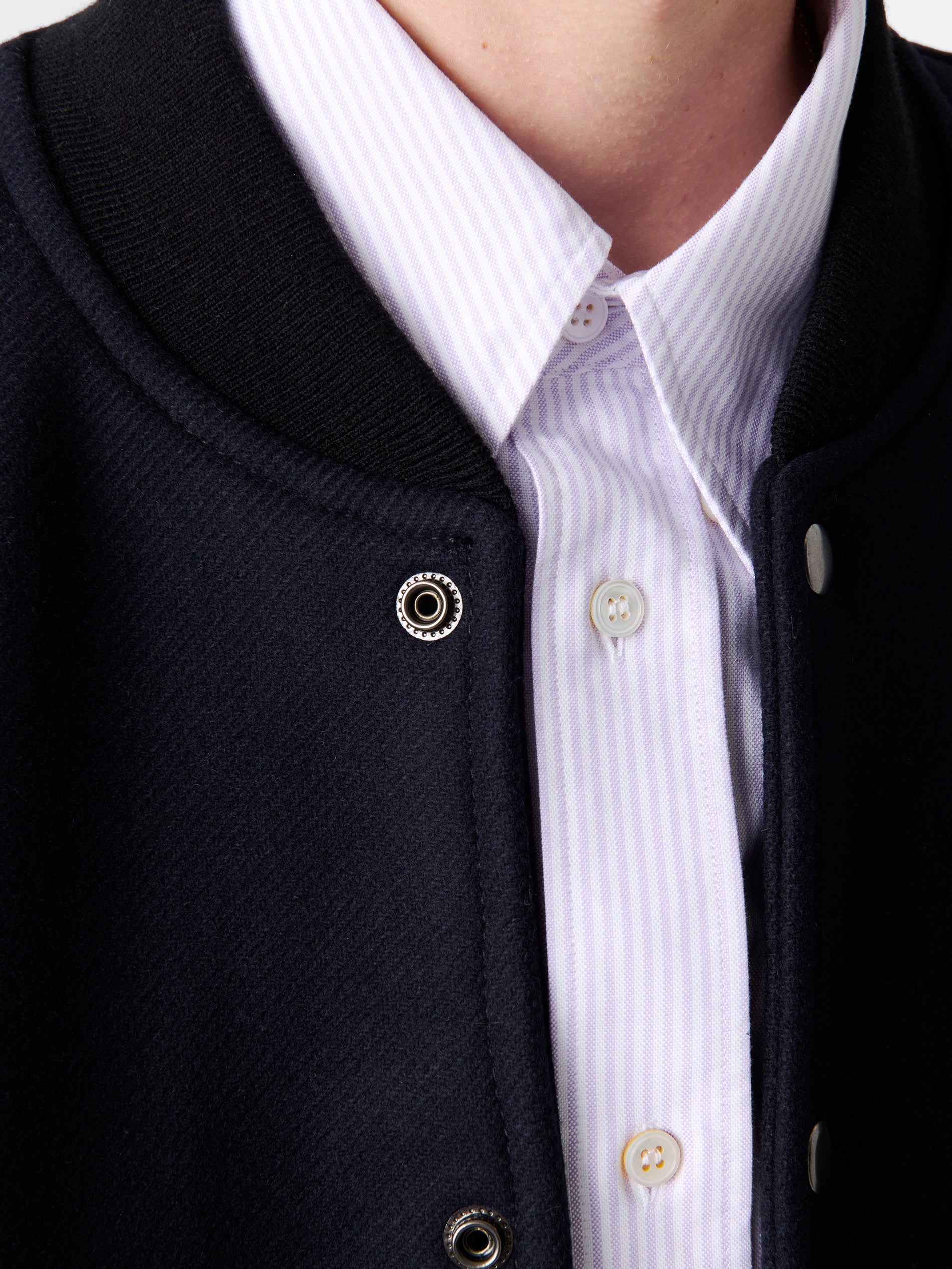 Combining smooth leather sleeves with a body cut from twill-woven Melton wool fabric, the Alpha bomber offers a refined reimagining of the iconic baseball jacket. Classic collegiate details are present in the ribbed-knit collar and hem, as well as the snap-fastening front.