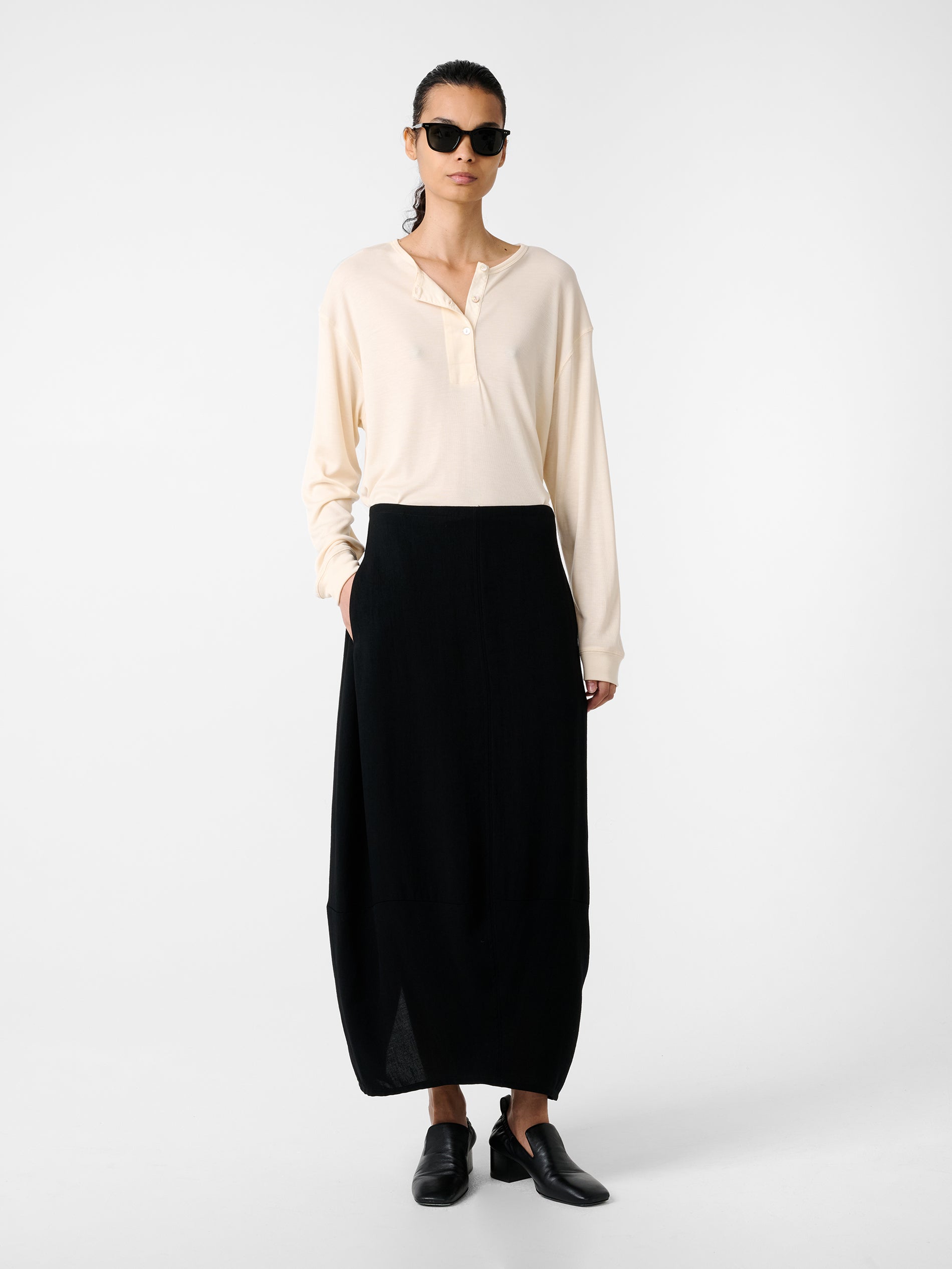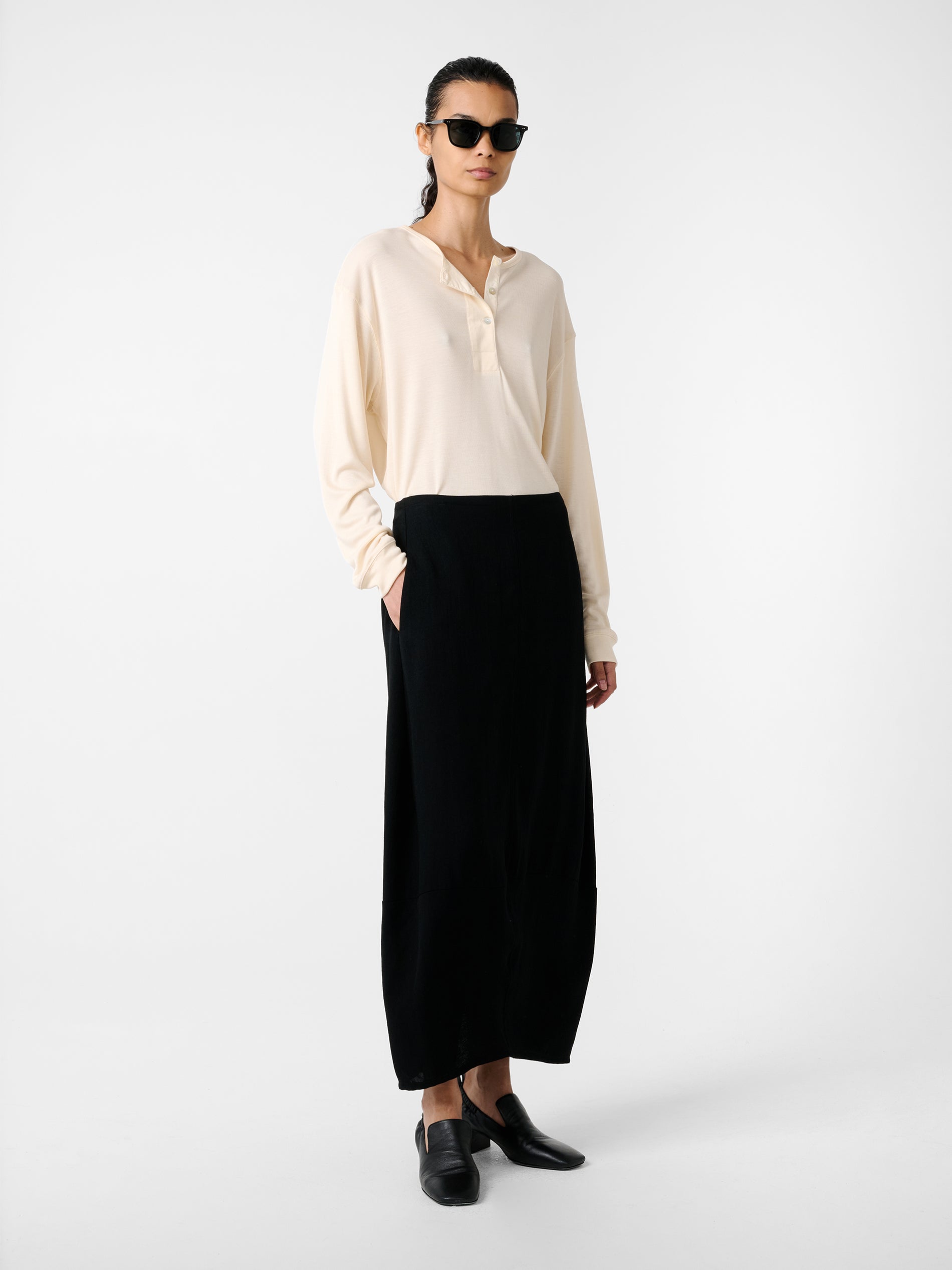 Studio Nicholson’s laser-focus on fabrics is underscored by the Beni skirt. It’s cut from our linen-like twill: a Japanese-milled, wrinkle-resistant triacetate noted for its effortless drape, rich colour saturation and luxurious hand feel. It’s constructed with darts and a rear vent that further accentuates the fabric choice.