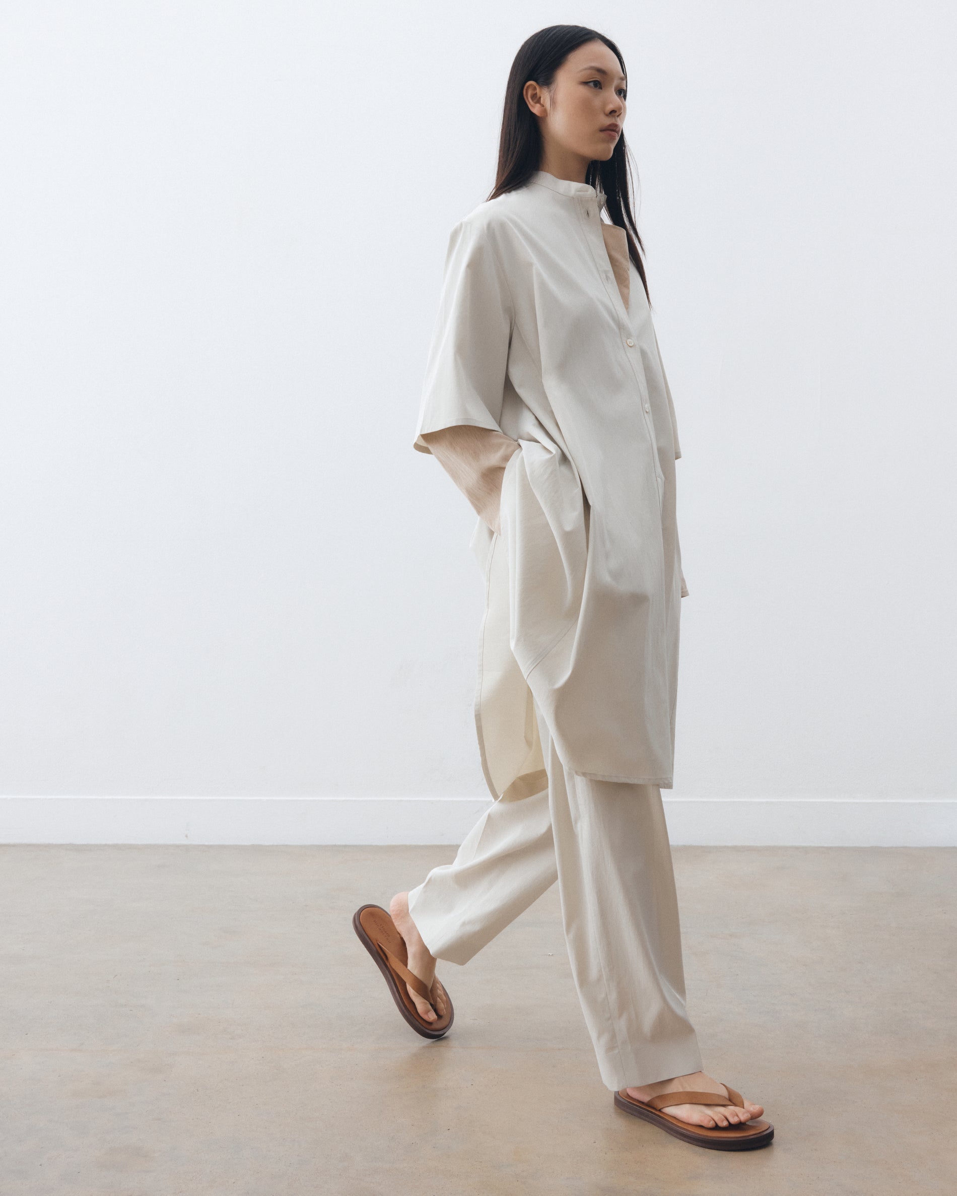 Studio Nicholson’s penchant for clean lines is evident in the Bloch black dress. It’s expertly cut from panels of our enzyme viscose: an Italian-milled cotton-viscose twill noted for its smooth, lustrous hand feel. Shaped to an easy popover silhouette, Bloch has a grandad collar and travelling side seams that amplify the volume in the generous A-line shape.