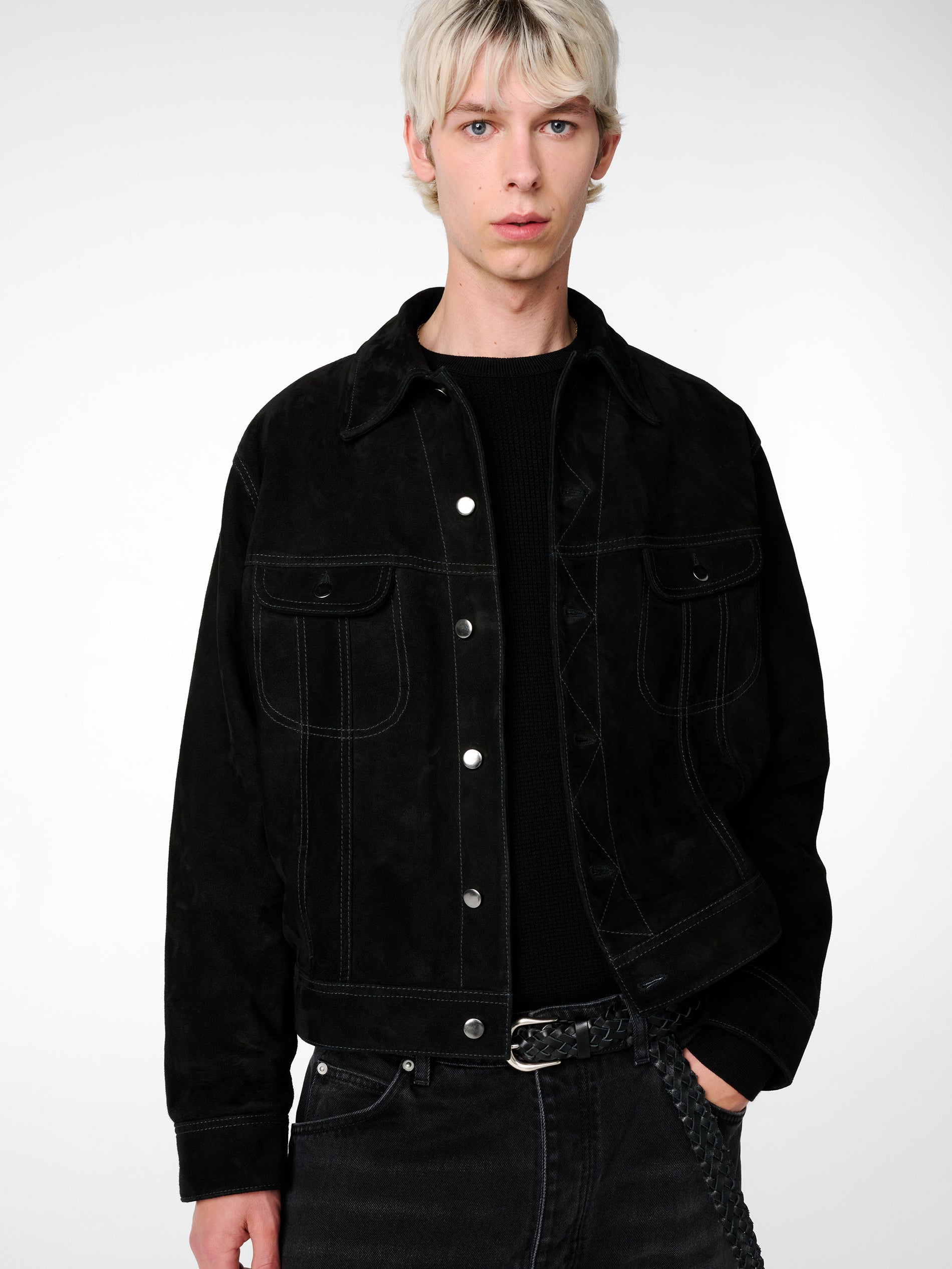 The Boston jacket is part of Studio Nicholson’s collaboration with Aaron Levine and represents a modern update on the enduring trucker silhouette. It’s crafted from out soft suede and moves away from the signature slim cut of the classic denim style with a relaxed, boxy feel that gives a modern feel. Boston is finished with buttoned-flap chest pockets and contrast topstitching.