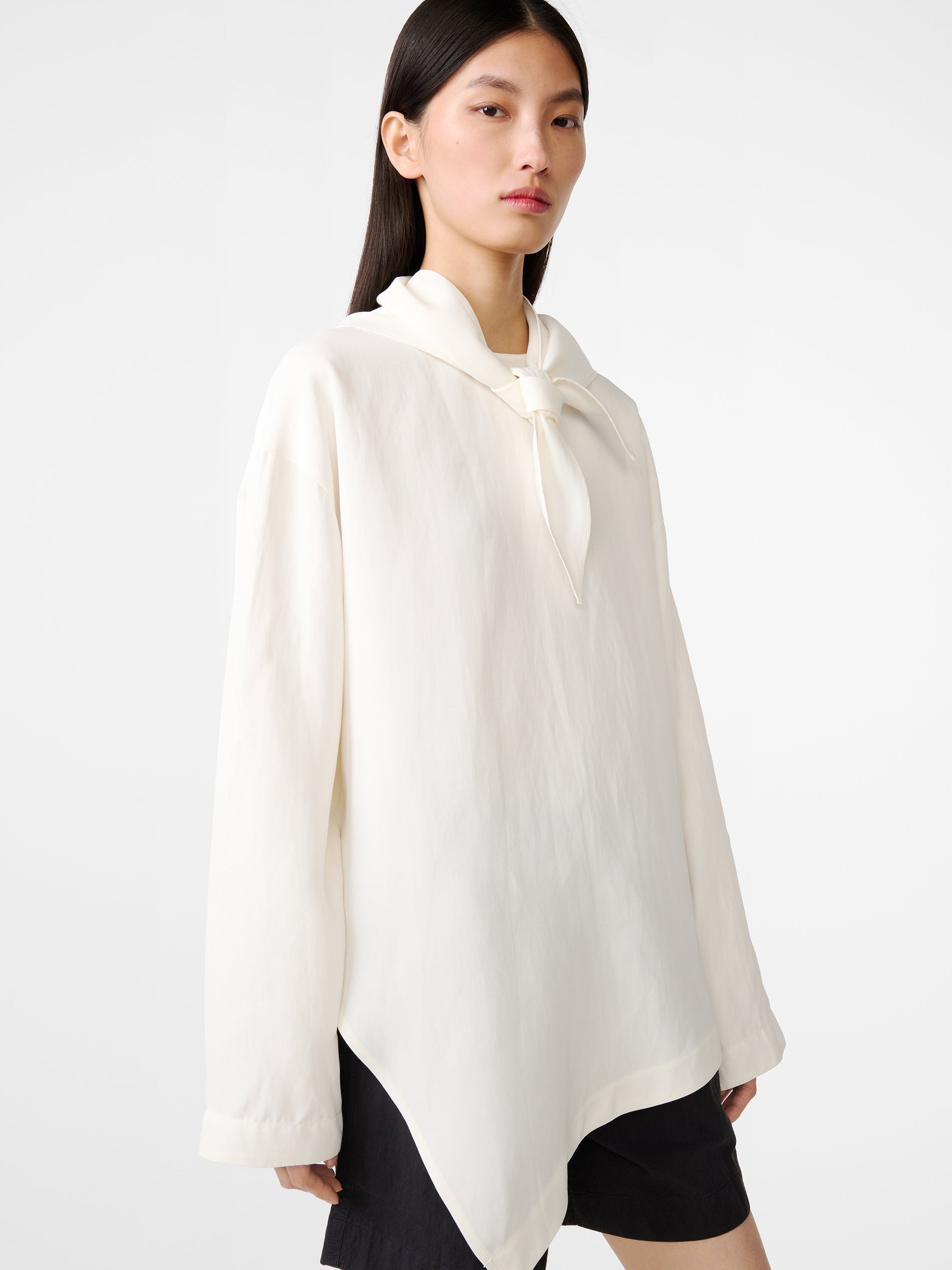 The Bute top is cut with an asymmetric front panel that falls softly over the body, embodying a relaxed feel that’s complemented by the detachable scarf. This iteration is cut from a fluid woven fabric that has a pleasing drape, then finished with neat straight cuffs.