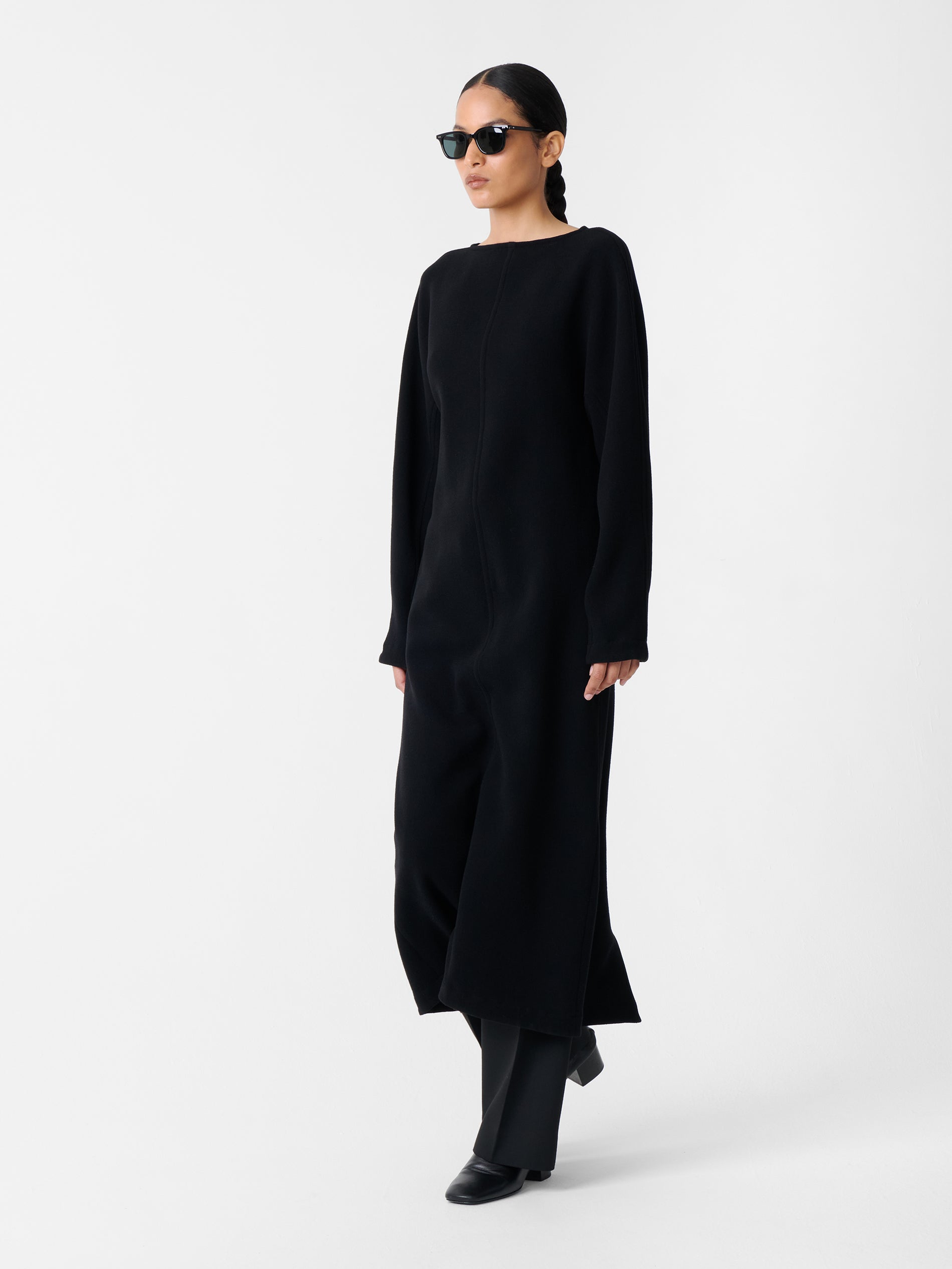 Studio Nicholson brings a modern edge to the longline dress with Cali, which is rooted in our mix of exacting craftsmanship and quality fabrics. It’s cut from panels of double wool sable: a double woven wool noted for its spongy texture and used here to sit cosily on the frame while accentuating the flat-felled seams in Cali’s construction.