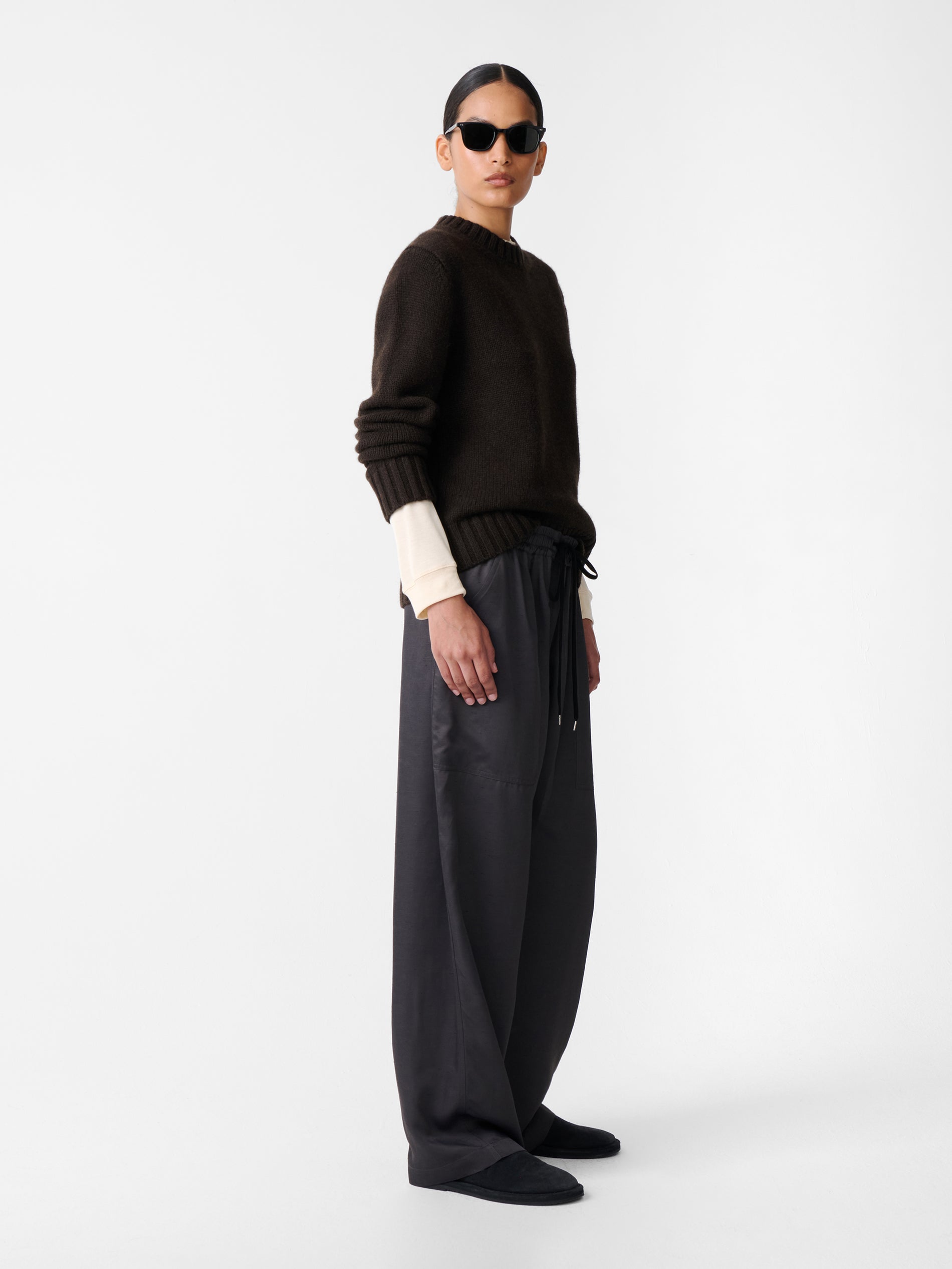 The satisfyingly slouchy Capel pants evoke the relaxed mood that permeates our Winter ’25 collection. They’re cut from panels of our neppy viscose satin: a fabric made with nep yarns that lend an irregular feel and a fluid, silky look. The pants are constructed with an elasticated drawstring waist and generous Italian pockets.