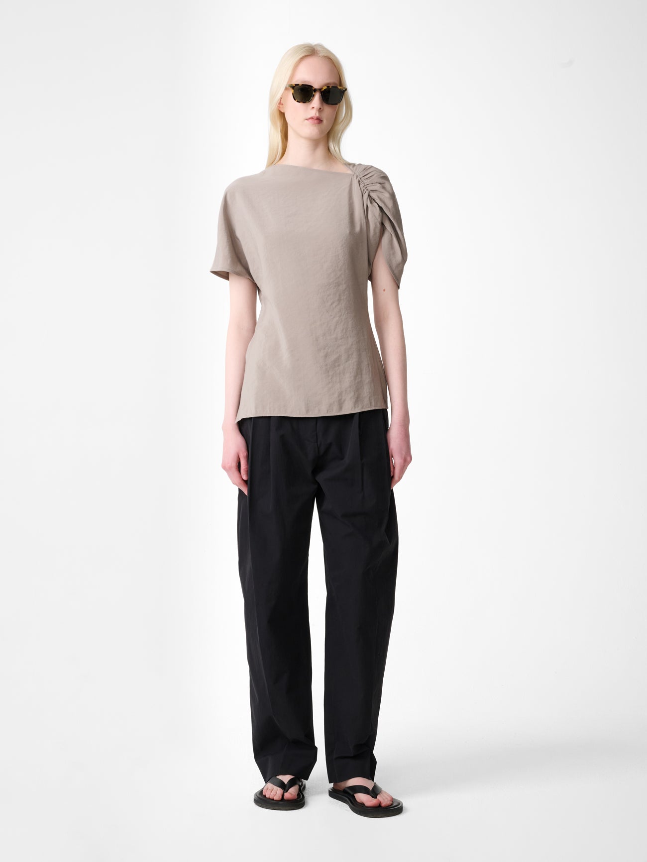 Sister to our Palaestra dress, Carpi leans into Studio Nicholson’s signature mix of artful minimalism and high quality fabrication. It’s crafted from our powder handle modal: a lightweight fabric with a luxurious hand feel and gentle matte texture, and features an asymmetric neckline and a gathered shoulder, amplifying the fluidity in the frame.