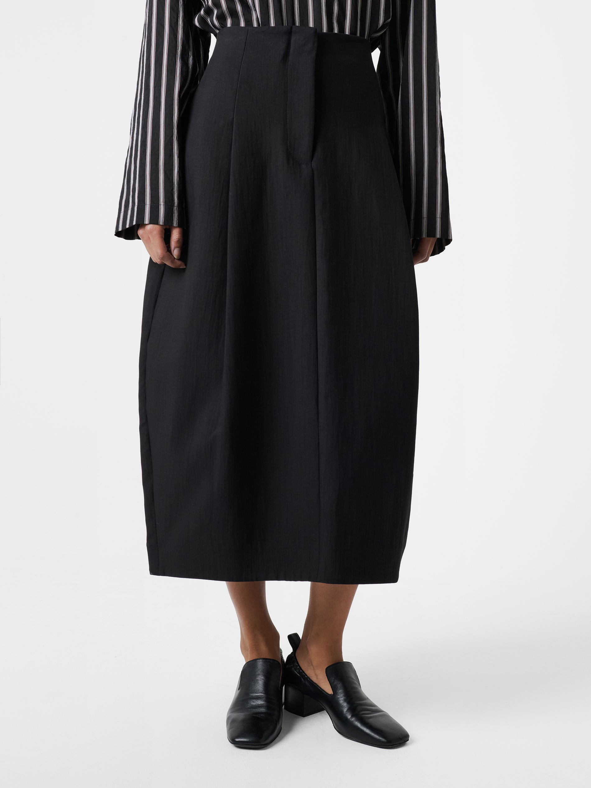 The Carson skirt is cut from a textured double cotton that’s woven to a twill weave, creating a soft structure that helps lend a sculptural bell-like shape to the silhouette. It has deep inverted pleats that are cleverly folded to create extra volume and which also draw the eye down to a thick folded midi hem that stops at the calf.