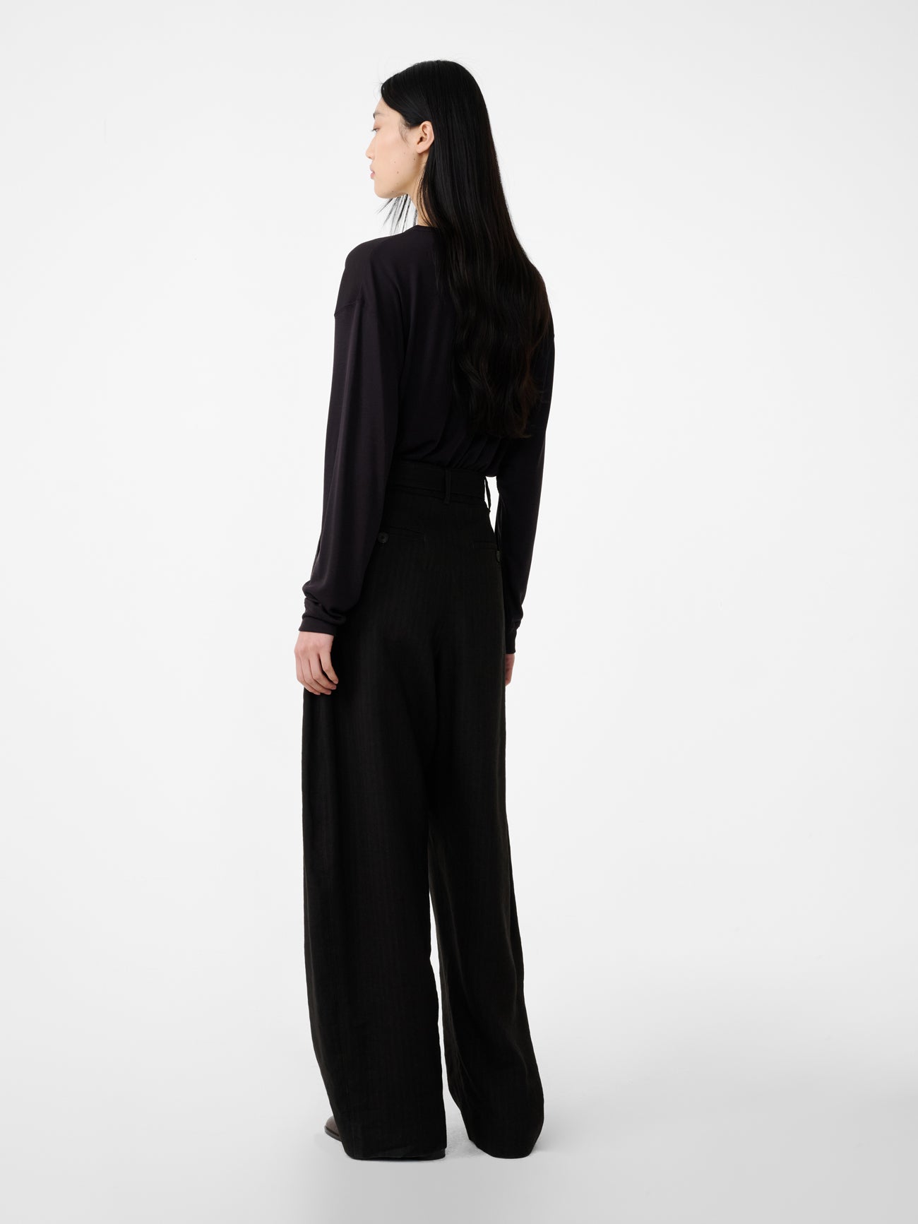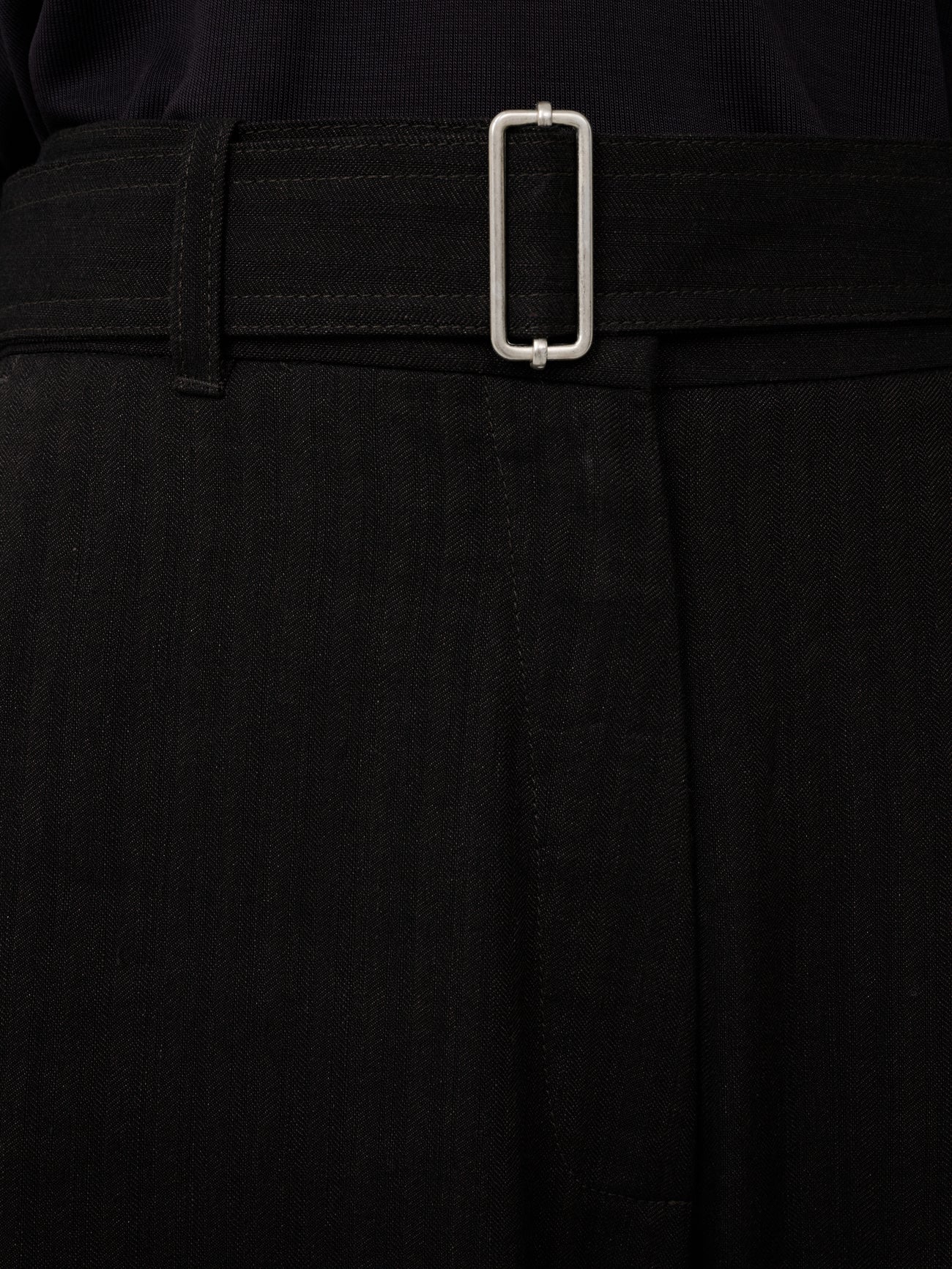 Studio Nicholson’s modern take on traditional tailoring continues with the Chatto pants. A move on from our staple Doring silhouette, these women’s brown trousers are cut from broken herringbone: a yarn-dyed blend of viscose and linen that balances natural texture with a soft drape – and shaped with a belted mid waist that be used to amplify the voluminous curve in the leg.