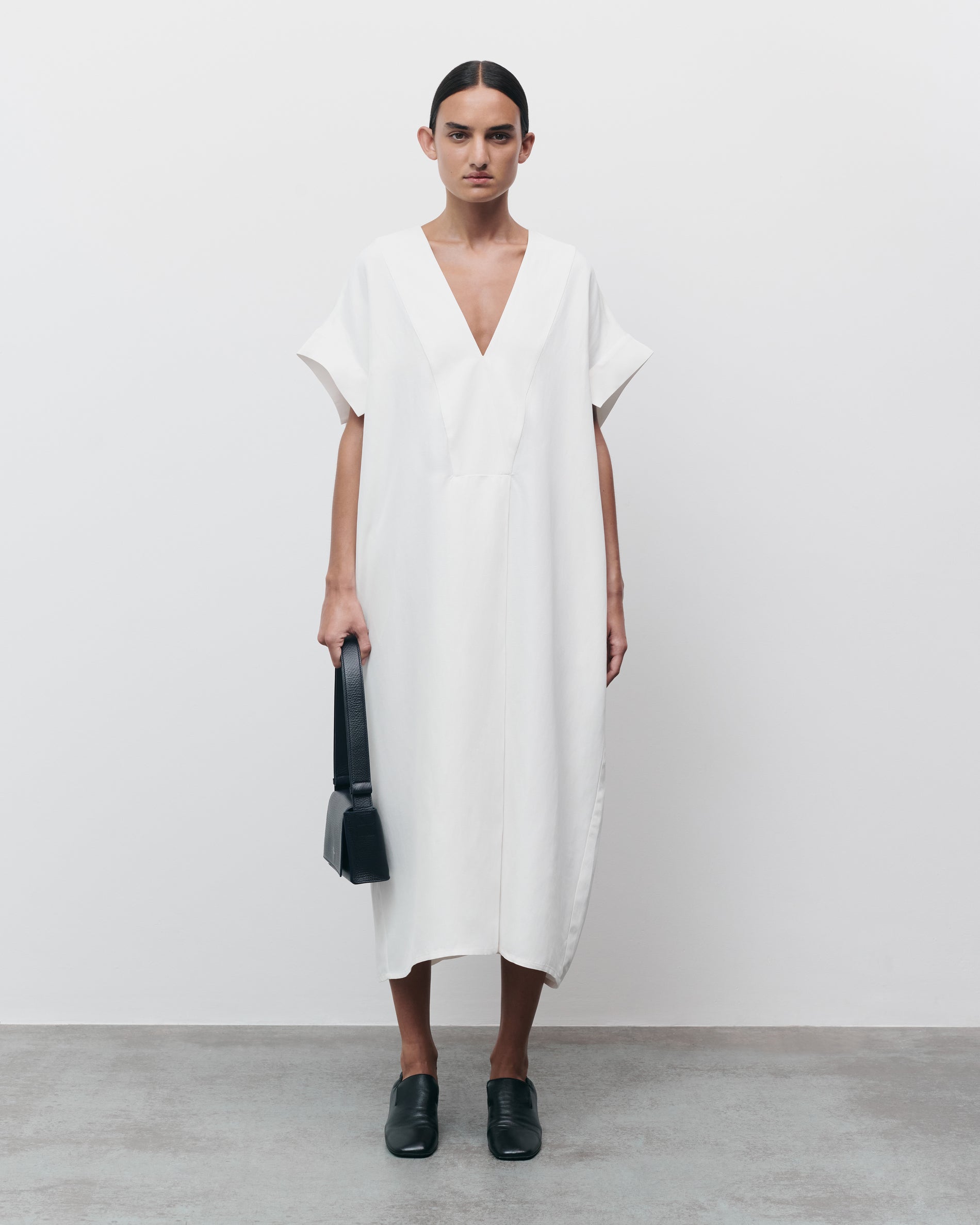 The sleeveless, mid-calf length Cley dress is cut from a woven fabric that gives a bouncy hand feel and lends itself to relaxed, effortless dressing. Crafted with a flattering low V-neckline and mock sleeve cuffs, Cley is constructed with a front knife pleat, subtly amplifying the fabric’s natural fluidity.