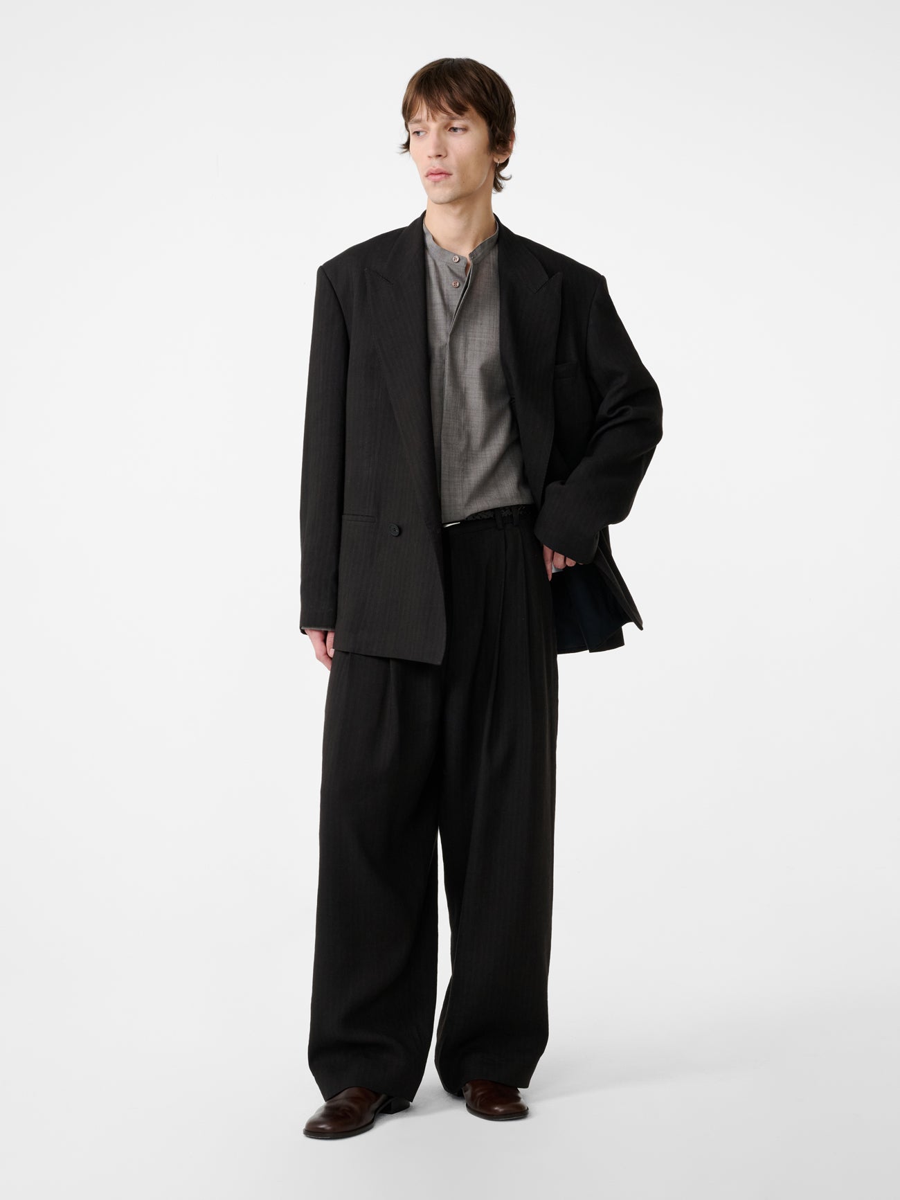 The Daburu jacket offers a relaxed, luxurious take on spring tailoring: a double breasted, oversized style, cut from our yarn-dyed broken herringbone fabric. Designed for a clean, modern silhouette, it has minimal detailing and places an emphasis on cut.