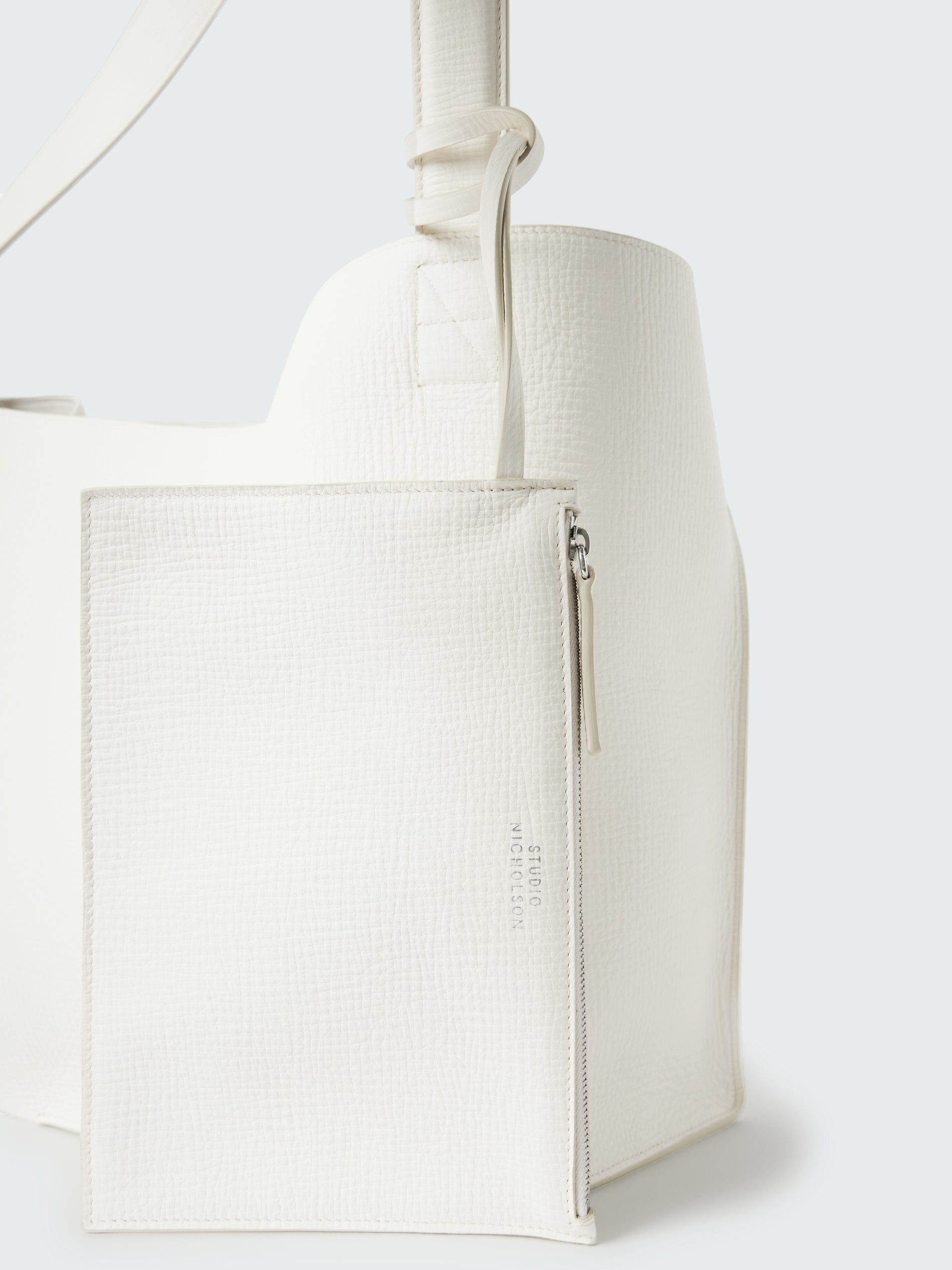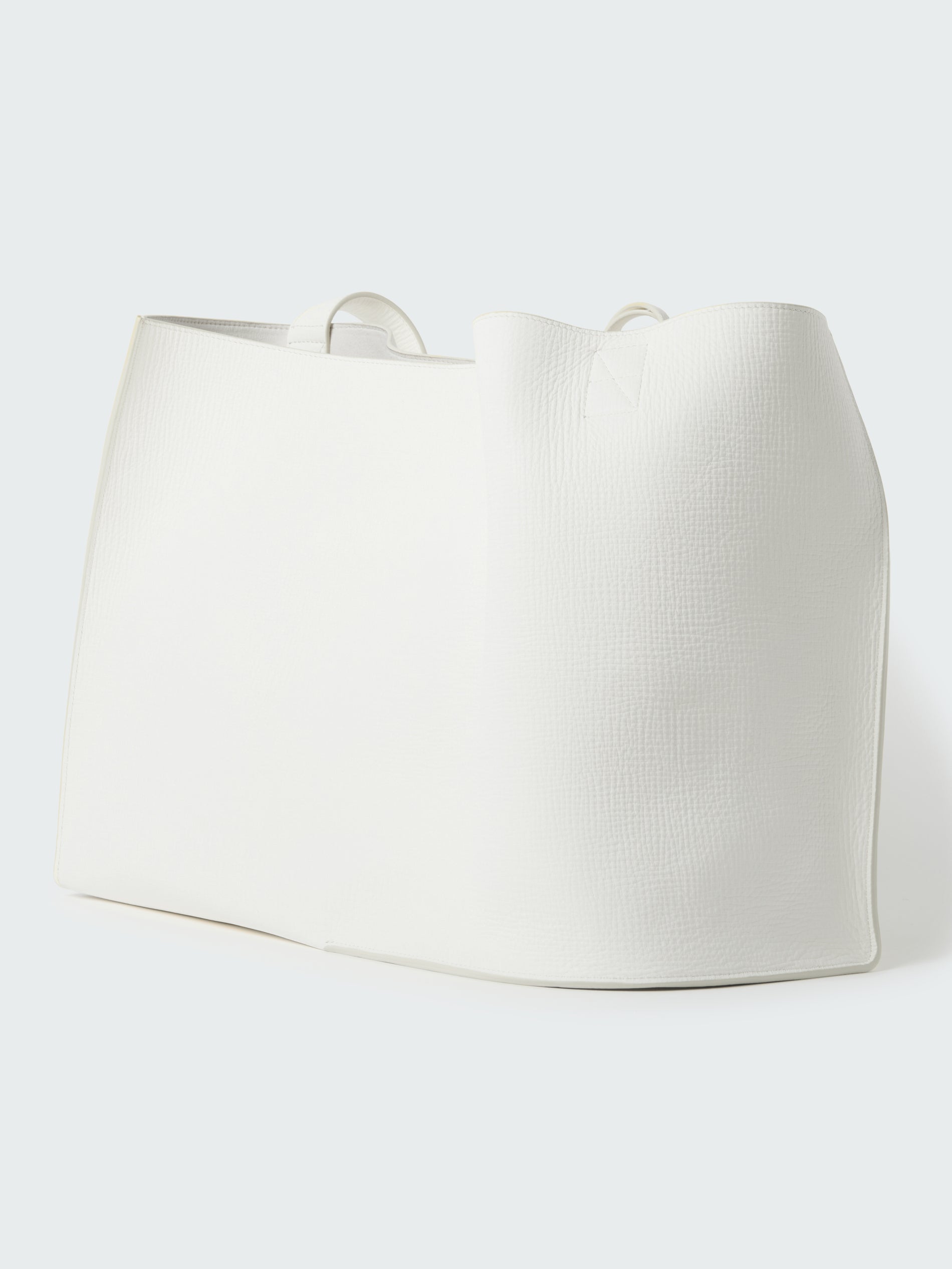 Combining perpendicular lines with the curved, this extra-large tote is constructed from Italian leather with just two corner seams and one shoulder strap, creating volume and a silhouette reminiscent of an unstructured shoulder or sleeve. The fixed strap is secured on opposite corners permitting the bag to slouch when worn. This tote fits comfortably under the arm falling to the wearer's fingertips.