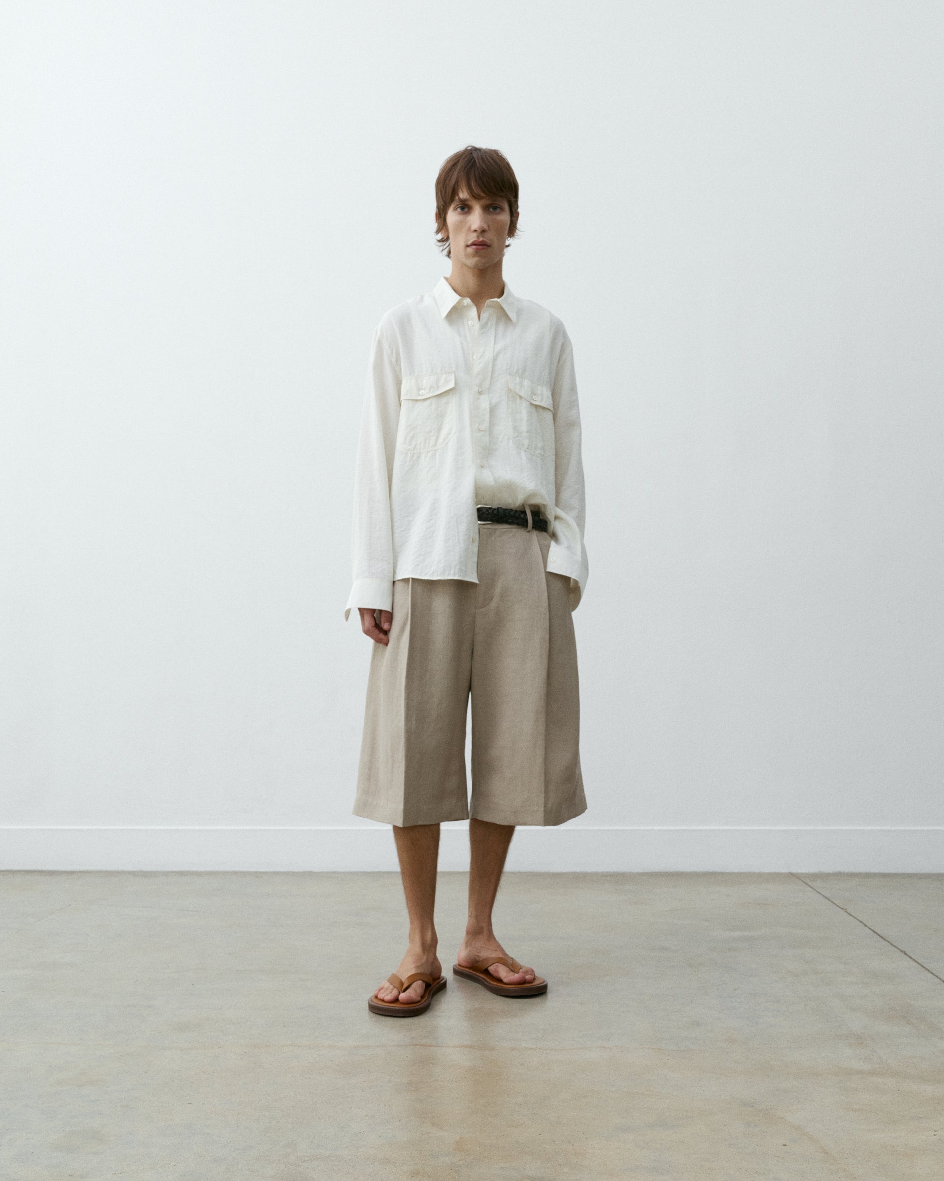 The Fowld shorts are tailored from our antique linen wool: a premium, Italian-milled cloth that marries the airiness and breathability of linen with the structure and durability of wool, making it ideal for transeasonal and warm-weather wear. They are cut to an oversized fit that’s enhanced by the reverse front pleats and are designed to finish just below the knee for a more relaxed look.