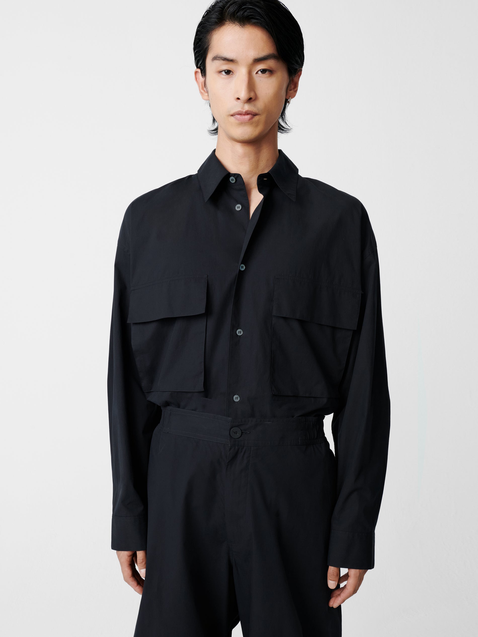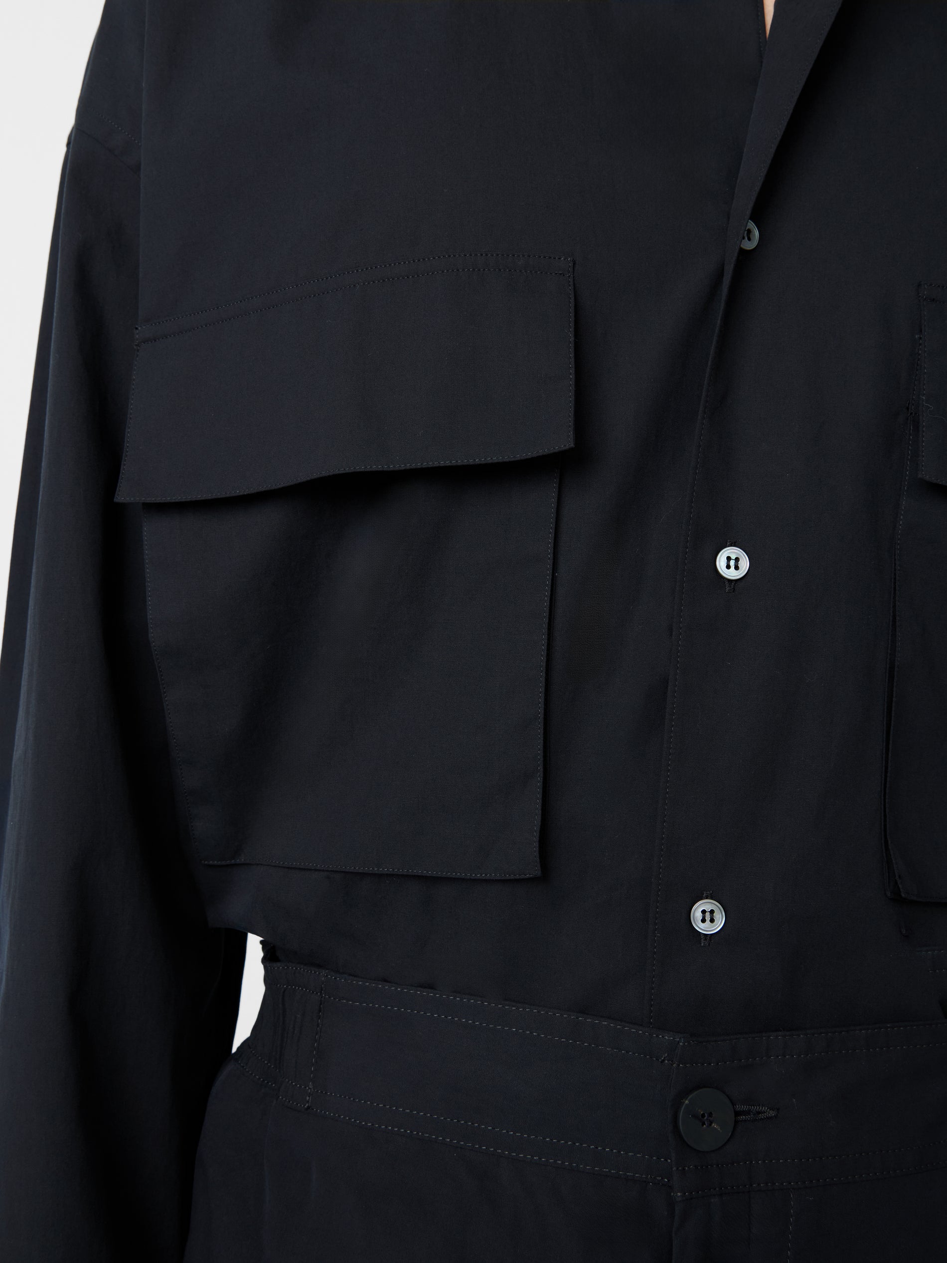 Frame’s wide, boxy shape accommodates two large patch-flap pockets on the shirt’s front. Constructed in a bellows style, the pockets have exaggerated volume which creates a striking visual effect.