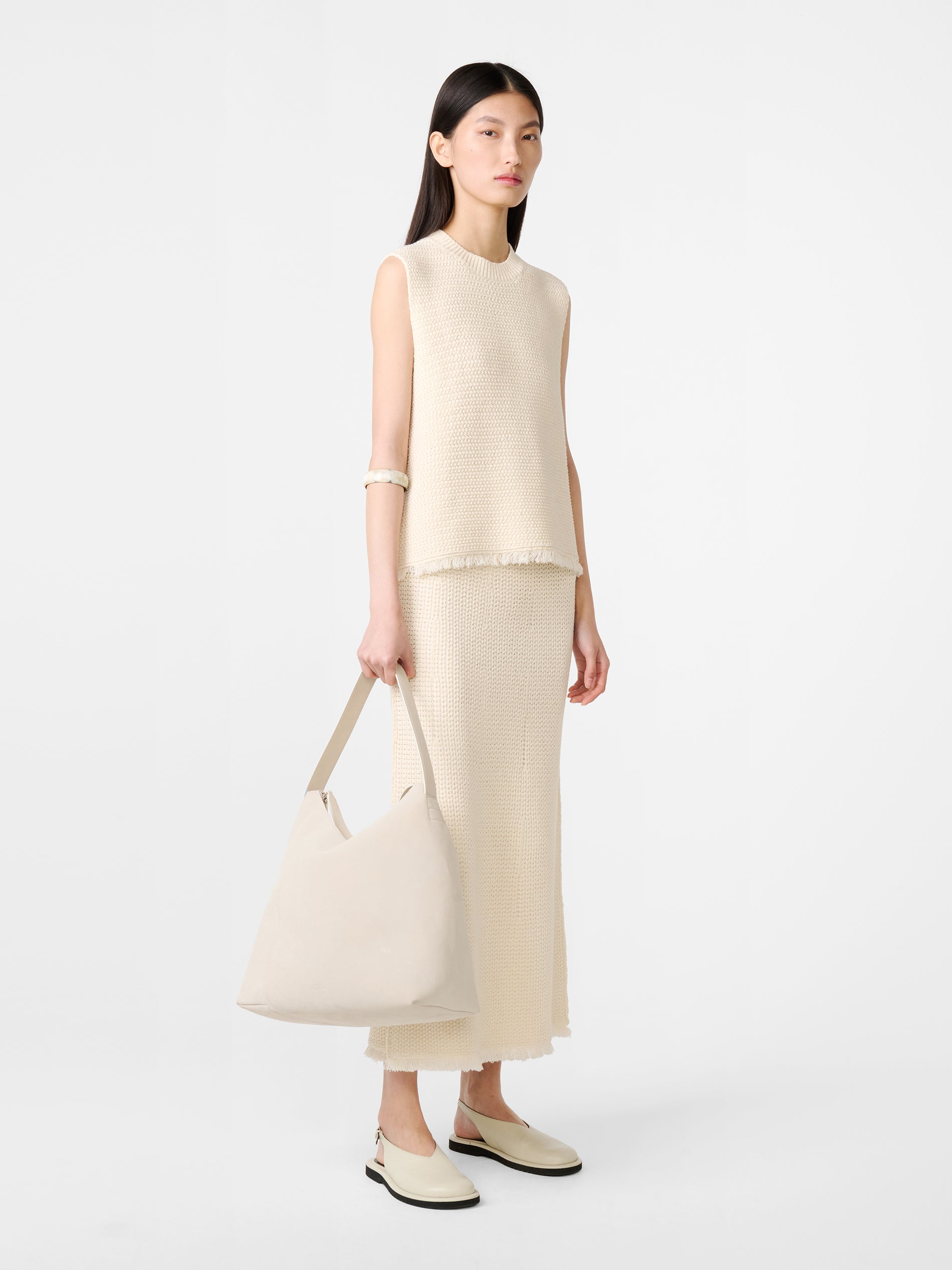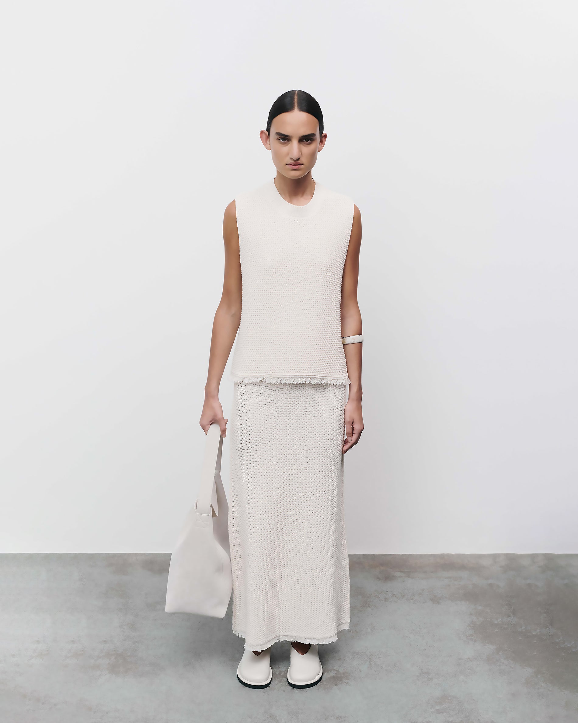 Studio Nicholson reimagines the enduring vest silhouette – a mainstay of any warm-weather wardrobe – with this Fray iteration. It’s knitted from slub cotton bouclé yarns to give a textured hand feel, then shaped with a ribbed neckline and a finished with a fringed hem, further accentuating the textural mood.