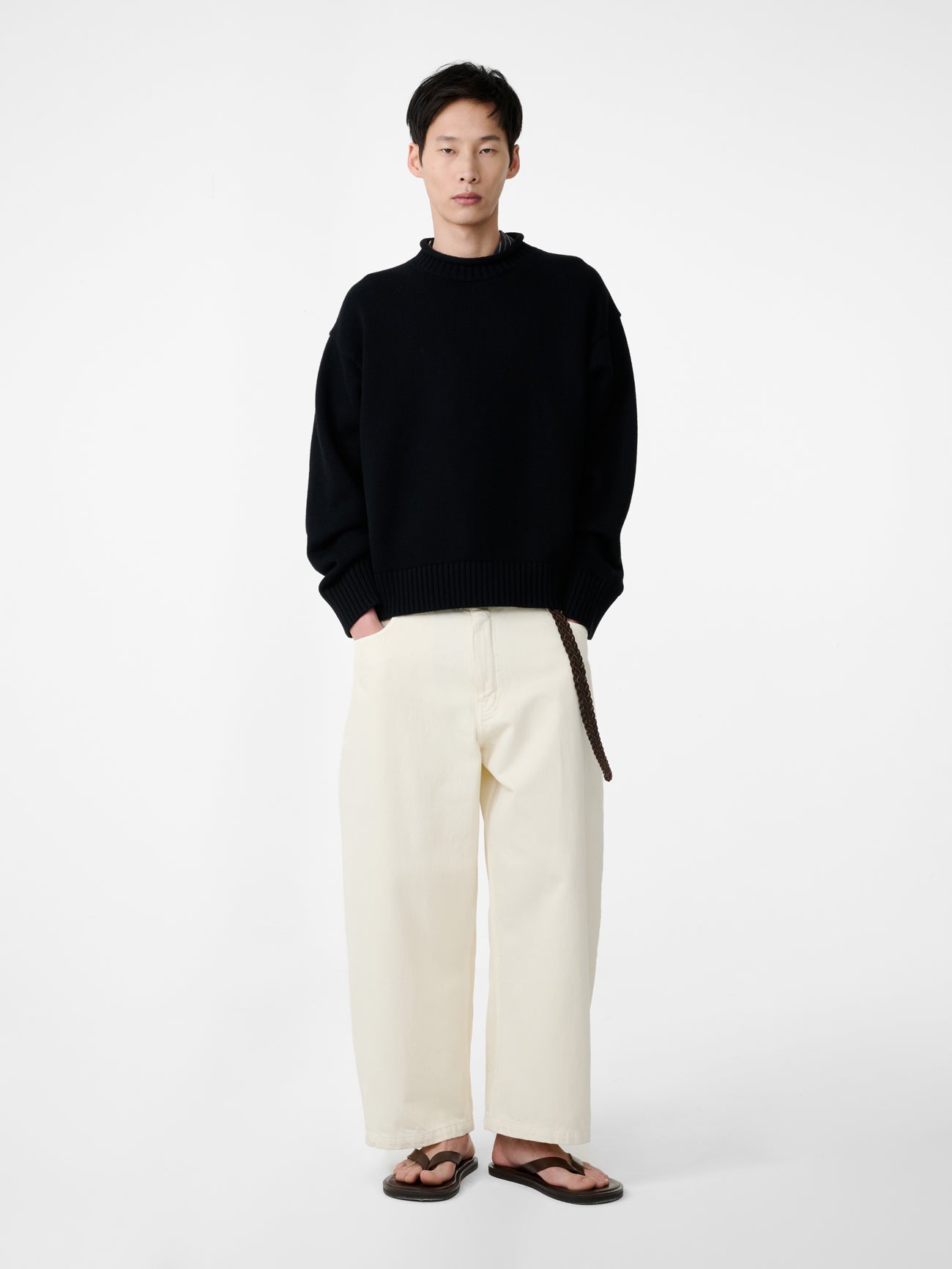 Studio Nicholson’s Hirst knit is a classic wardrobe staple reimagined through a modern lens. Recalling traditional Guernsey styles, it’s crafted in a 5-gauge merino and cotton blend – noted for its tightly woven construction and soft hand feel – and constructed with a roll-edge neckline, dropped shoulders and chunky ribbed trims.
