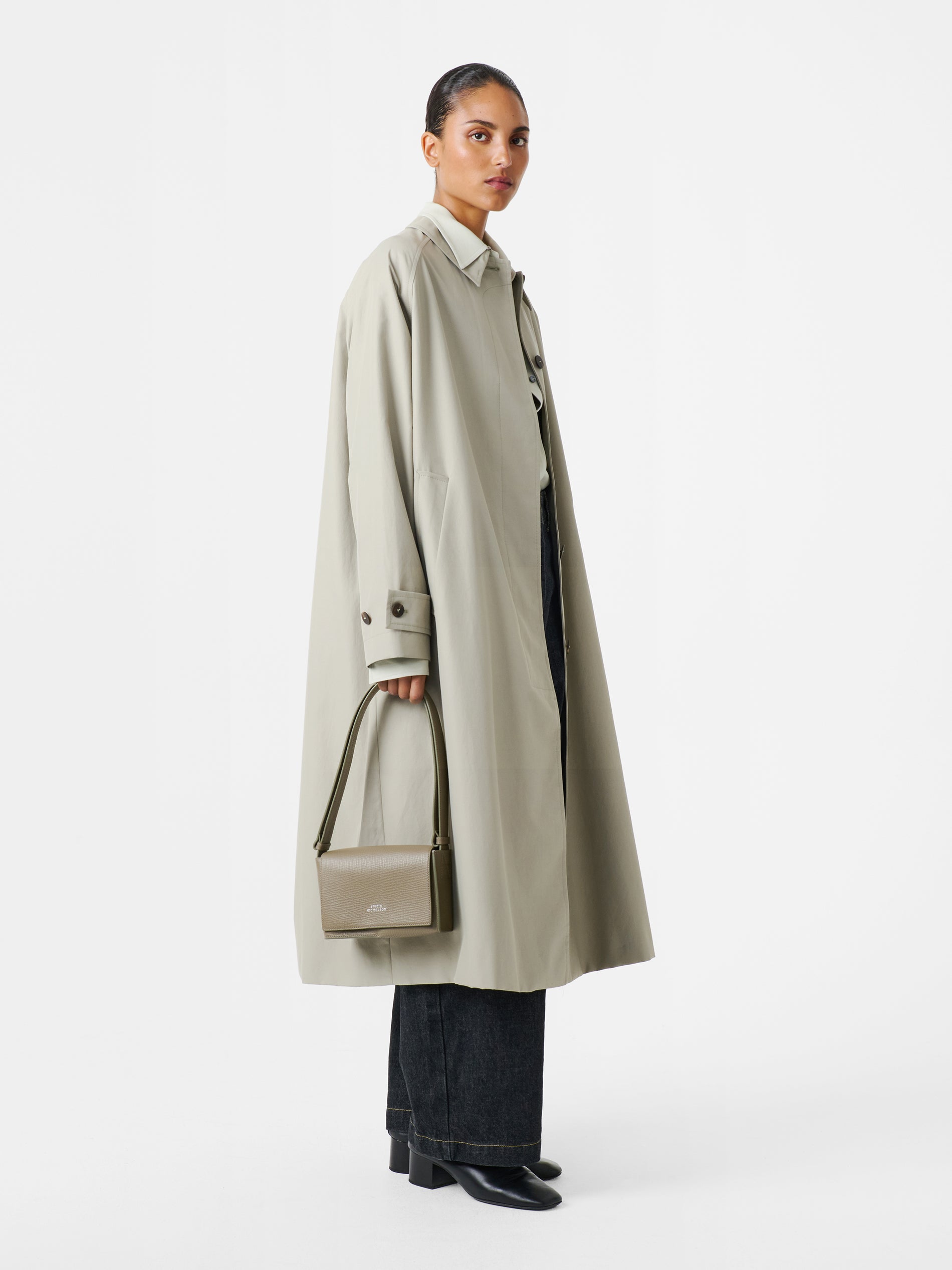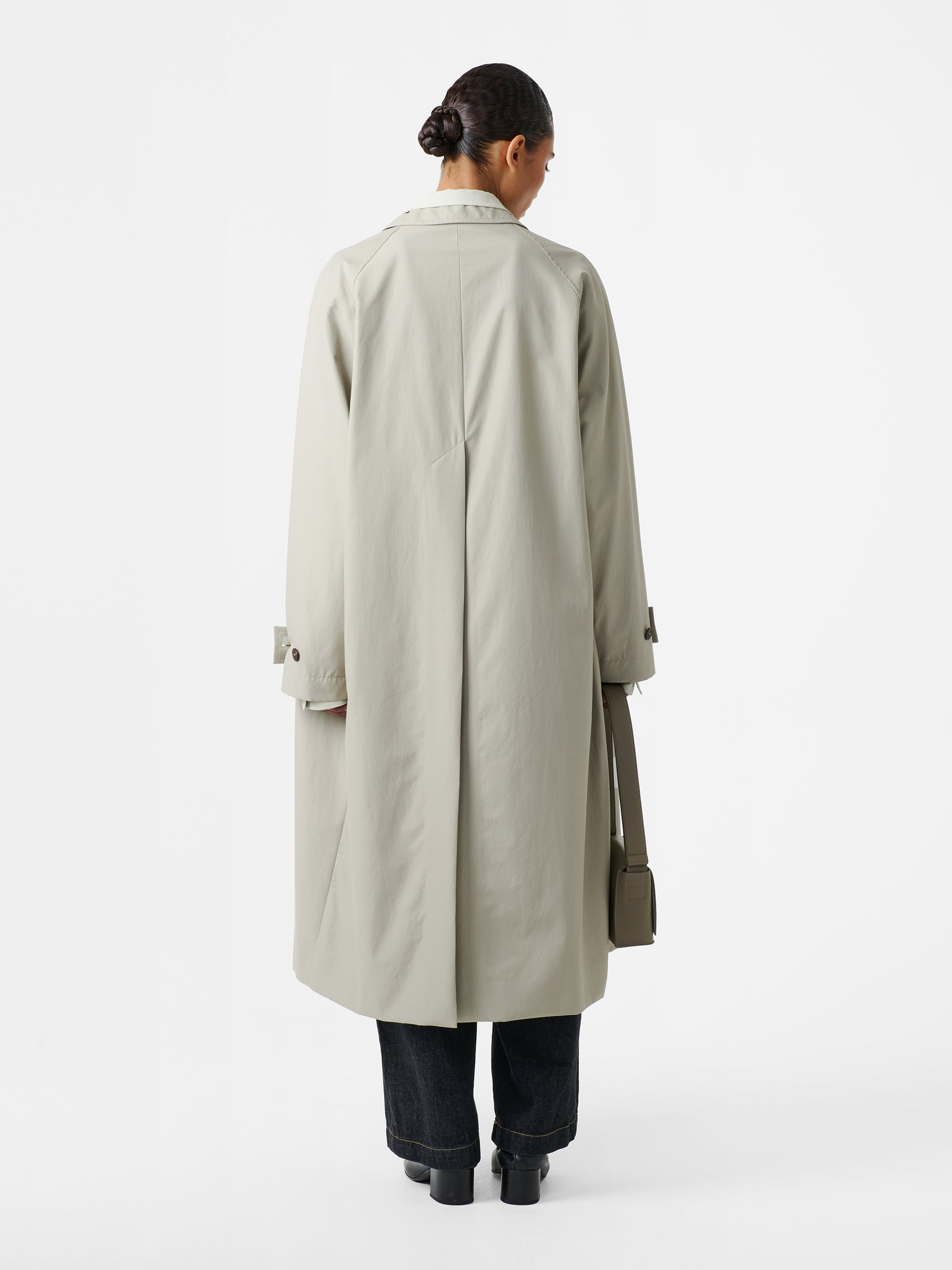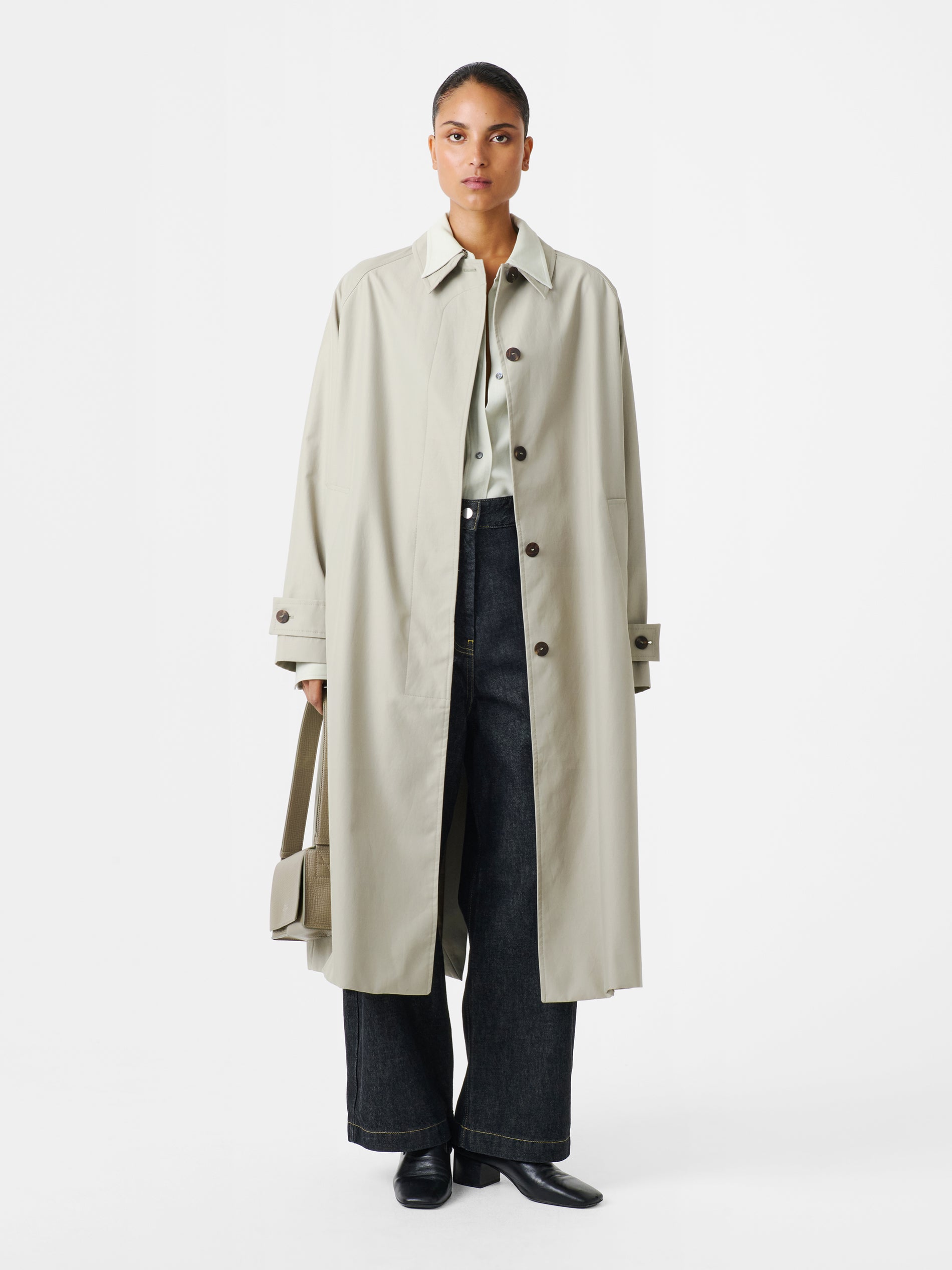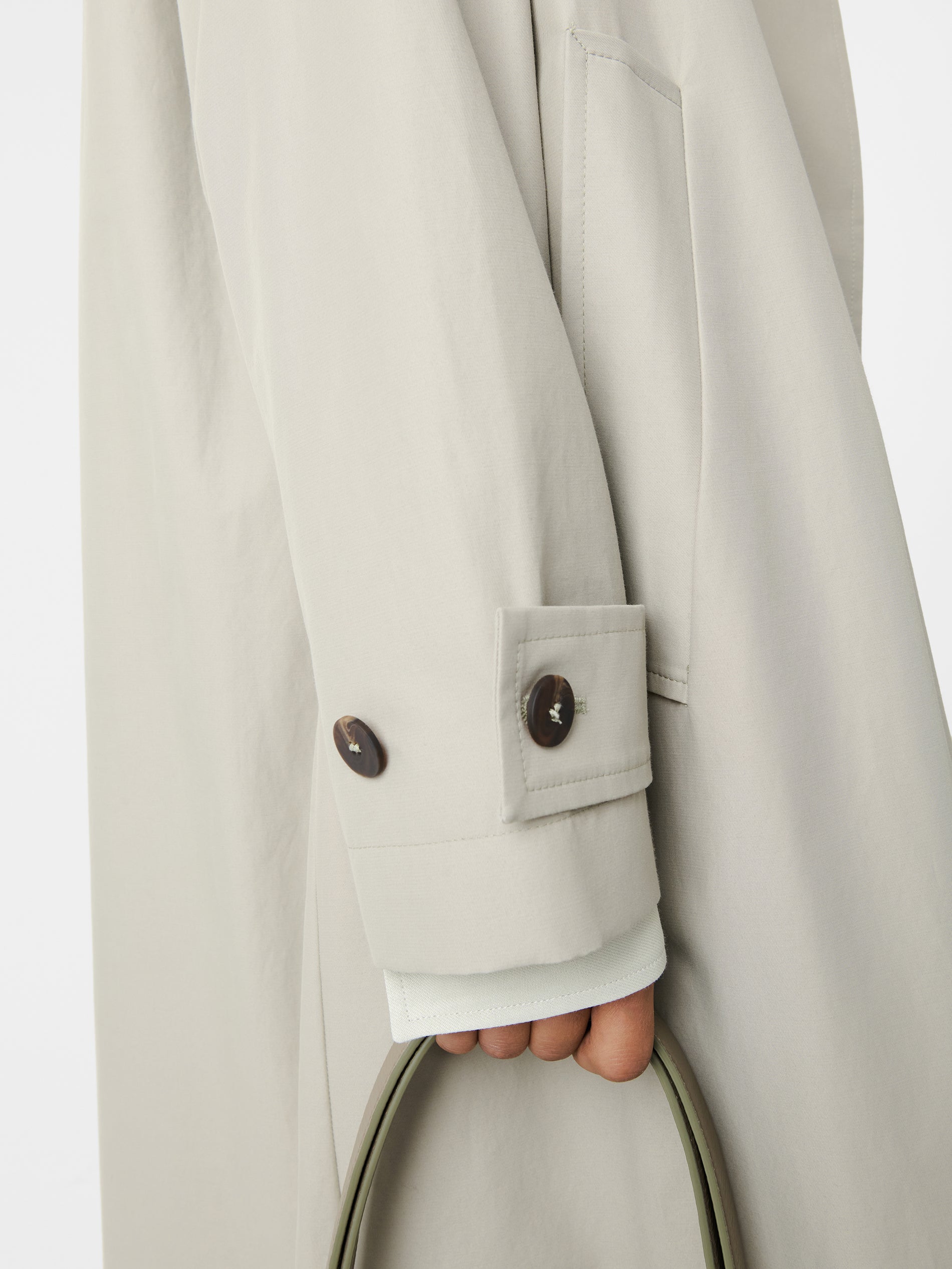 A loving tribute to classic trench coats, Holin’s raglan shoulder and full, voluminous cut make it a sophisticated outerwear choice that’s easy to style. The fabric is a substantial cotton and nylon blend that’s woven in a twill construction and treated with a PU coating, giving it a technical handle and water-repellent finish.