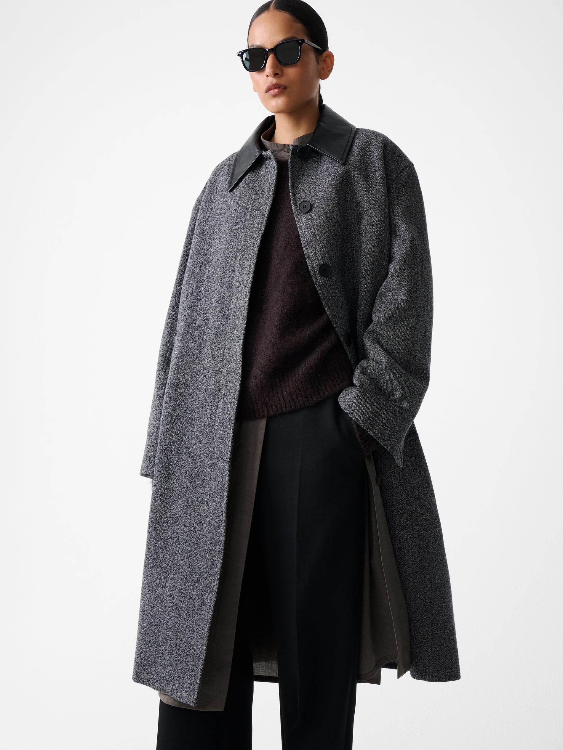 Indio is a modern reinterpretation of the classic car coat. It’s brought to life by its fabrication: an Italian-milled mouline wool that’s created by twisting different coloured yarns to achieve a pleasing, dappled finish and a cosy handle. Evoking SN’s relaxed tailoring, Indio is crafted with dropped shoulders and then finished with a buttery leather collar.