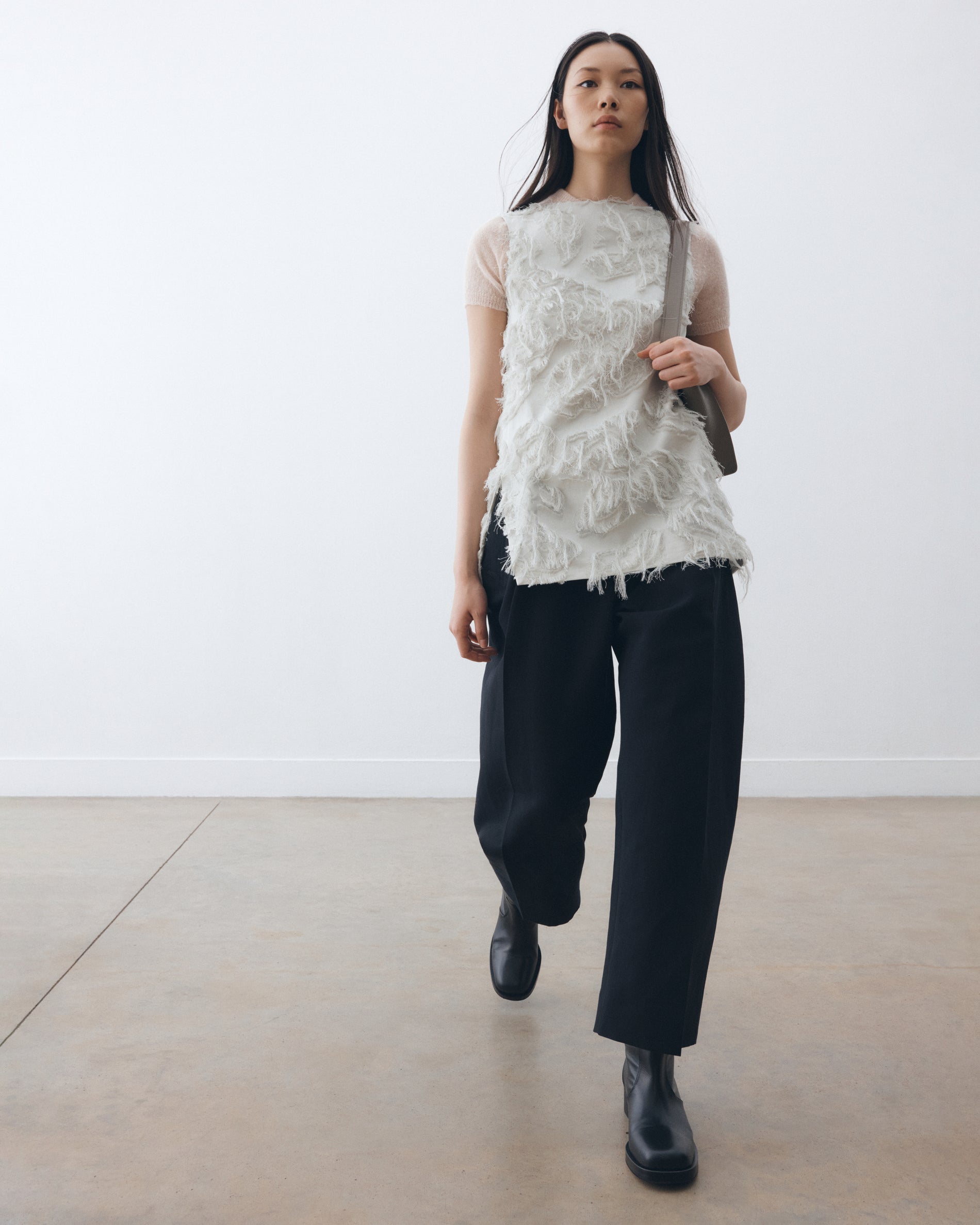 Cut to a modern sleeveless silhouette with a neat boat neck and darted bust, the Mager top is cleverly constructed with twisted side seams that finish in a slit hem. This iteration is cut from our fringe jacquard fabric: a cotton-based fils coupé jacquard that gives a rich, textural hand feel.