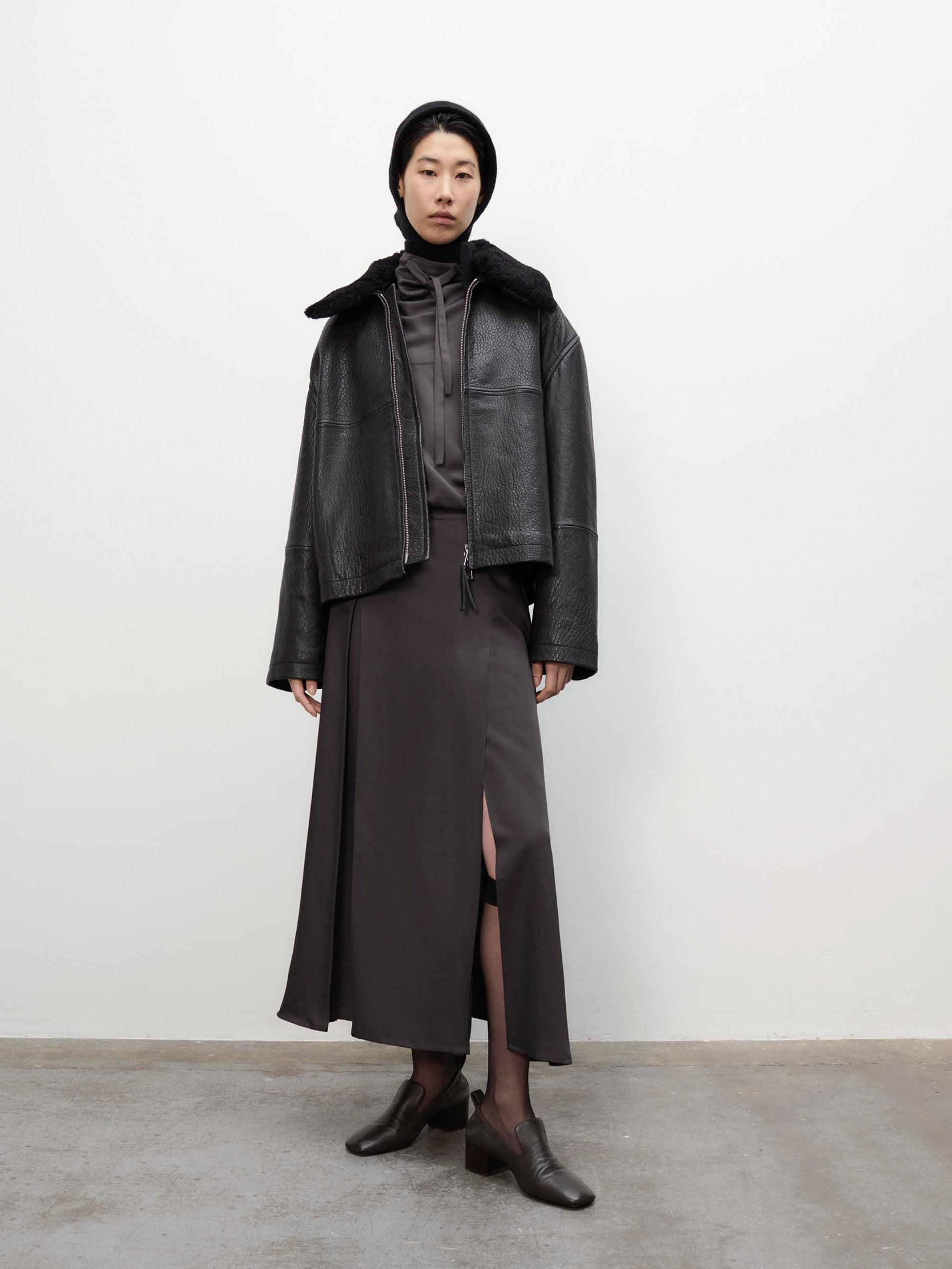 Mirelle is inspired by a piece from Nick Wakeman’s personal collection. It’s made from our neppy viscose satin: a fabric made with nep yarns that lend an irregular feel and a fluid, silky look that amplifies the generous, oversized frame. Mirelle features a cowl neck with drawstrings and a high-low hemline.