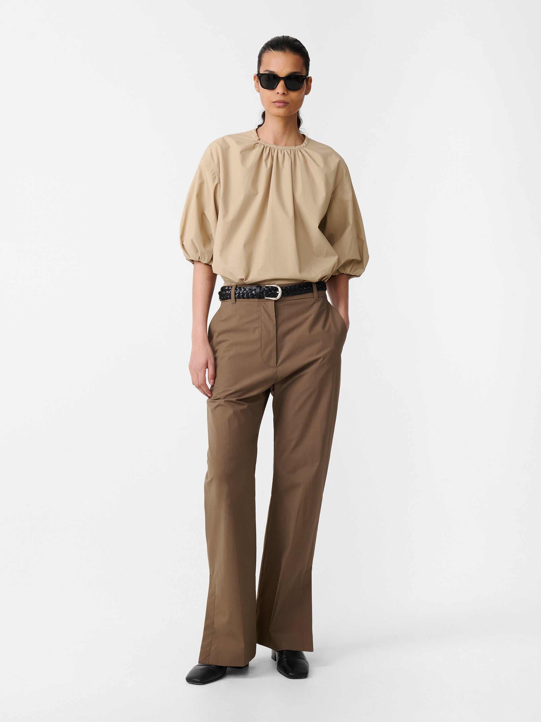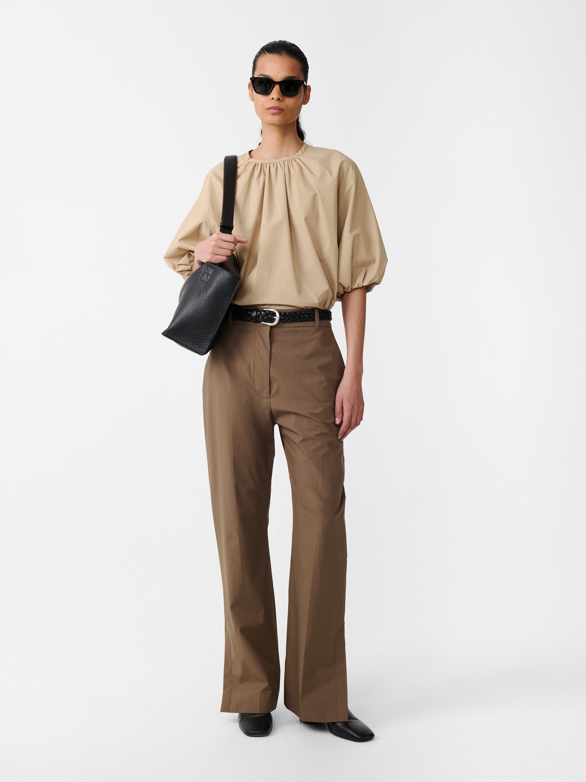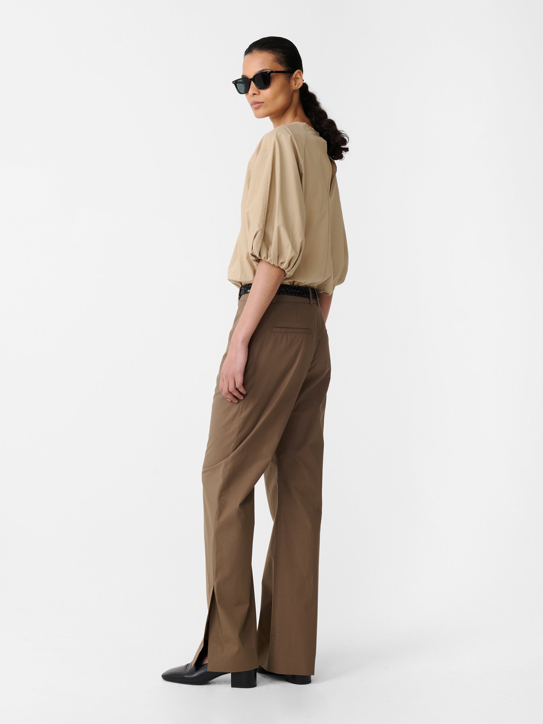 The Mitra pants are a clean and uncomplicated take on a wardrobe staple. They’re shaped to sit mid waist and have a straight leg and a relaxed split hem. Mitra is cut from our noisy cotton: an Italian-milled, lightly coated compact poplin that gives a technical hand feel and a crisp, papery texture that rustles in movement with the body.