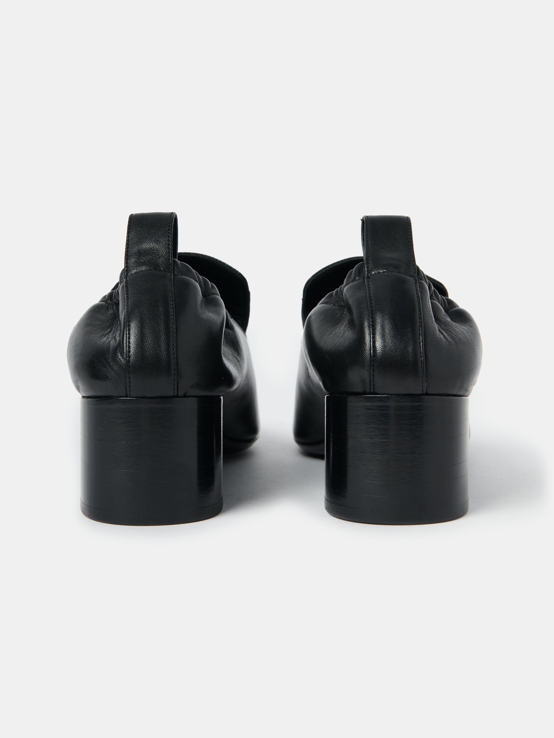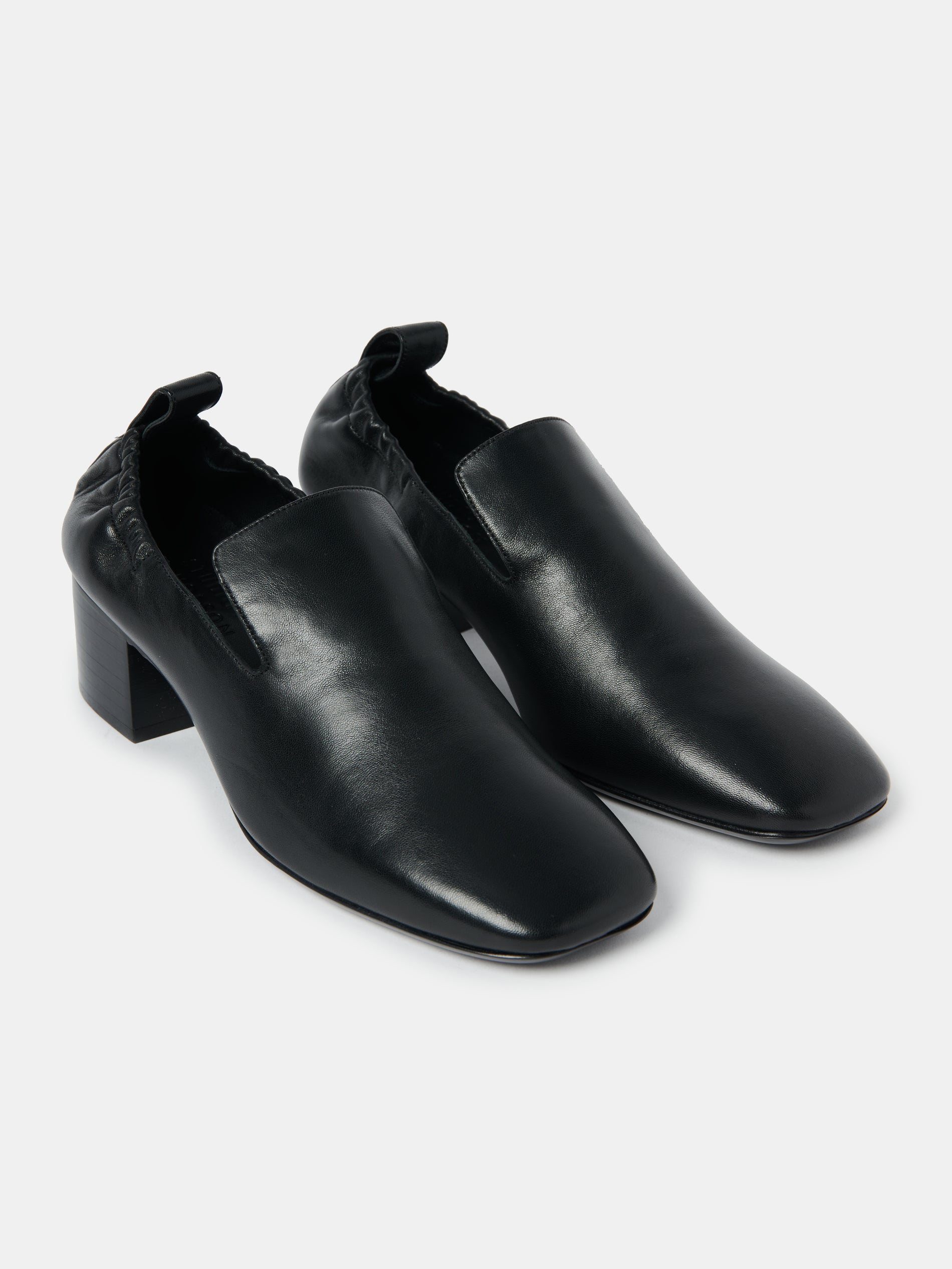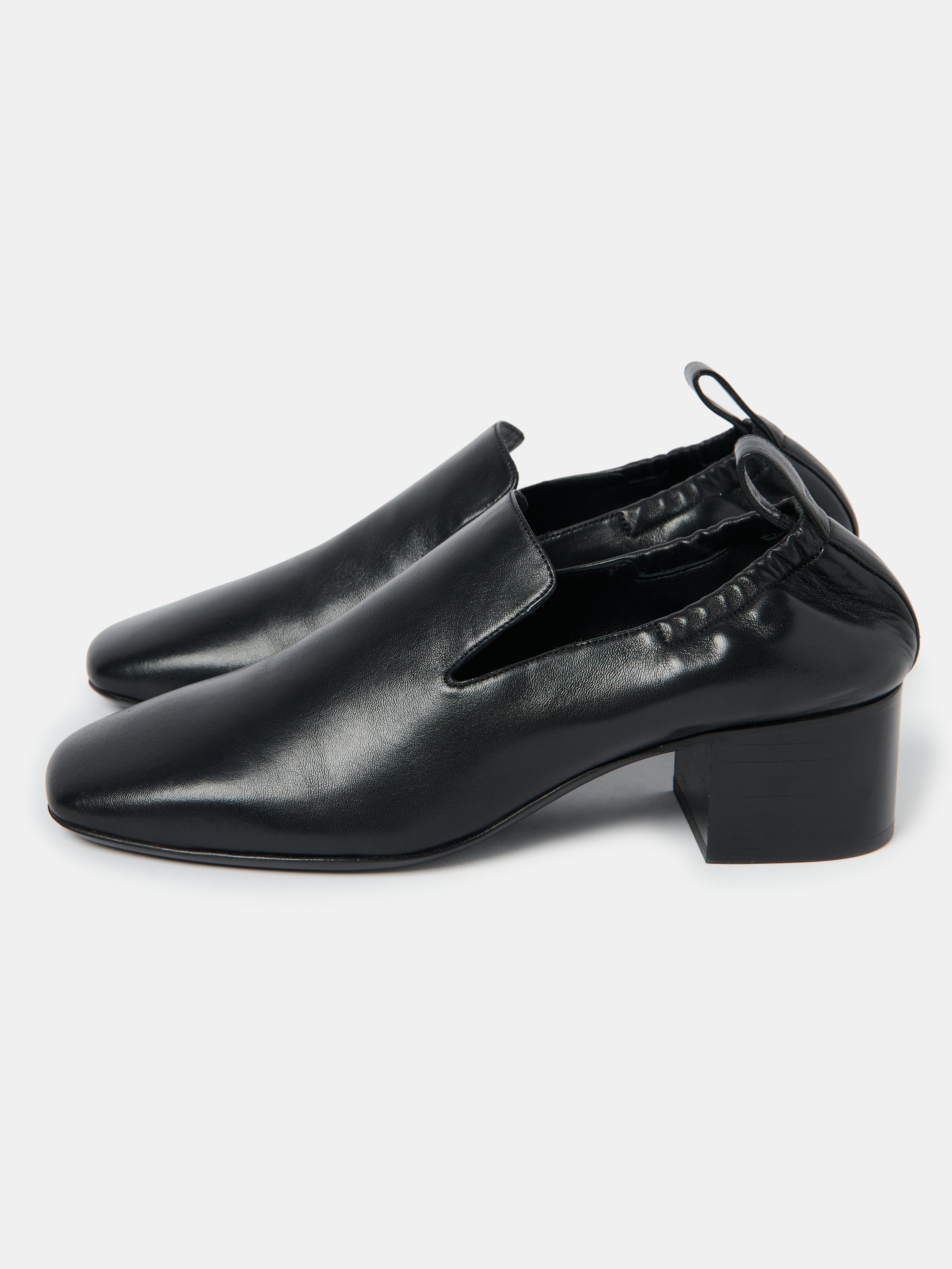 Moon marries baroque design elements with a highly modern sensibility. A narrow last, stacked heel and square toe create sharply defined shape, which is softened by buttery nappa leather and an elasticated heel.