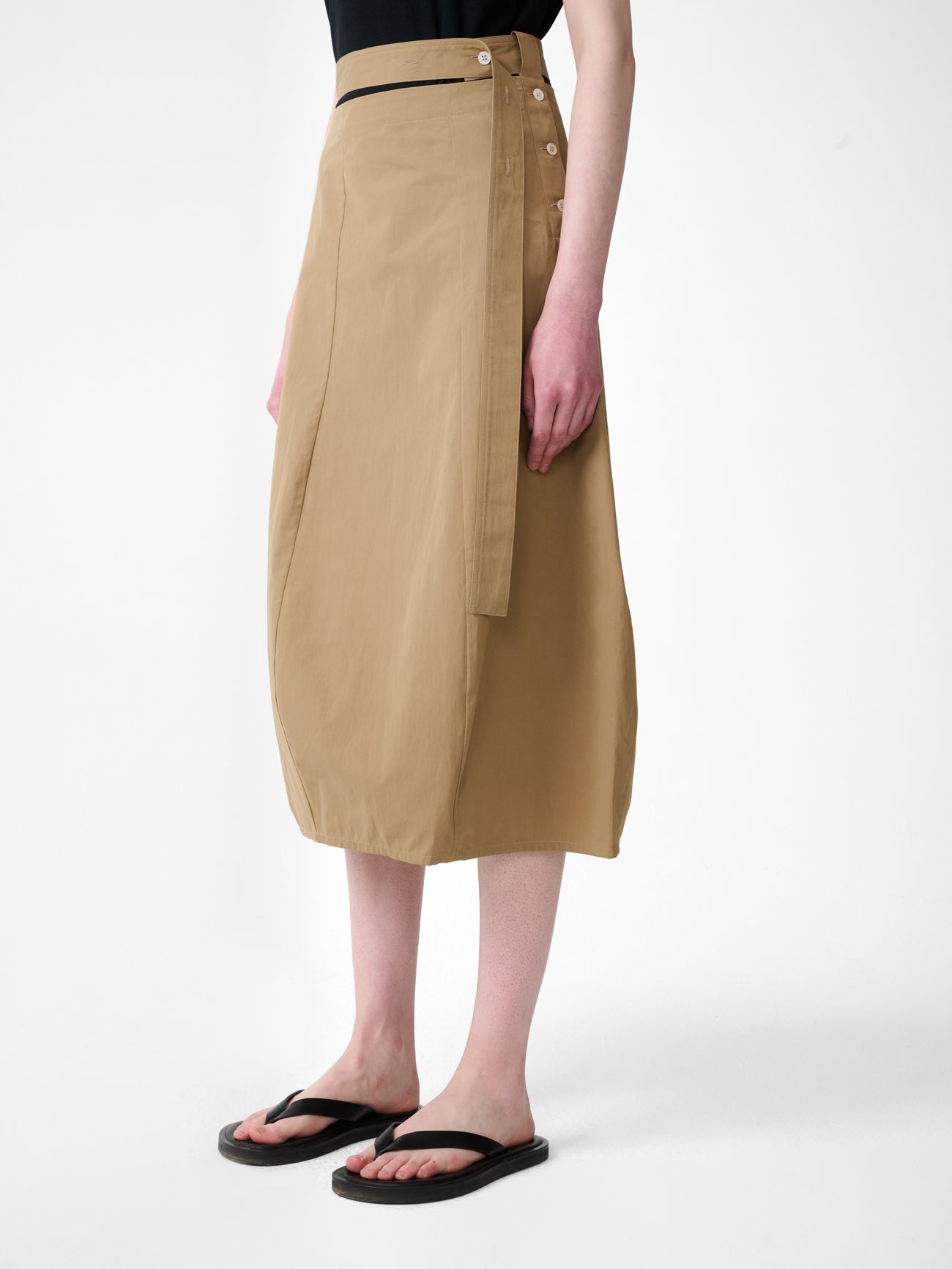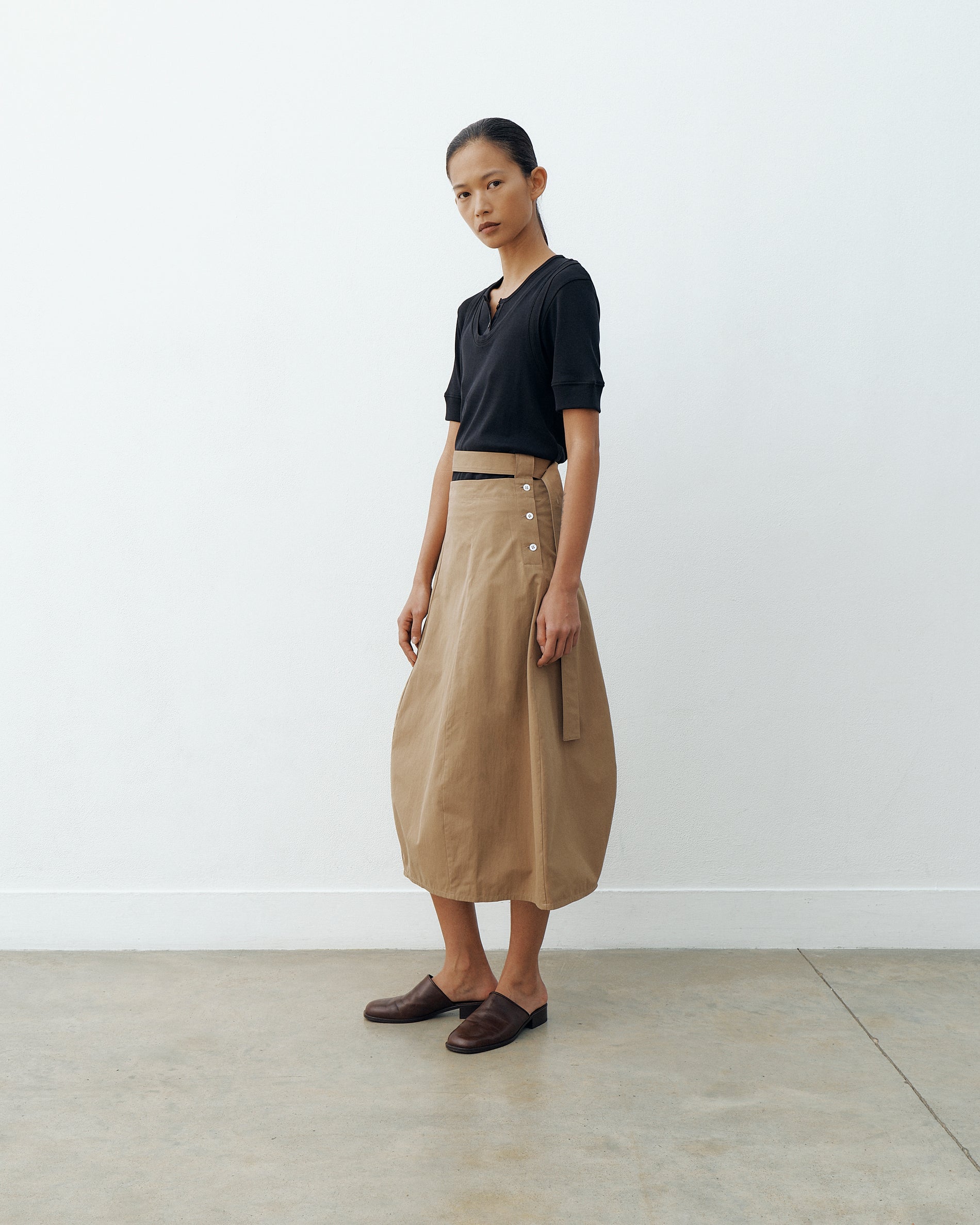 Orcha offers a thoughtful twist on an understated wardrobe pillar: the humble skirt. Constructed with a tie waist, the skirt is deftly cut from panels of our sanded cotton: a breathable, resilient and high-twist woven fabric with a durable structure and a dry, smooth hand feel and deployed here to accentuate the streamlined, easy-to-wear shape.