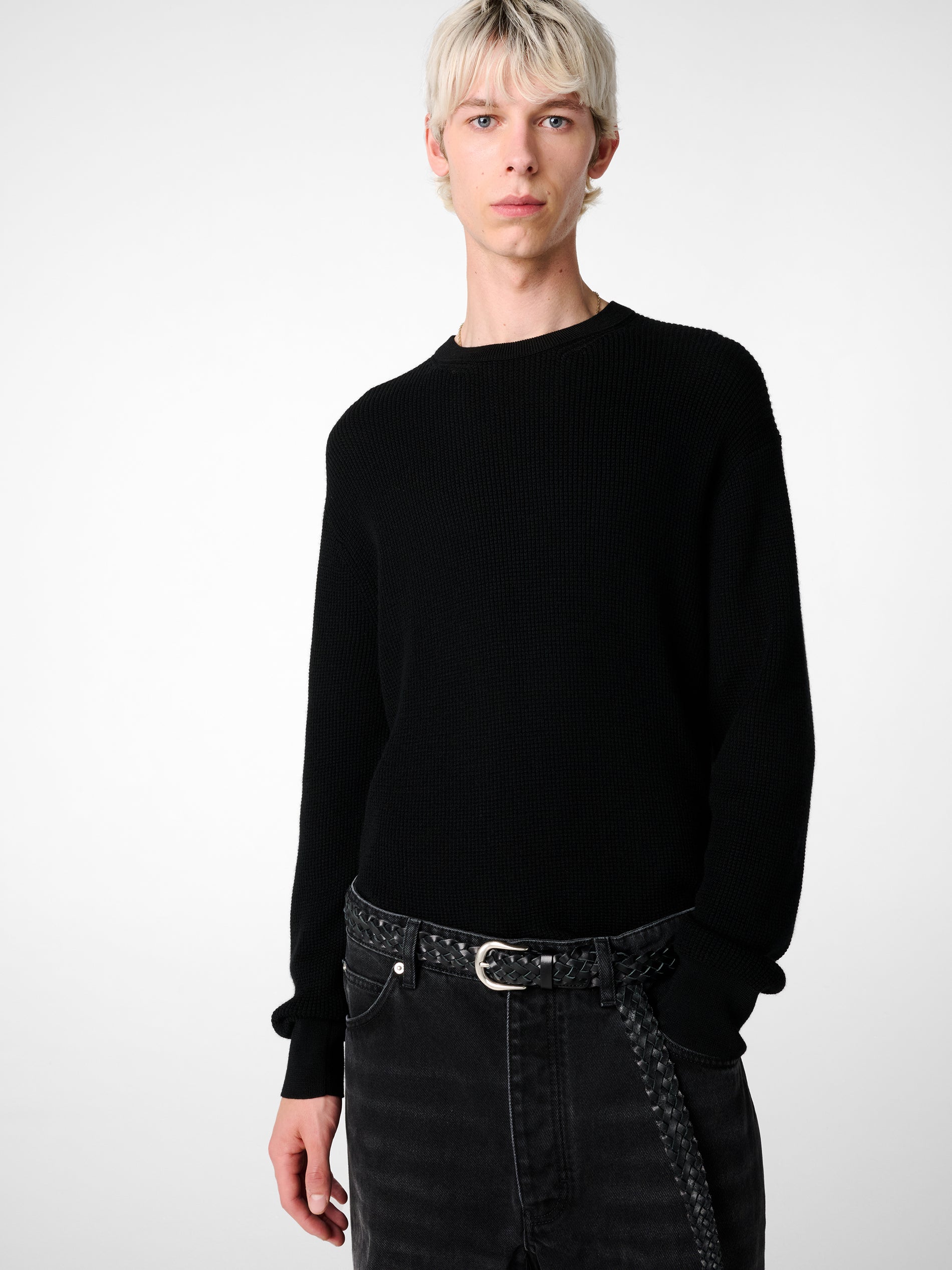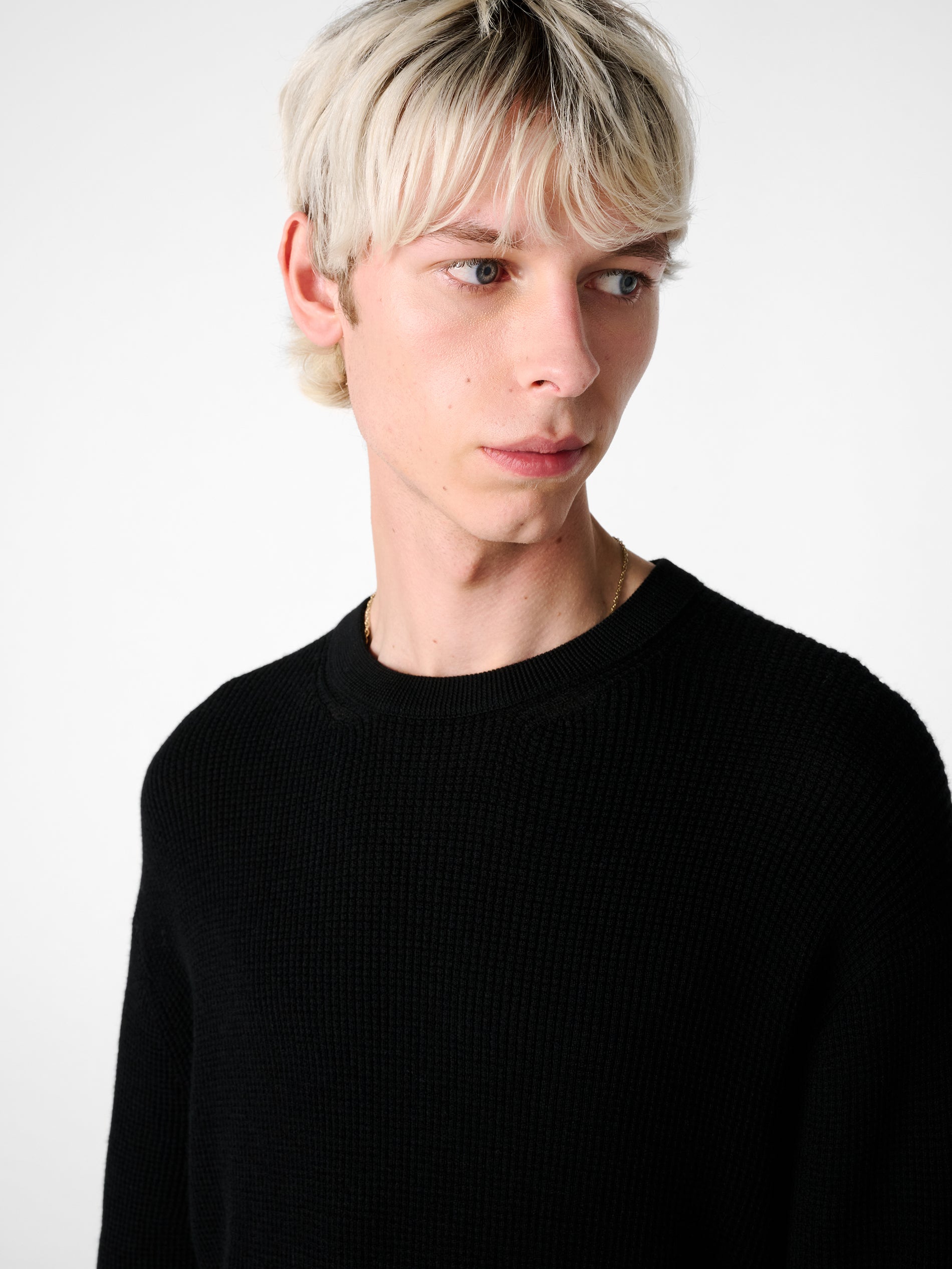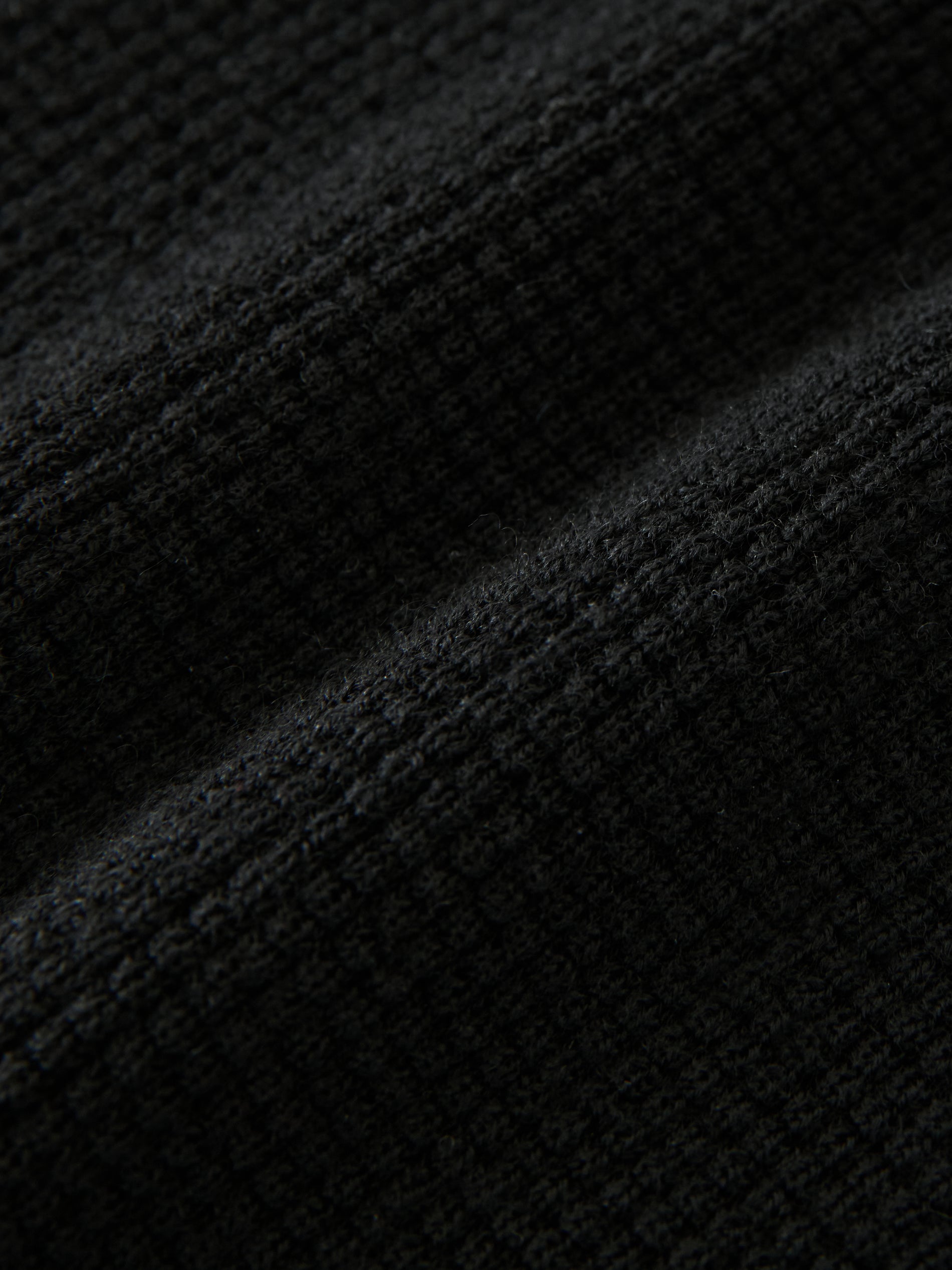 Studio Nicholson’s focus on fabrics is evidenced in the Portland jumper, an autumnal layering staple crafted in collaboration with Aaron Levine. It’s made from cashmere waffle: an Italian-milled blend of merino wool and cashmere that’s waffle-knit to create texture and insulating warmth. Portland has a classic crew neckline and dropped shoulders for a relaxed, low-key feel that’s further enhanced by the fabric choice.