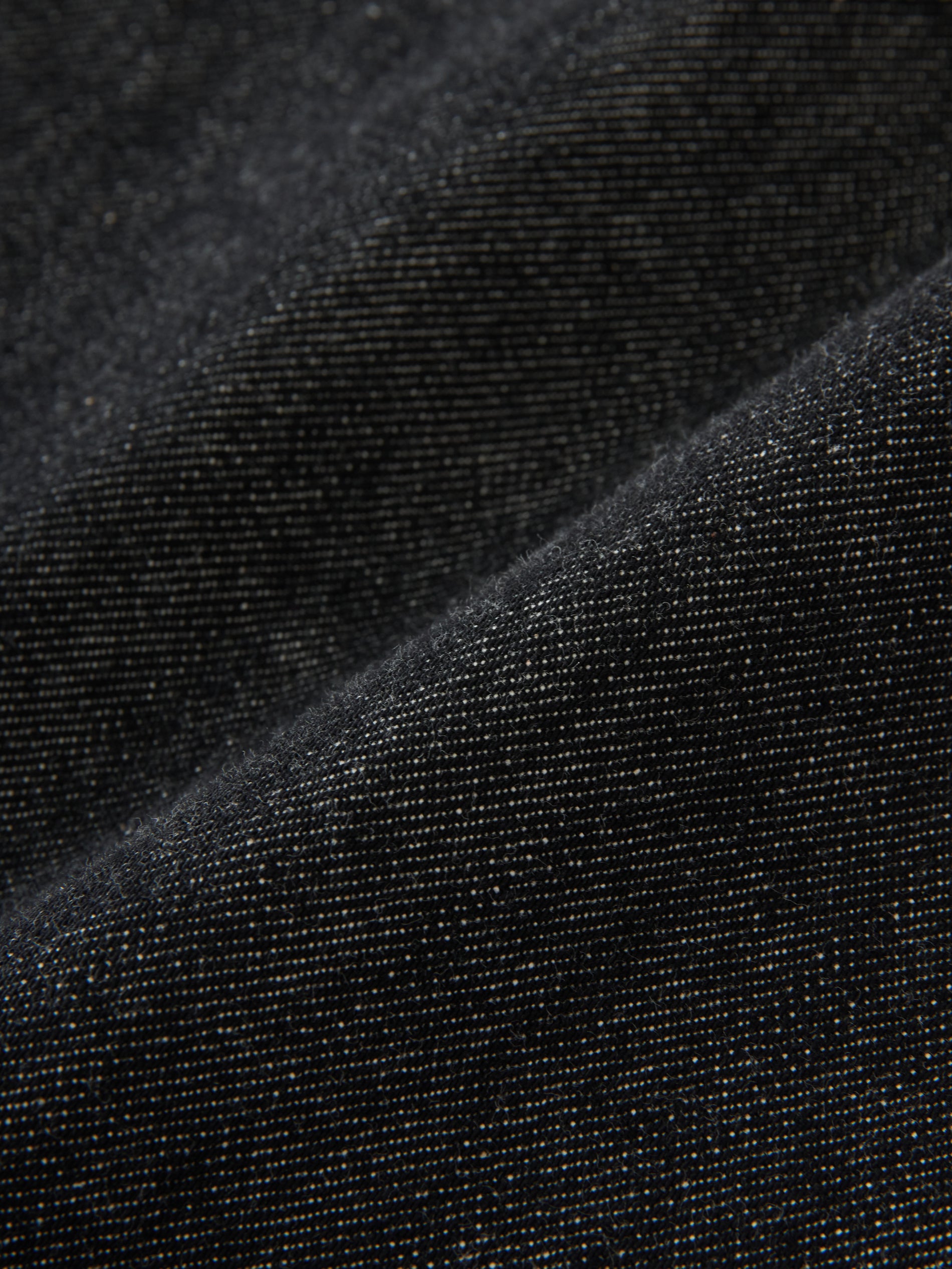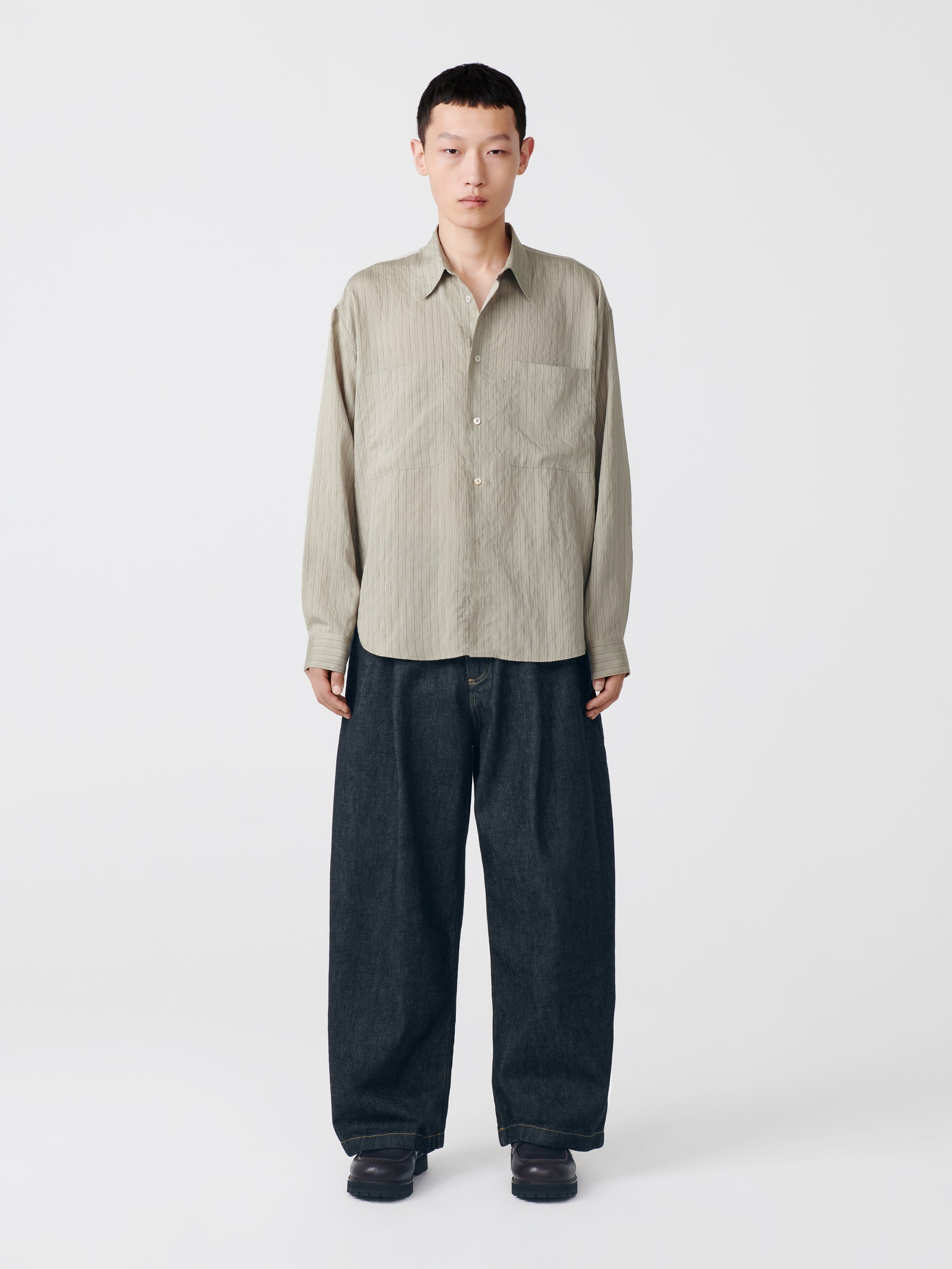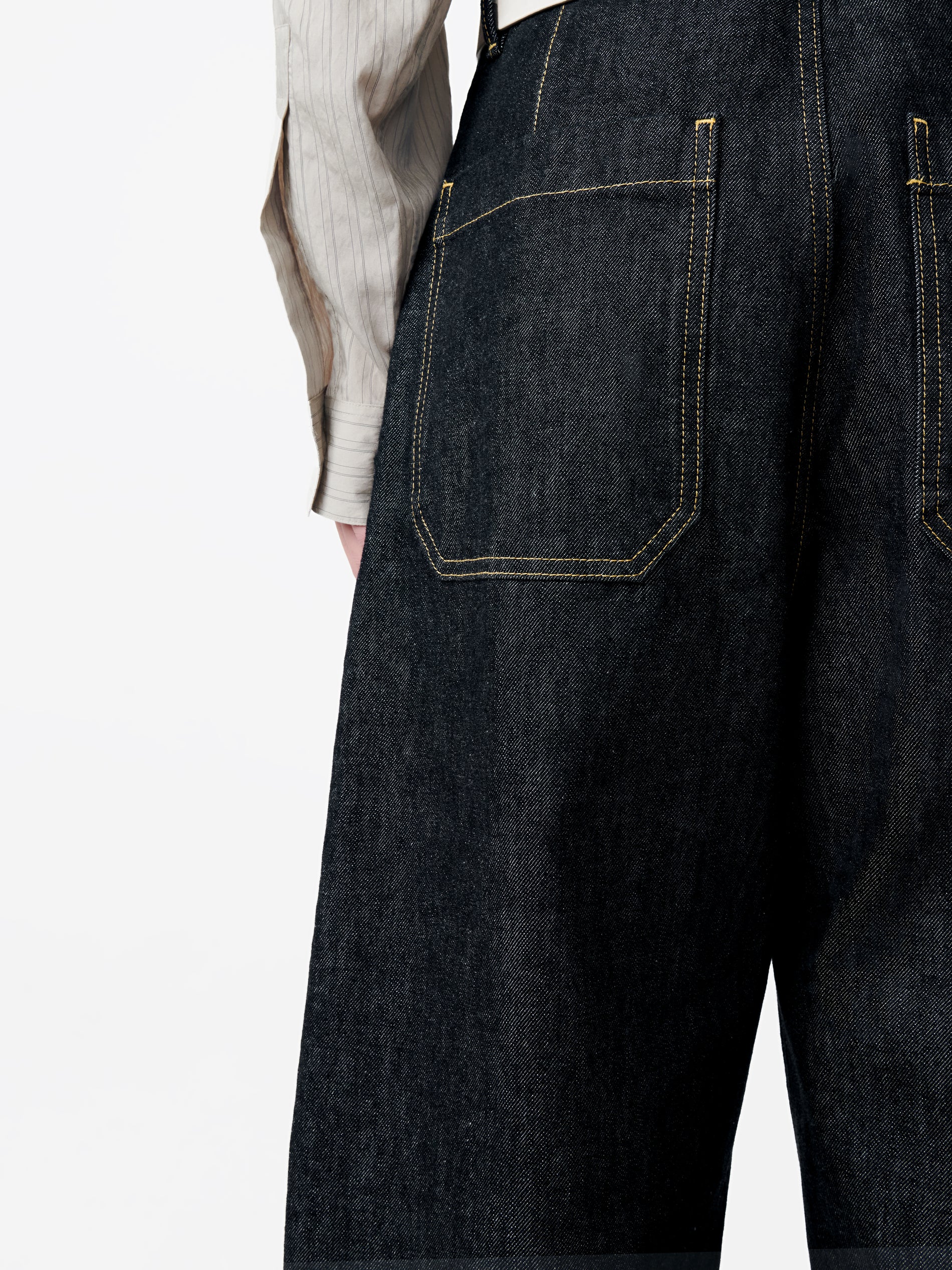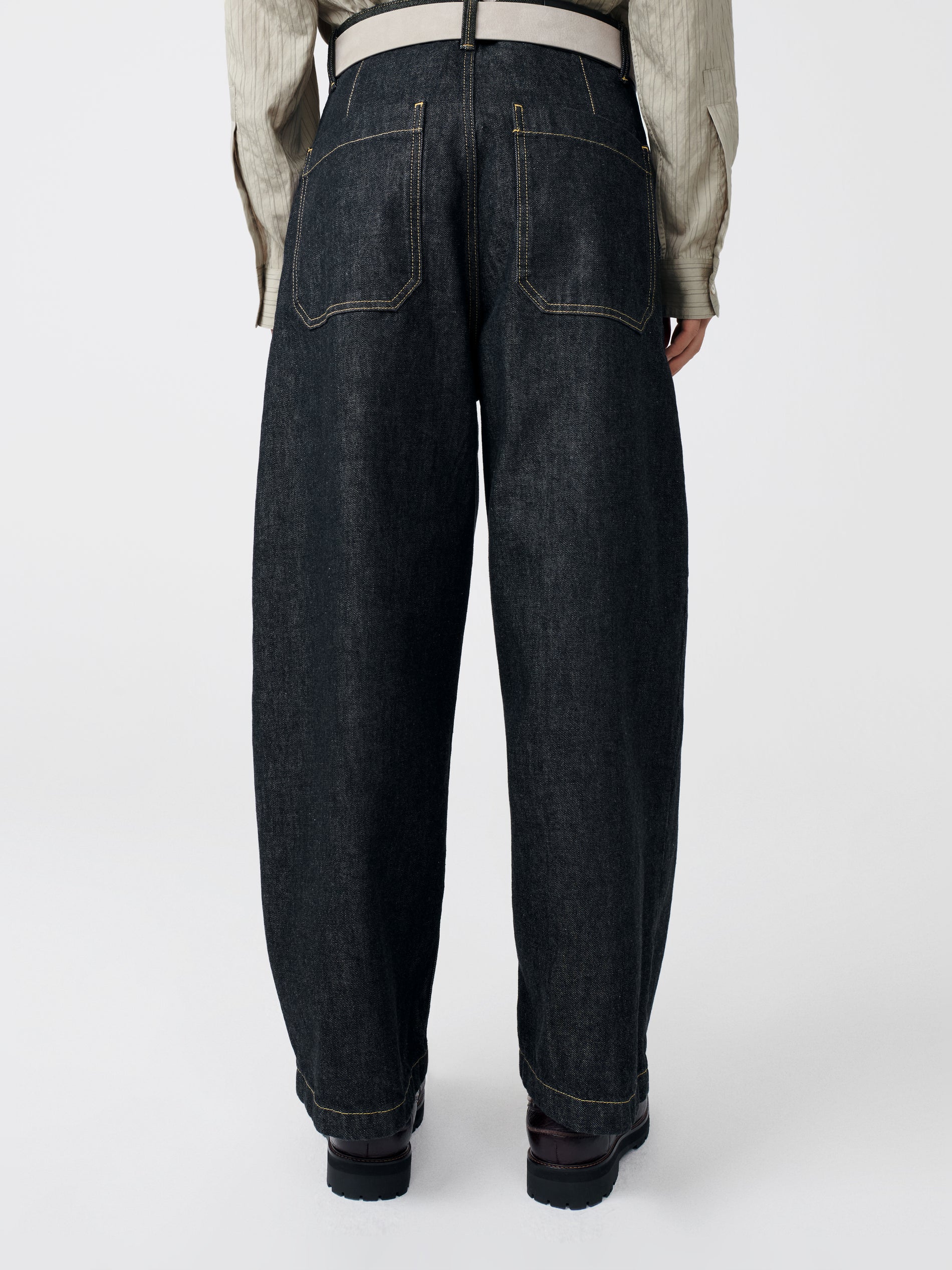 Exaggerated volume and sharp single pleats give the mid-rise Puch pants a bold-yet-dynamic visual effect. They are made in a rigid Italian denim with a strong salt and pepper grain and tobacco thread at the seams. They are full-length with a wide cuff, designed to sit on the shoe with plenty of break.