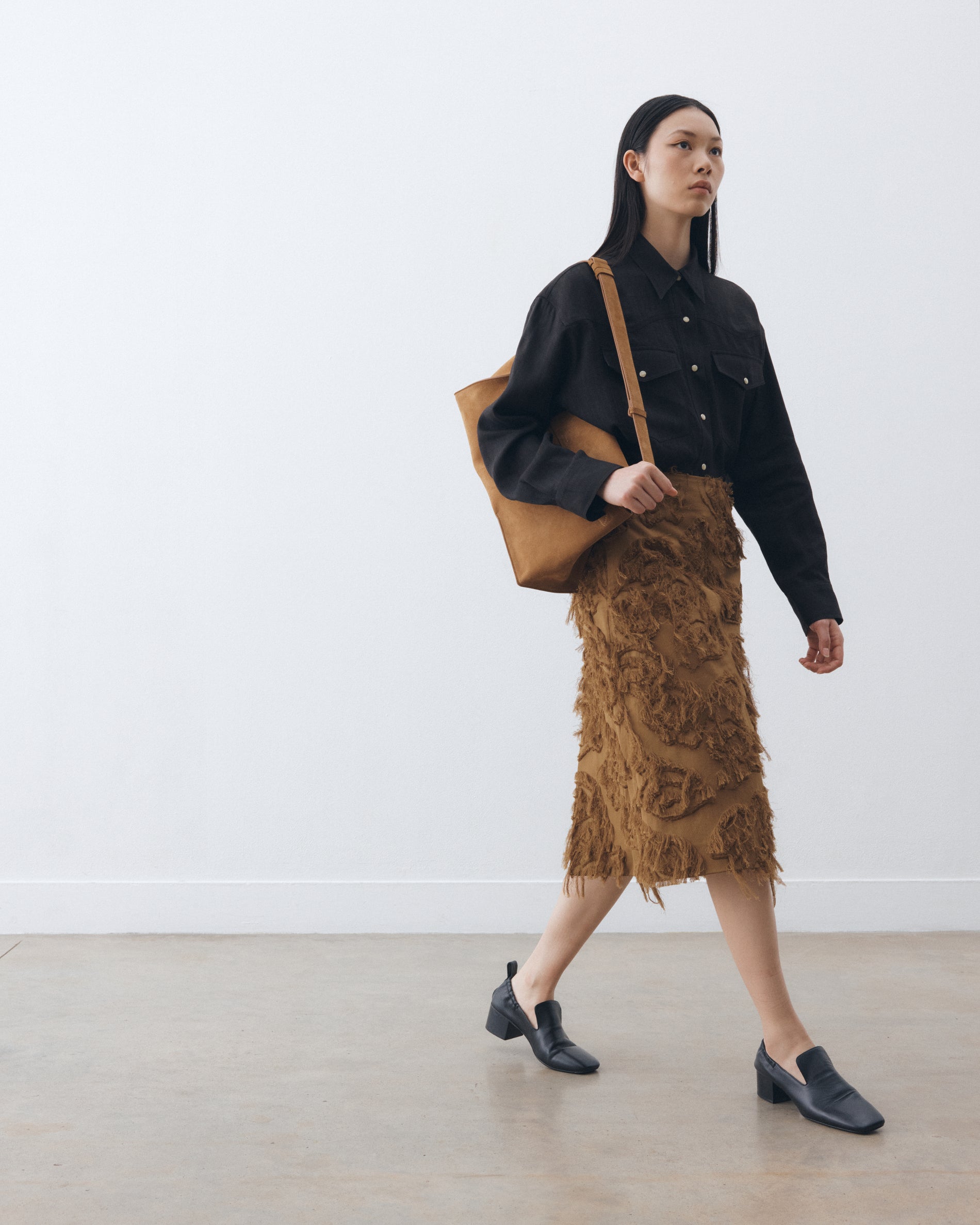 Co-ordinated sets are a key theme of our Spring Summer 26 offering, captured in the Roeper fringe skirt. It’s crafted from our fringe jacquard fabric: a cotton-based fils coupé jacquard that gives a rich, textural hand feel and provides an artful take on the classic A-line silhouette.
