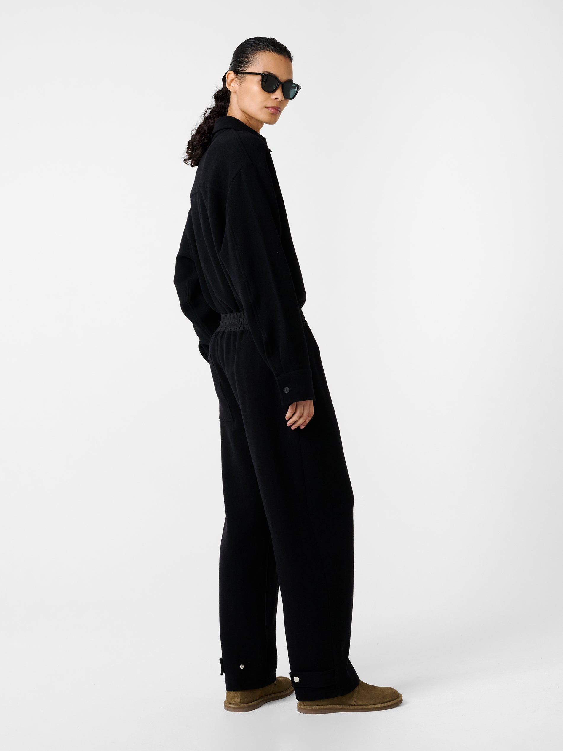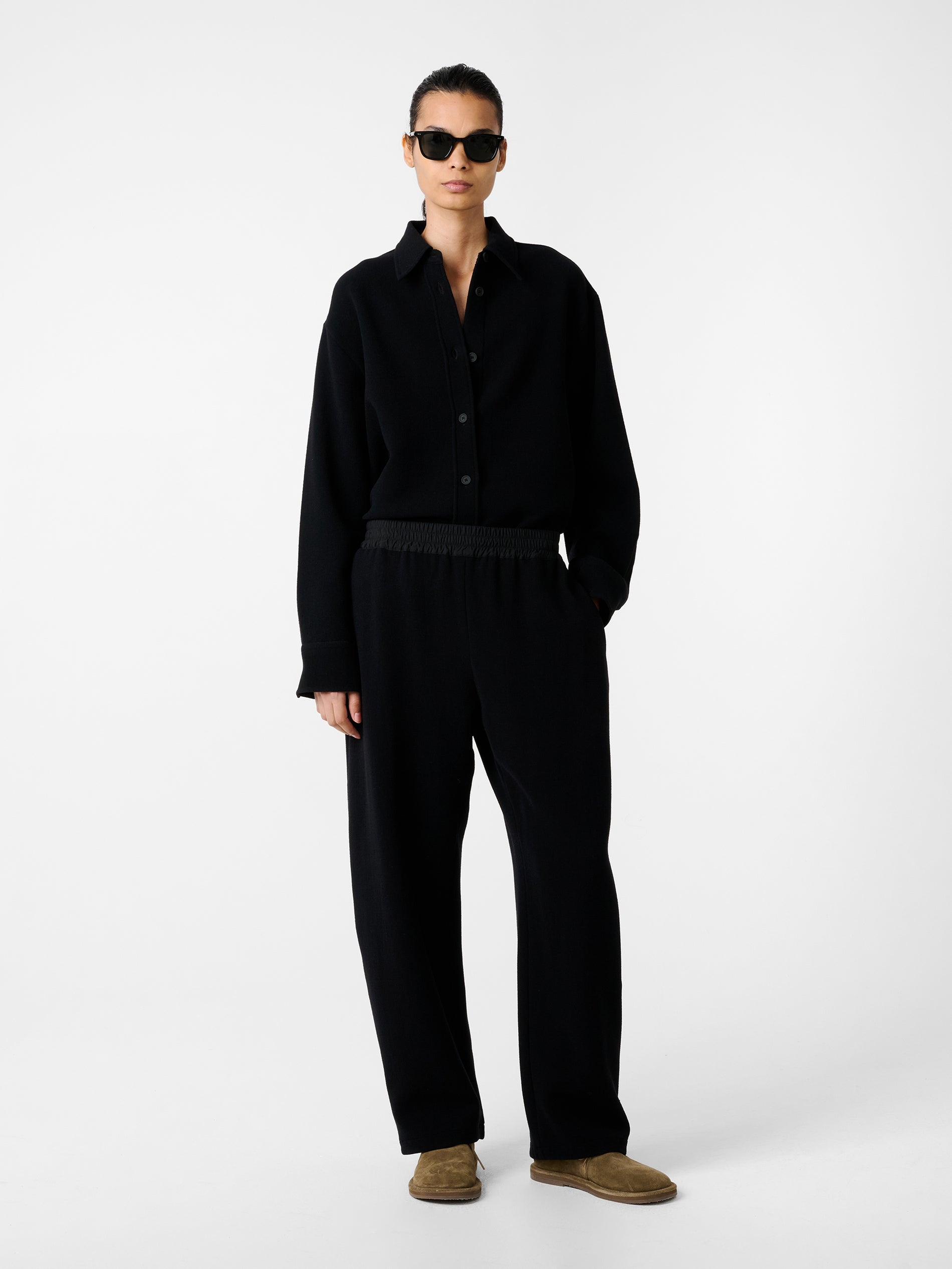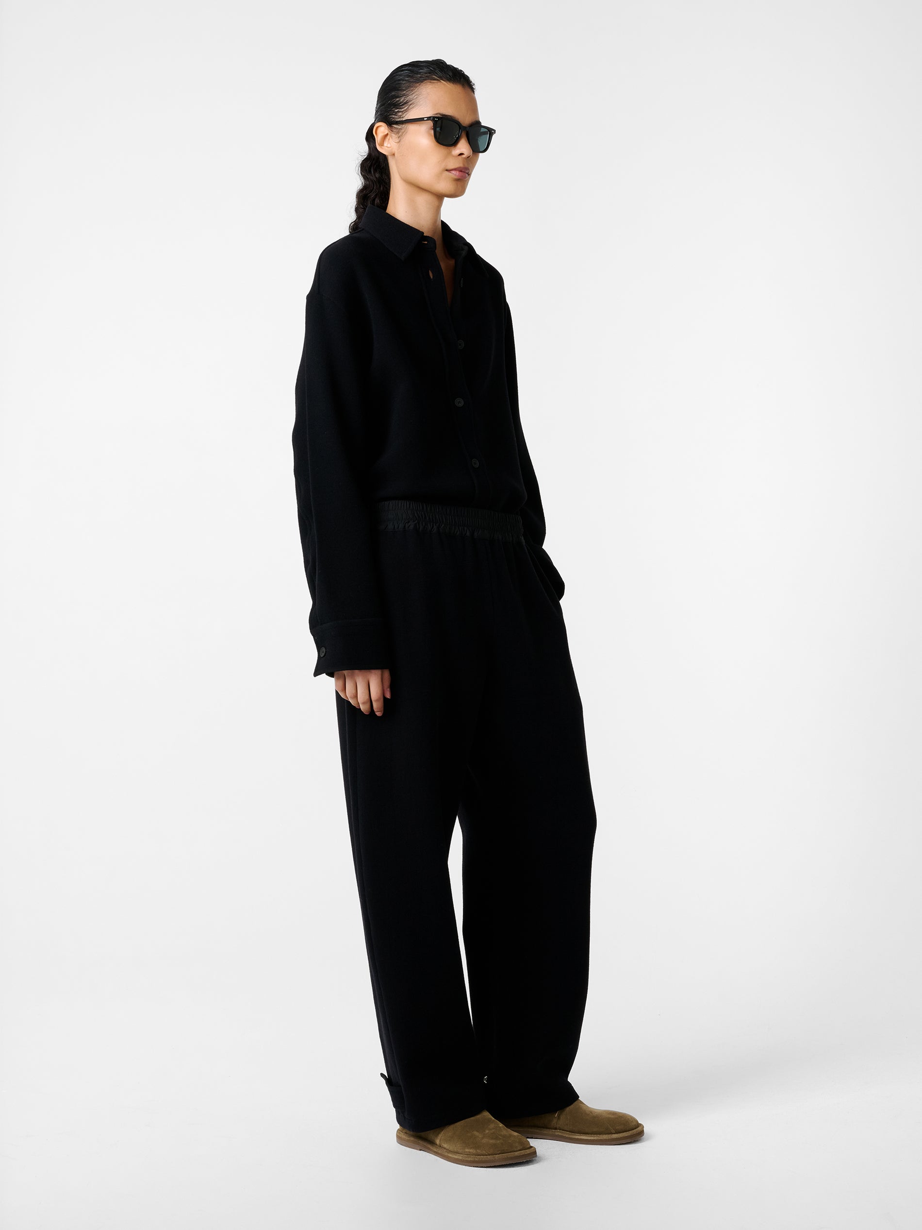 Studio Nicholson’s contemporary approach to modern shirt-making is evident in Santini. Taking its cues from the classic overshirt silhouette, it’s constructed with a smart point collar and a straight hem. Santini is made from our Italian-milled double wool sable fabric - a double-woven wool selected for its spongy texture and comfortable stretch, which sits easy on the frame.