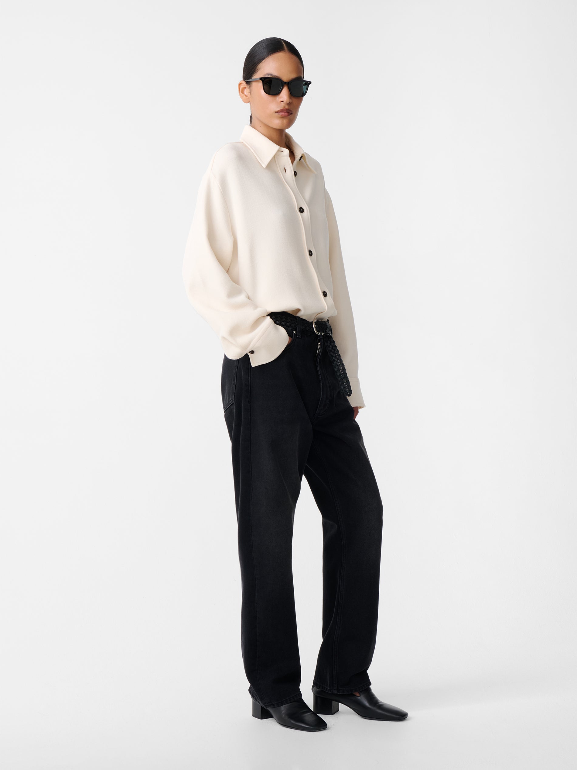 Studio Nicholson’s contemporary approach to modern shirt-making is evident in Santini. Taking its cues from the classic overshirt silhouette, it’s constructed with a smart point collar and a straight hem. Santini is made from our Italian-milled double wool sable fabric - a double-woven wool selected for its spongy texture and comfortable stretch, which sits easy on the frame.