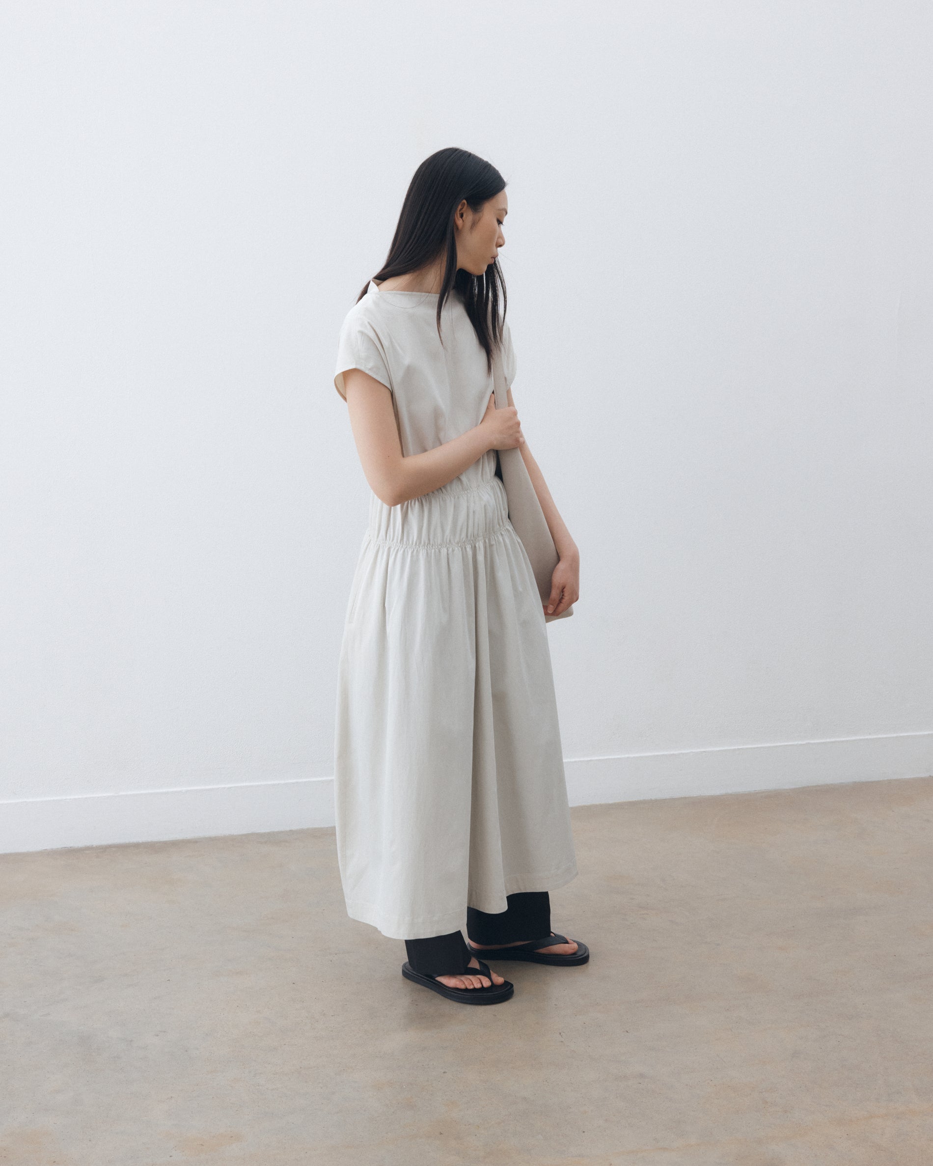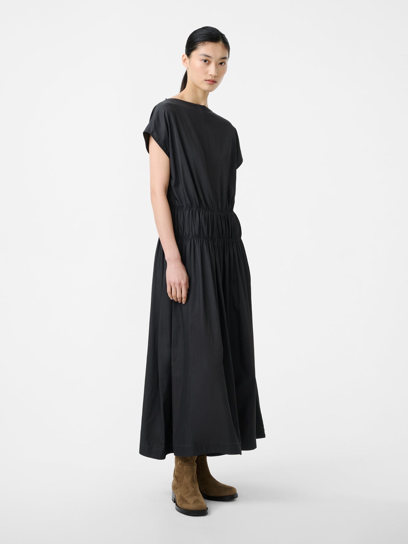 Studio Nicholson’s ‘fabric first’ philosophy is exemplified by this Simos black dress. It’s cut from our enzyme viscose: an Italian-milled, cotton-viscose twill noted for its smooth, lustrous hand feel. The dress is fitted with an elasticated waist and a back vent that work in harmony with the fabric choice to further accentuate the relaxed, fluid silhouette.