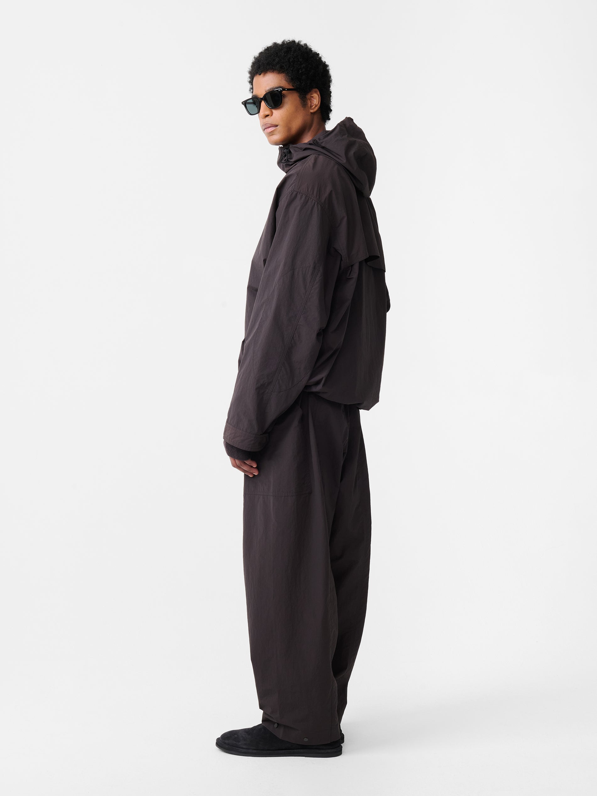 A modern play on the classic anorak silhouette, the Timon jacket embodies Studio Nicholson’s balance of form and function. It’s cut from a technical nylon and cotton blend chosen for its pleasingly crisp handle and practical showerproof finish. The jacket is made with an adjustable drawcord hood and hem, a concealed two-way zip front and a rear storm shield for increased comfort and ventilation.