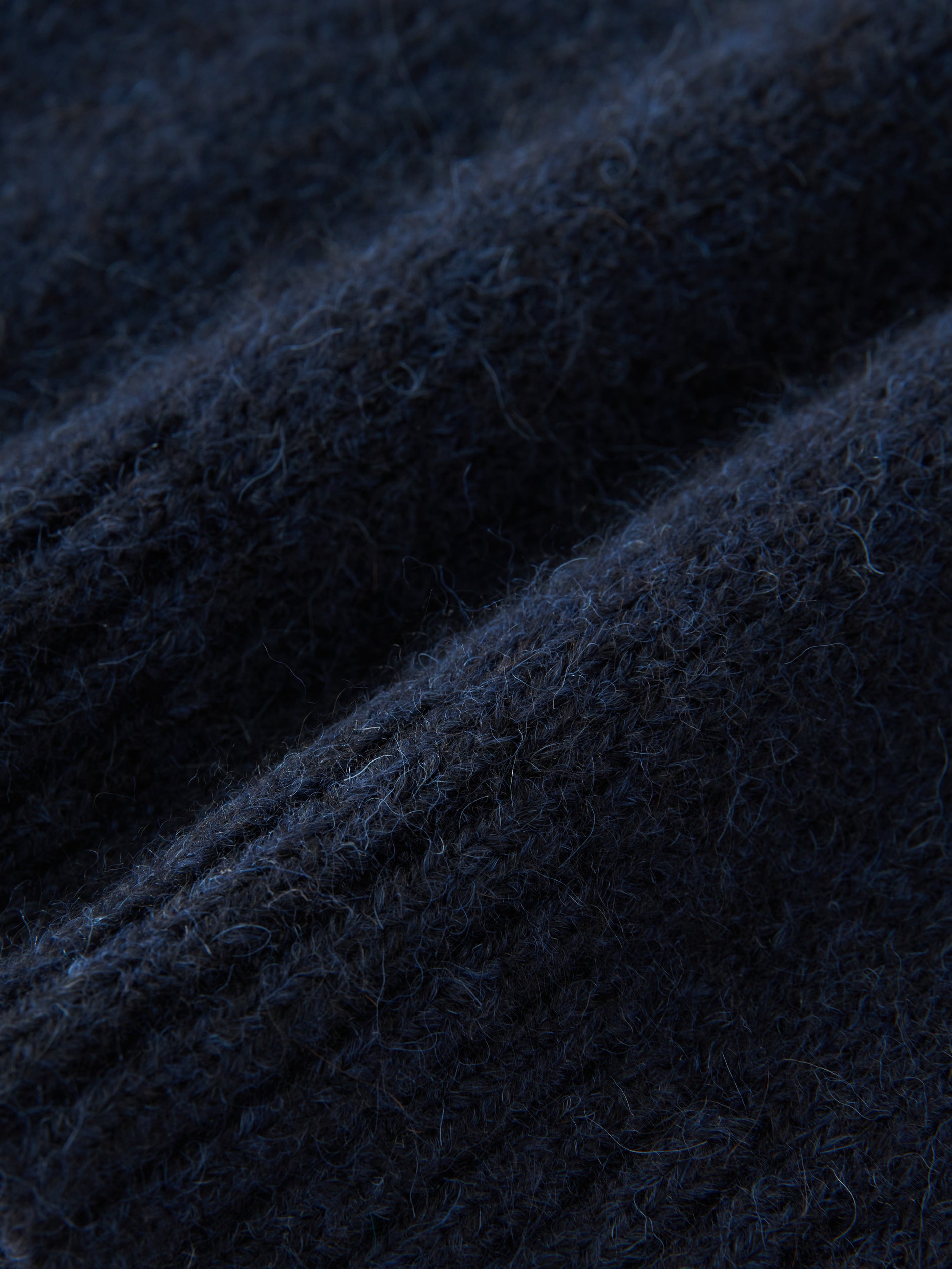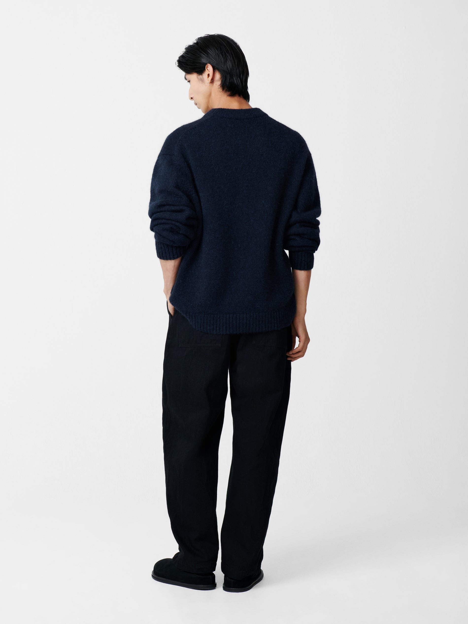 This Vico jumper is imagined in a ‘Darkest Navy’, conjuring warm hues of the Swedish coast, which was the backdrop for our Winter ‘24 collection. It’s cut from a blend of alpaca and merino that has an exceptionally soft hand feel and brushed-like texture. Channel the voluminous proportions by tucking it into wide-leg trousers and chunky leather brogues.