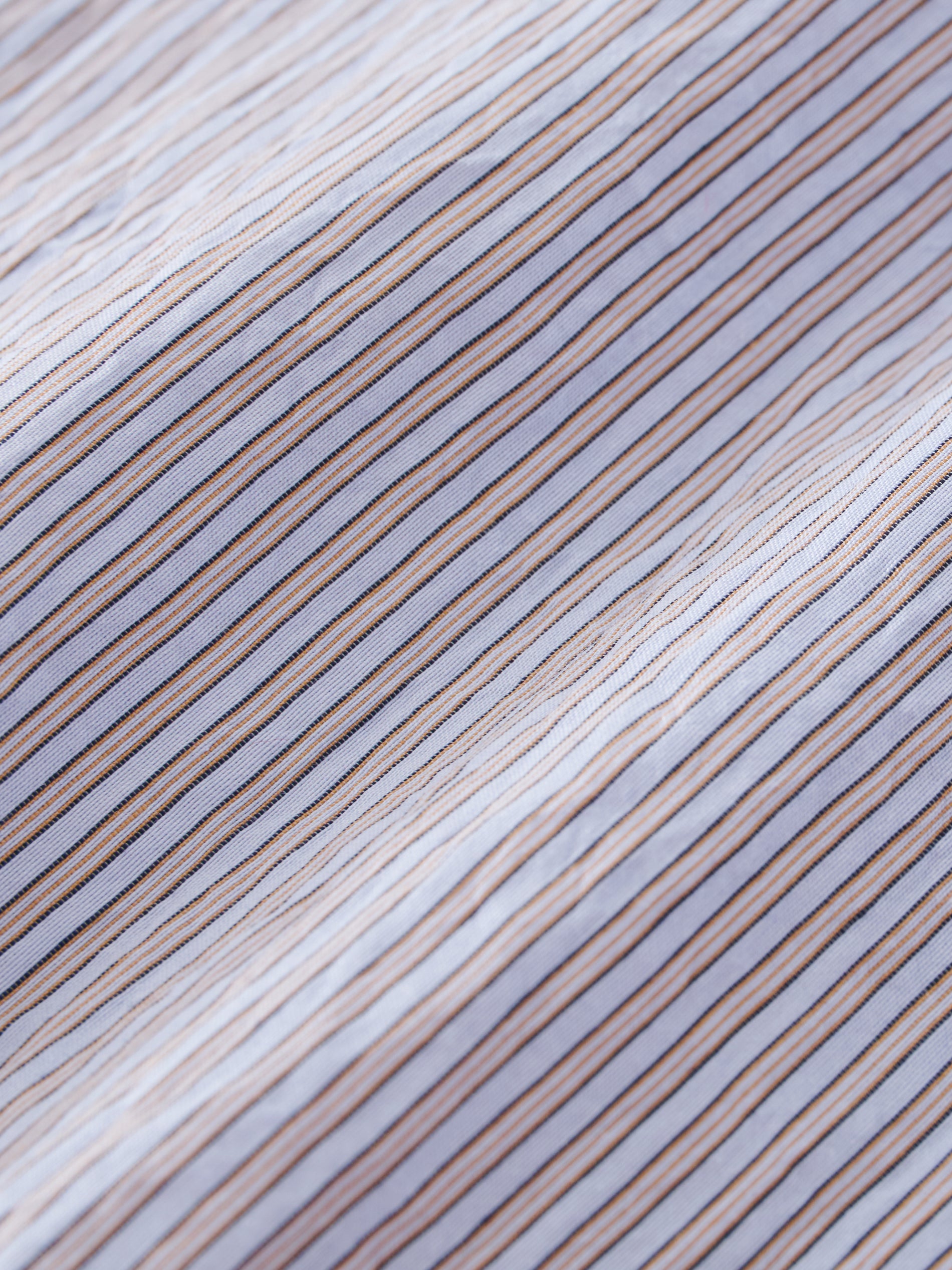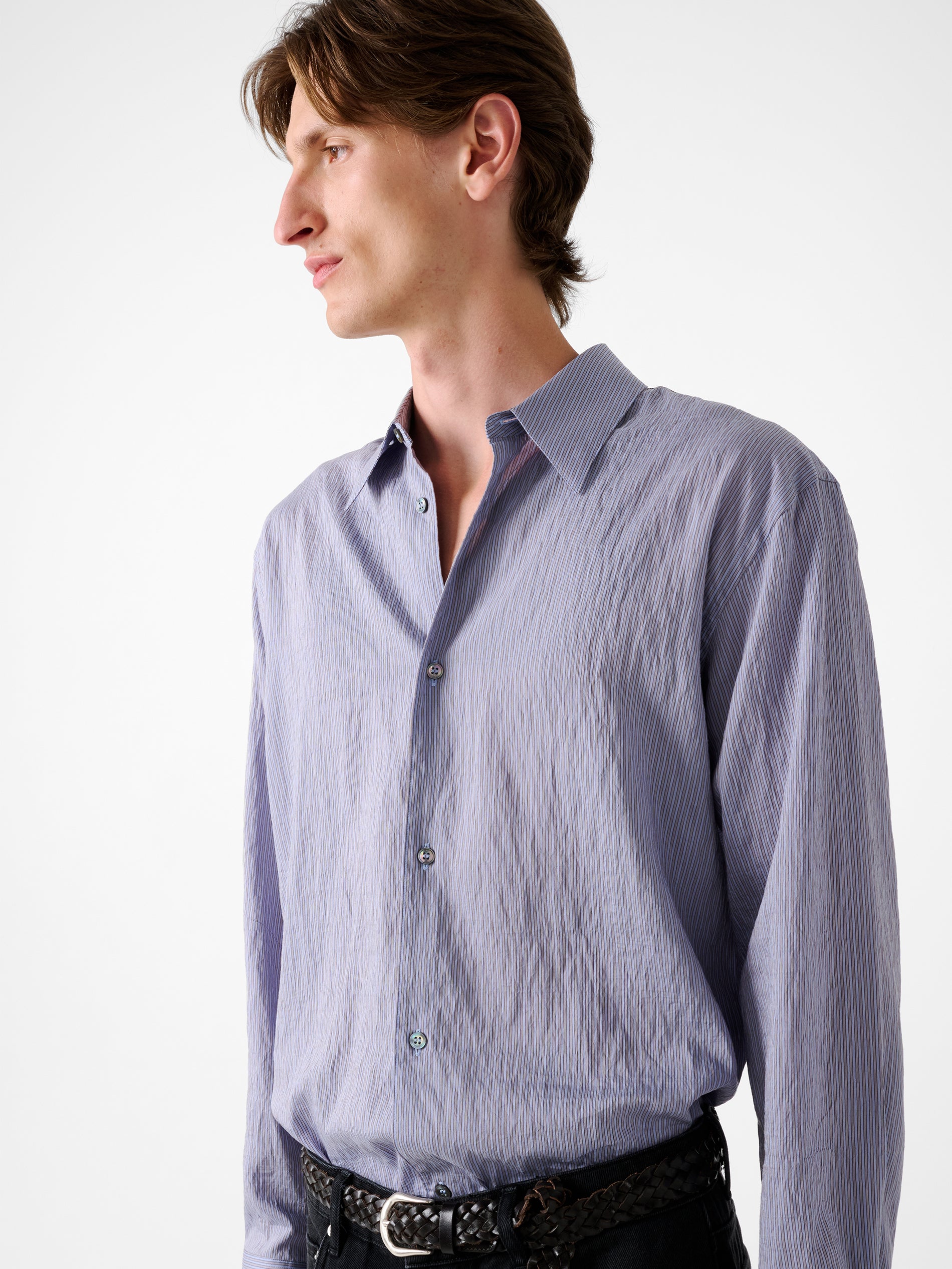 Cut from our Italian-milled, Pencil Stripe Lyocell fabric noted for its drapey handle, this season’s iteration of the View Shirt is a playful revision of classic men’s styles: tailored, but without the stiffness of a formal shirt. It has a generous, slightly boxy fit which stops short of being truly oversized. Its collar and cuffs have a soft construction, giving them a casual feel.